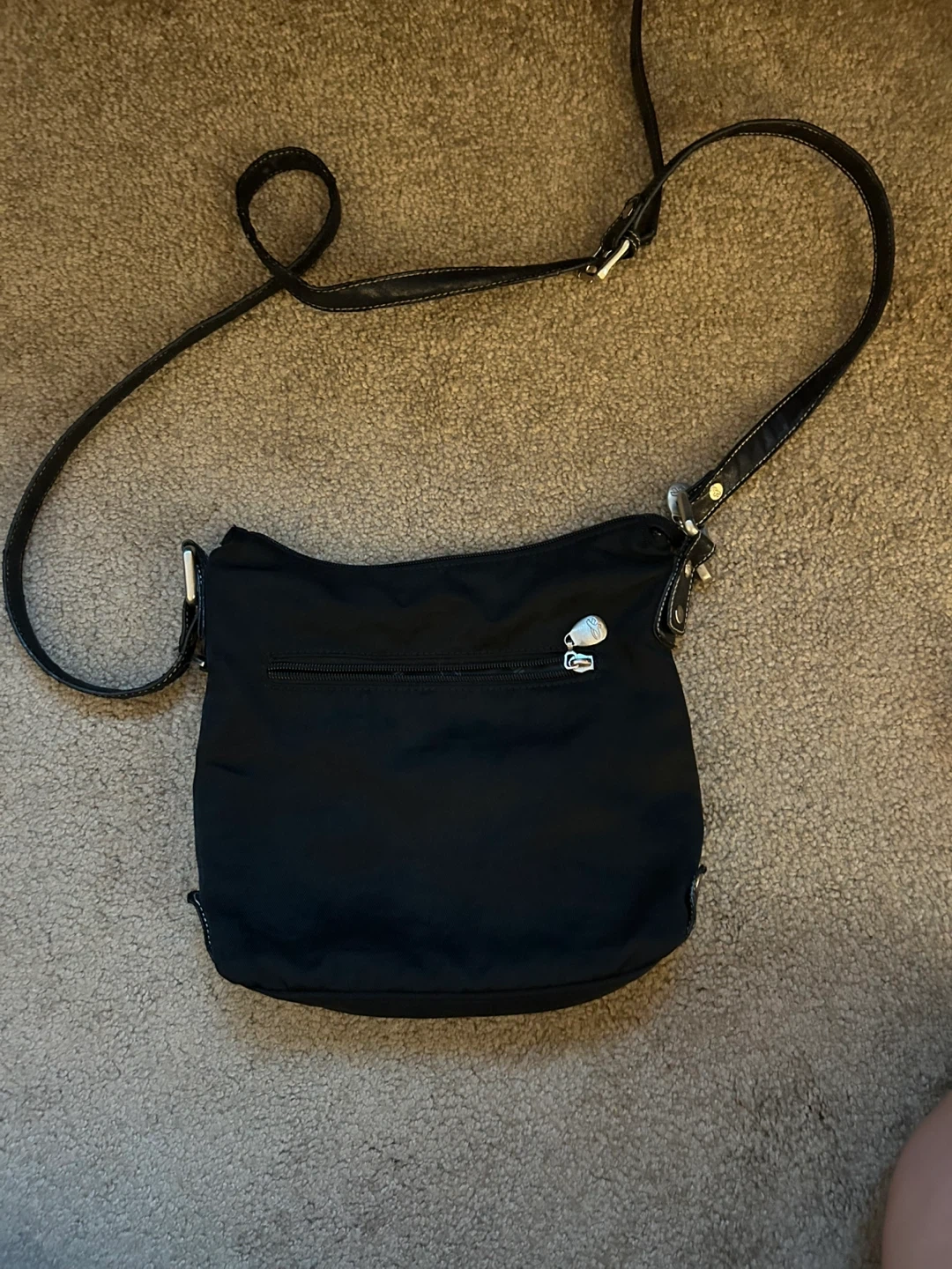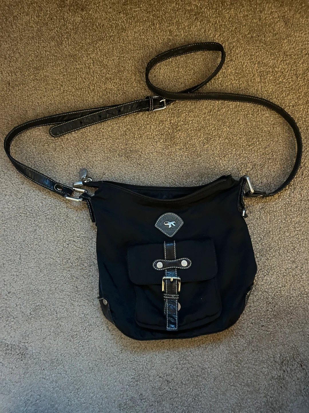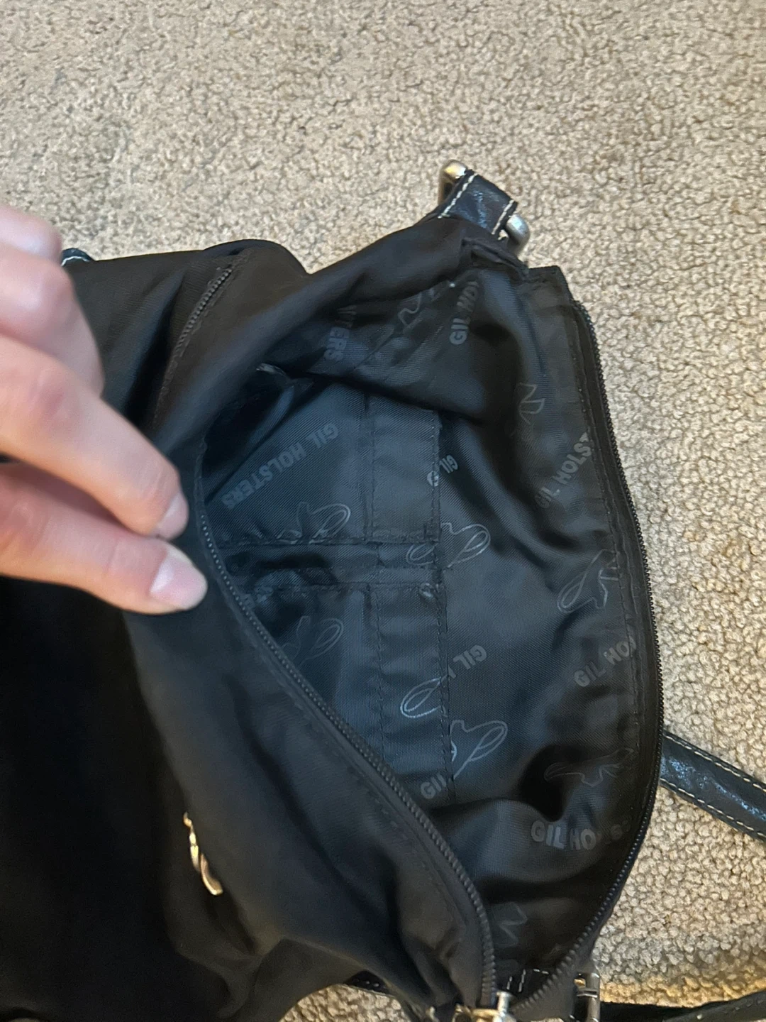 60This is a Gil Holsters crossbody bag in black. It's in great condition and ready for a new home! The bag features a convenient crossbody strap, a zippered interior pocket, and a front pocket with a buckle closure. The interior lining has the Gil Holsters logo printed throughout