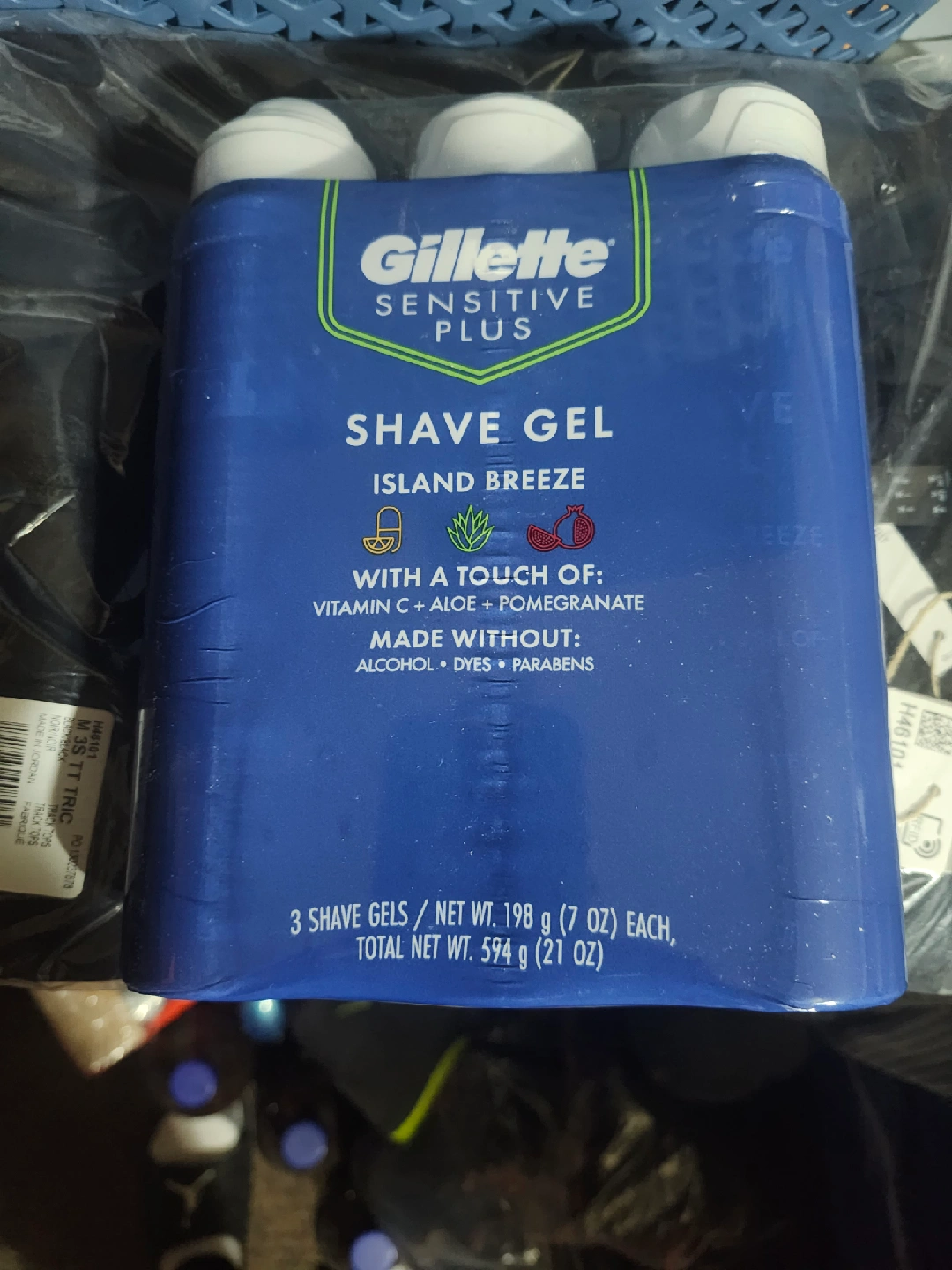 I'm selling a 3-pack of Gillette Sensitive Plus Shave Gel in the Island Breeze scent. Each bottle contains 7 oz (198g), with a total net weight of 21 oz (594g). This shave gel is made with vitamin C, aloe, and pomegranate, and without alcohol, dyes, and parabens