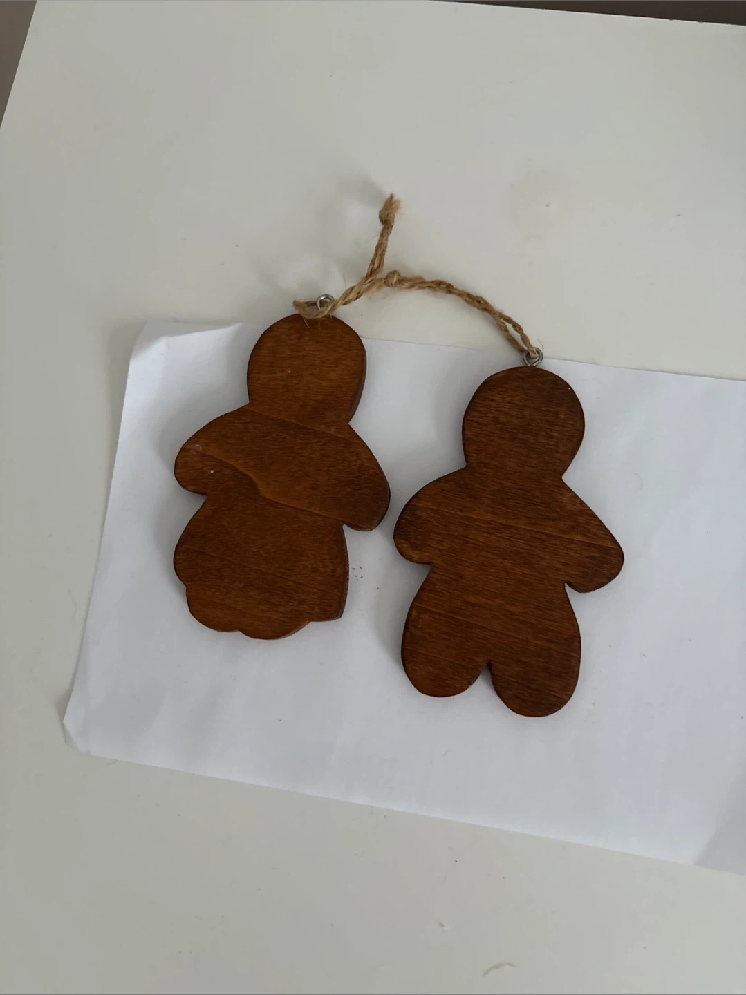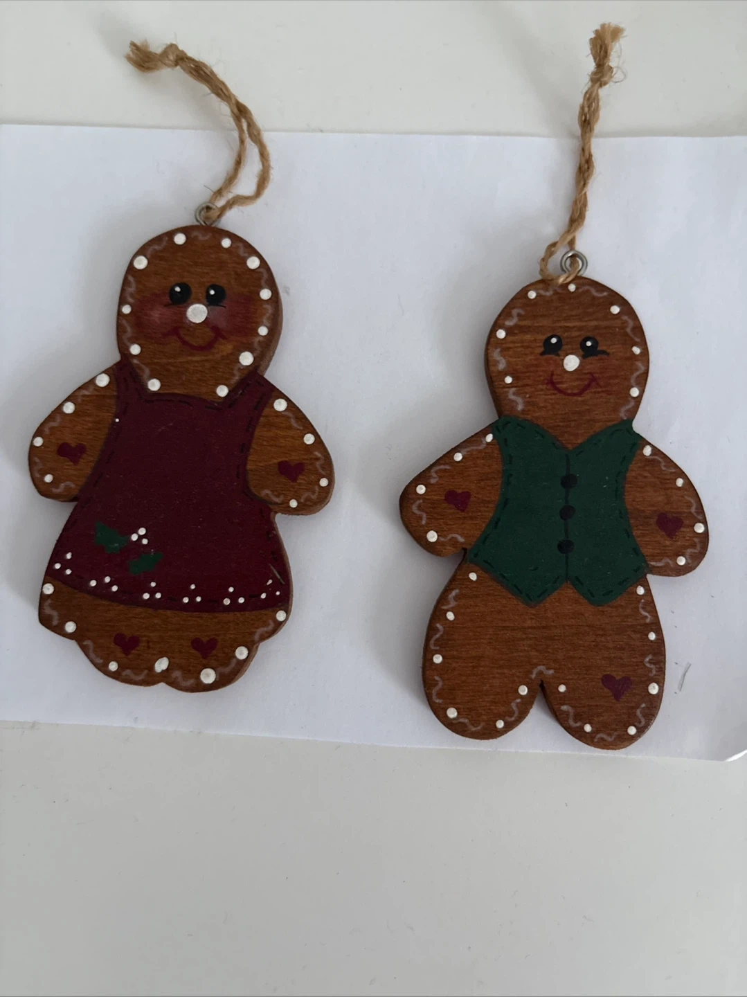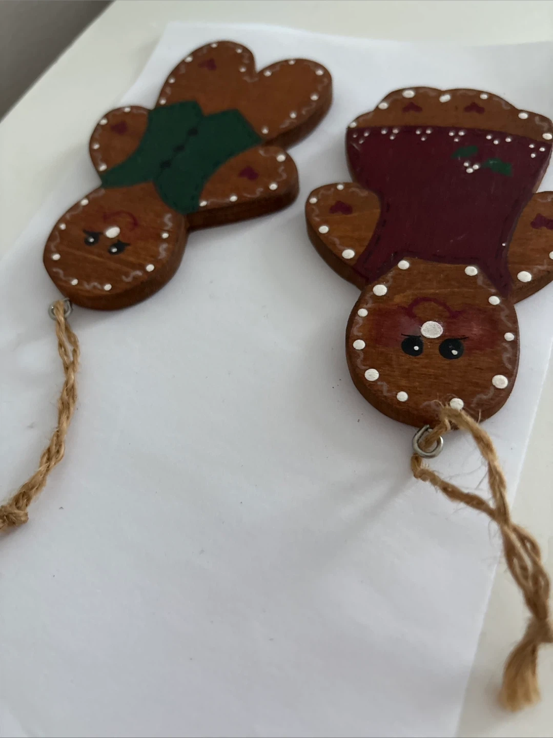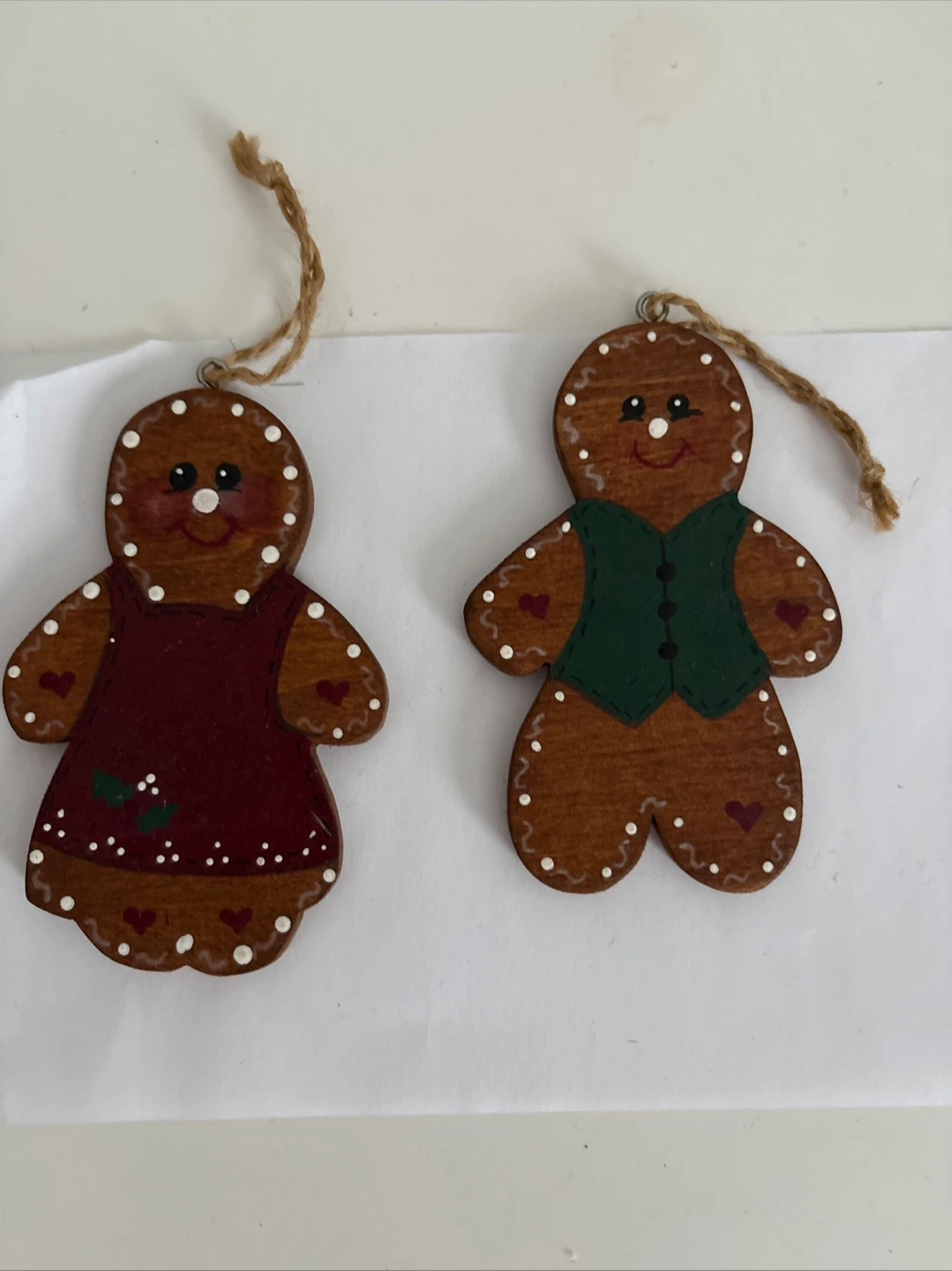 15I'm selling a set of two adorable gingerbread ornaments! One is a gingerbread man with a green vest, and the other is a gingerbread woman with a red dress. They're perfect for adding a touch of holiday cheer to your Christmas tree or holiday decor