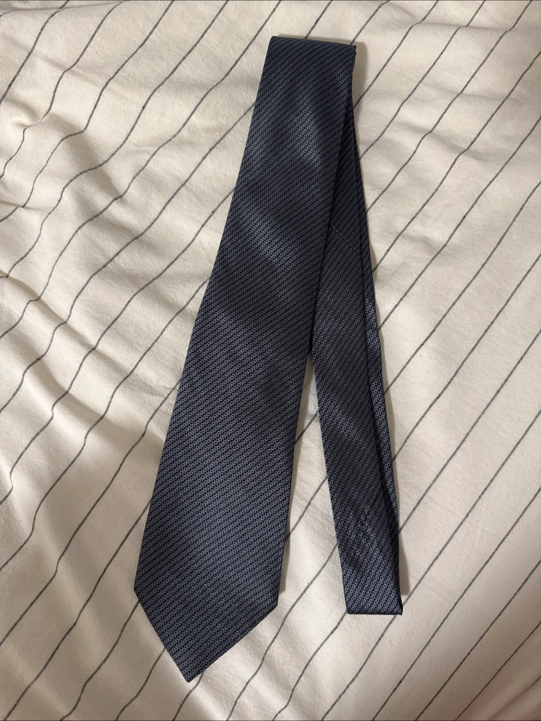 A patterned tie in a dark color. It appears to be made of a smooth material. This tie would be perfect for a professional event or just to feel put together.