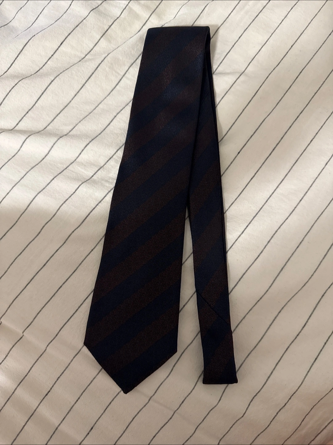 The tie has a striped pattern. It is dark blue and brown. It is perfect for important meetings.