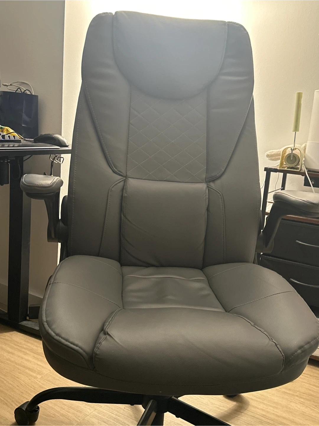 Pick-up only! In Hudson Yards. High-back executive office chair in dark gray. Features a cushioned seat and backrest for comfortable everyday use, with a sturdy base and smooth-rolling wheels.
