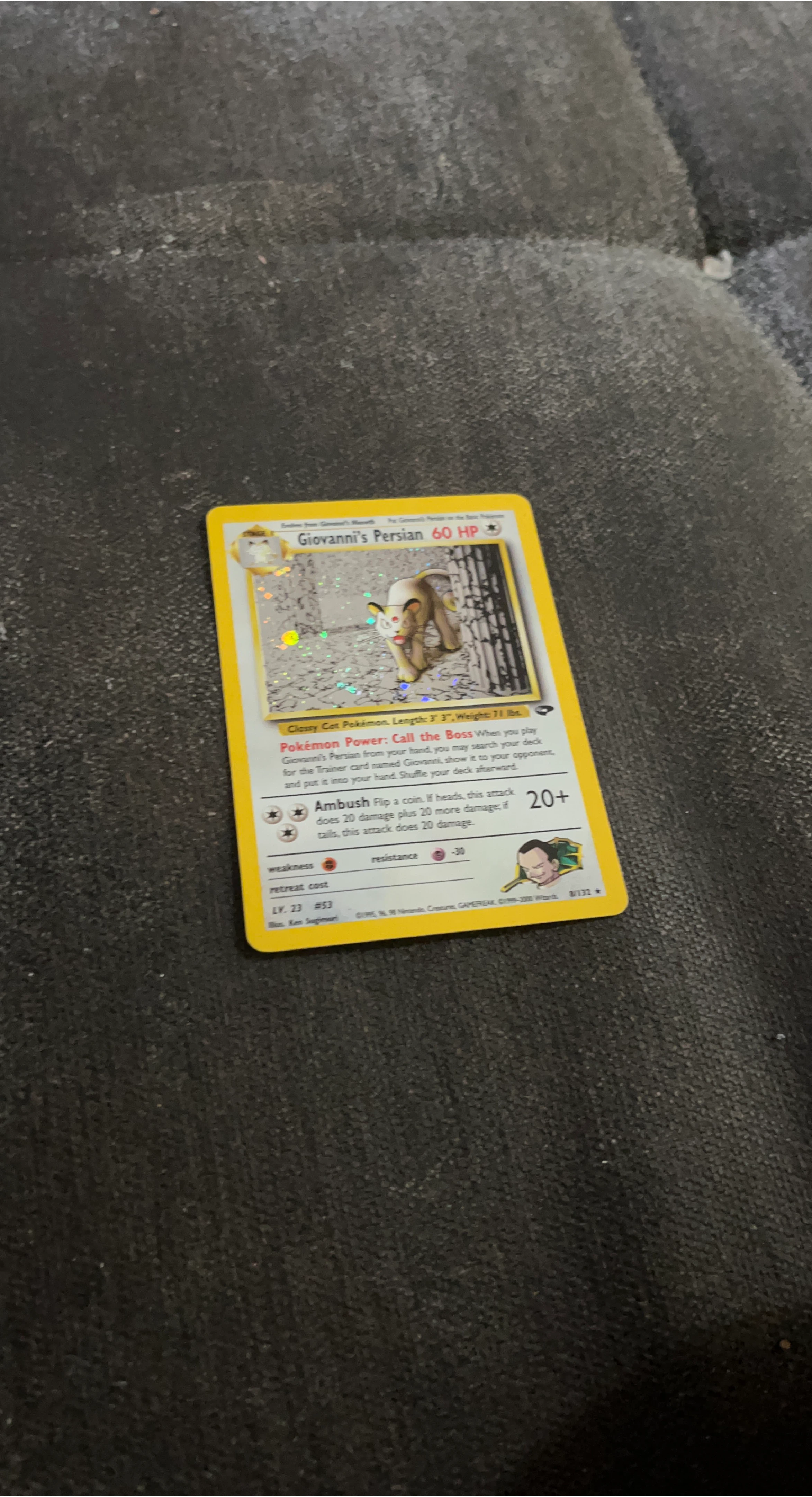 Selling a Giovanni's Persian Pokemon card with 60 HP. It has the Pokemon Power 'Call the Boss'. The card is level 23 and #53. If you flip a coin and get heads, the Ambush attack does 20 damage plus 20 more damage; if tails, this attack does 20 damage