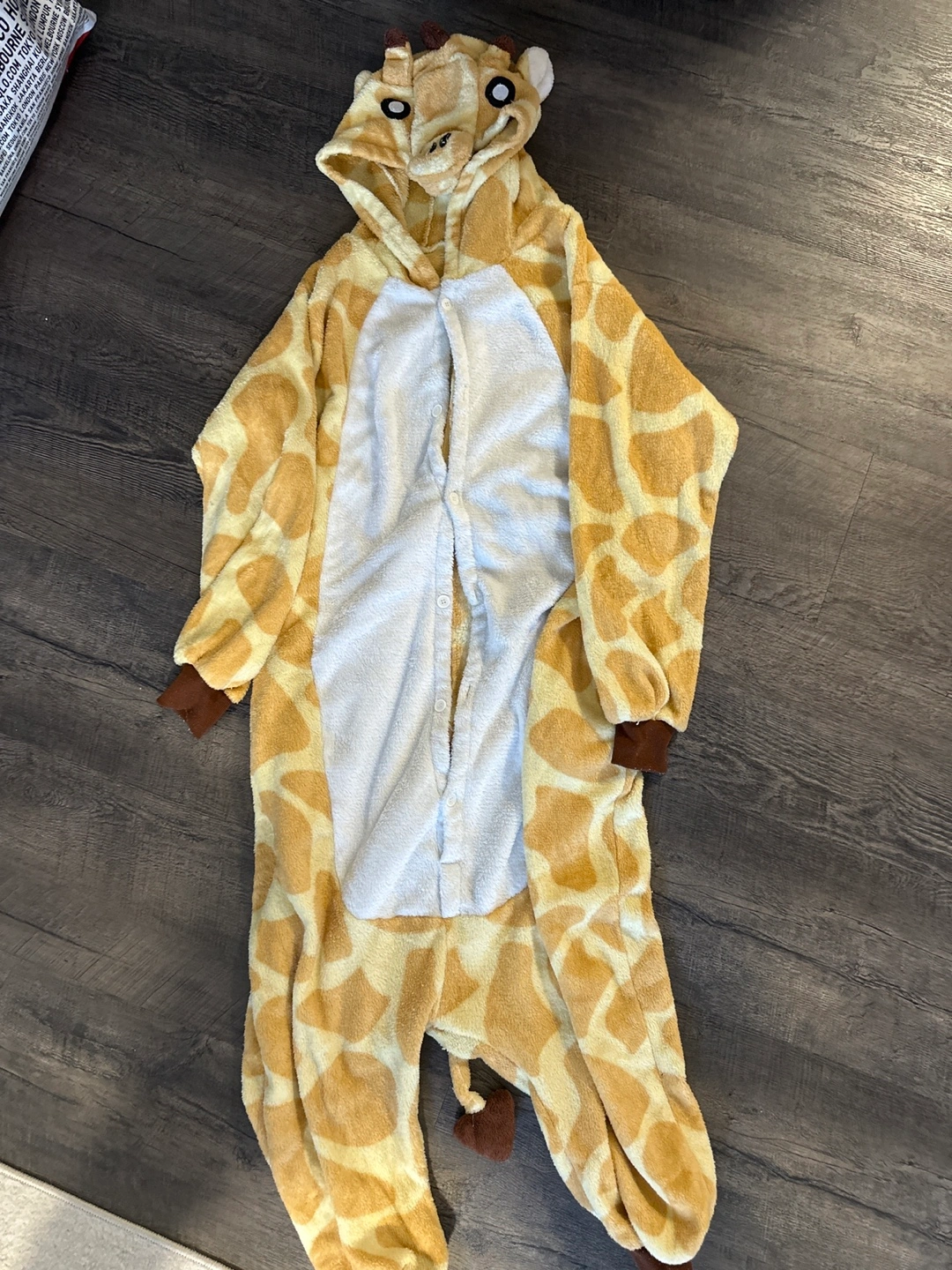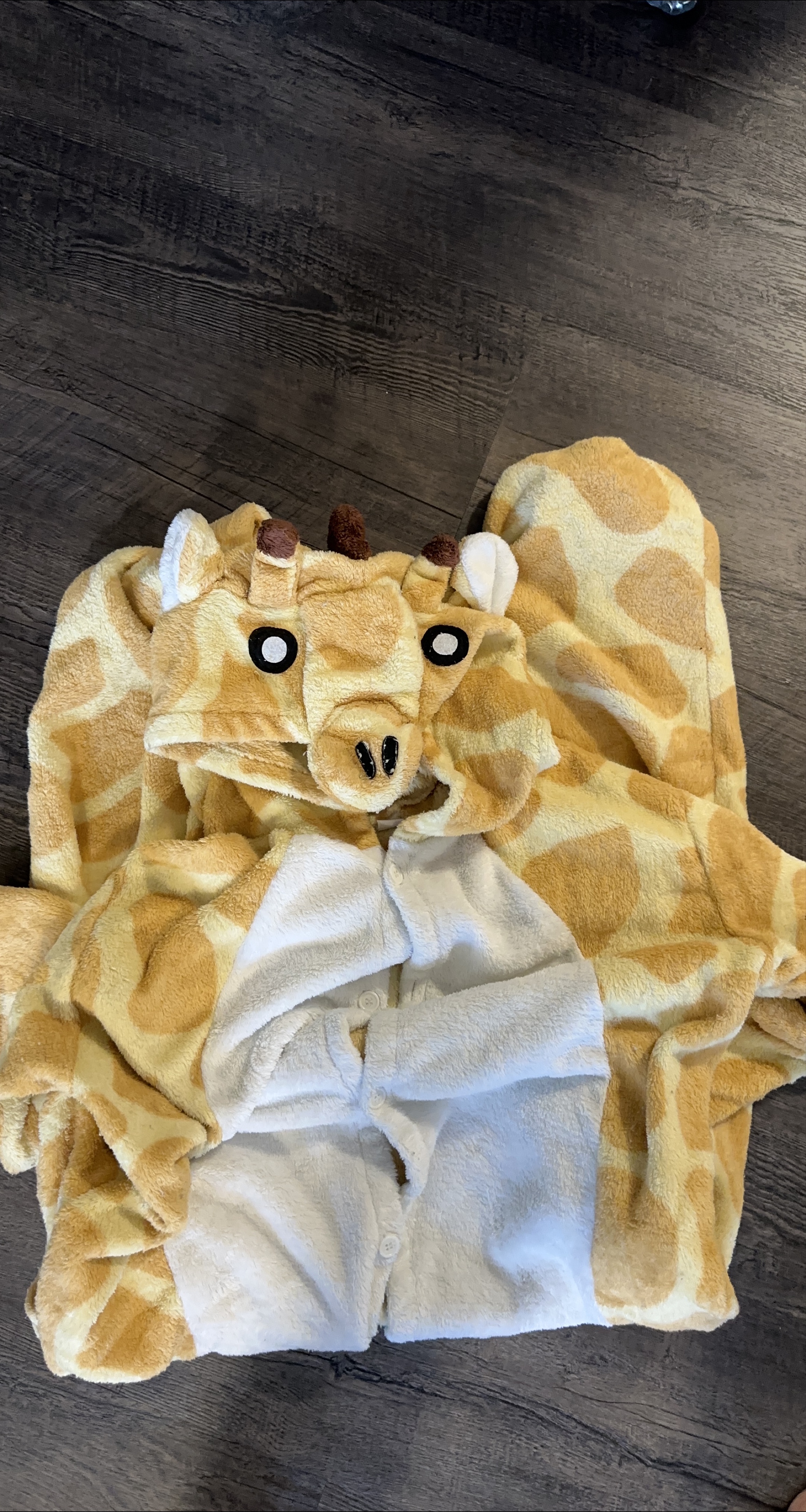 65A cozy giraffe onesie. Has a hood with giraffe ears and face. You can wear it for lounging and great for quick animal theme costume