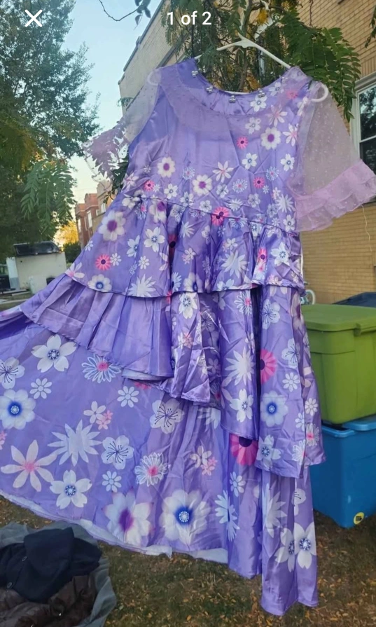 Here's a cute purple dress with a floral pattern! It has short, sheer sleeves and a tiered skirt. Perfect for dress-up or a special occasion