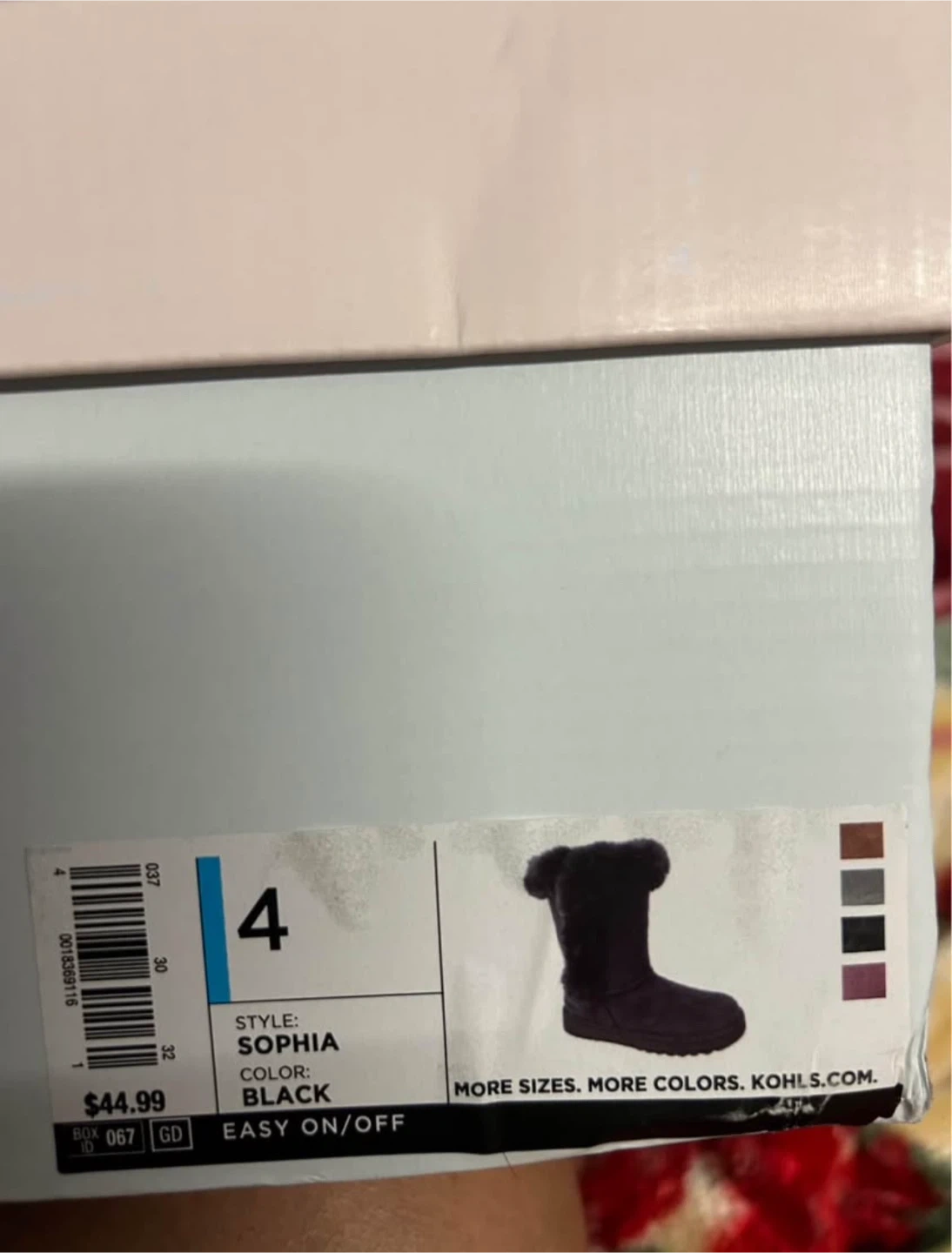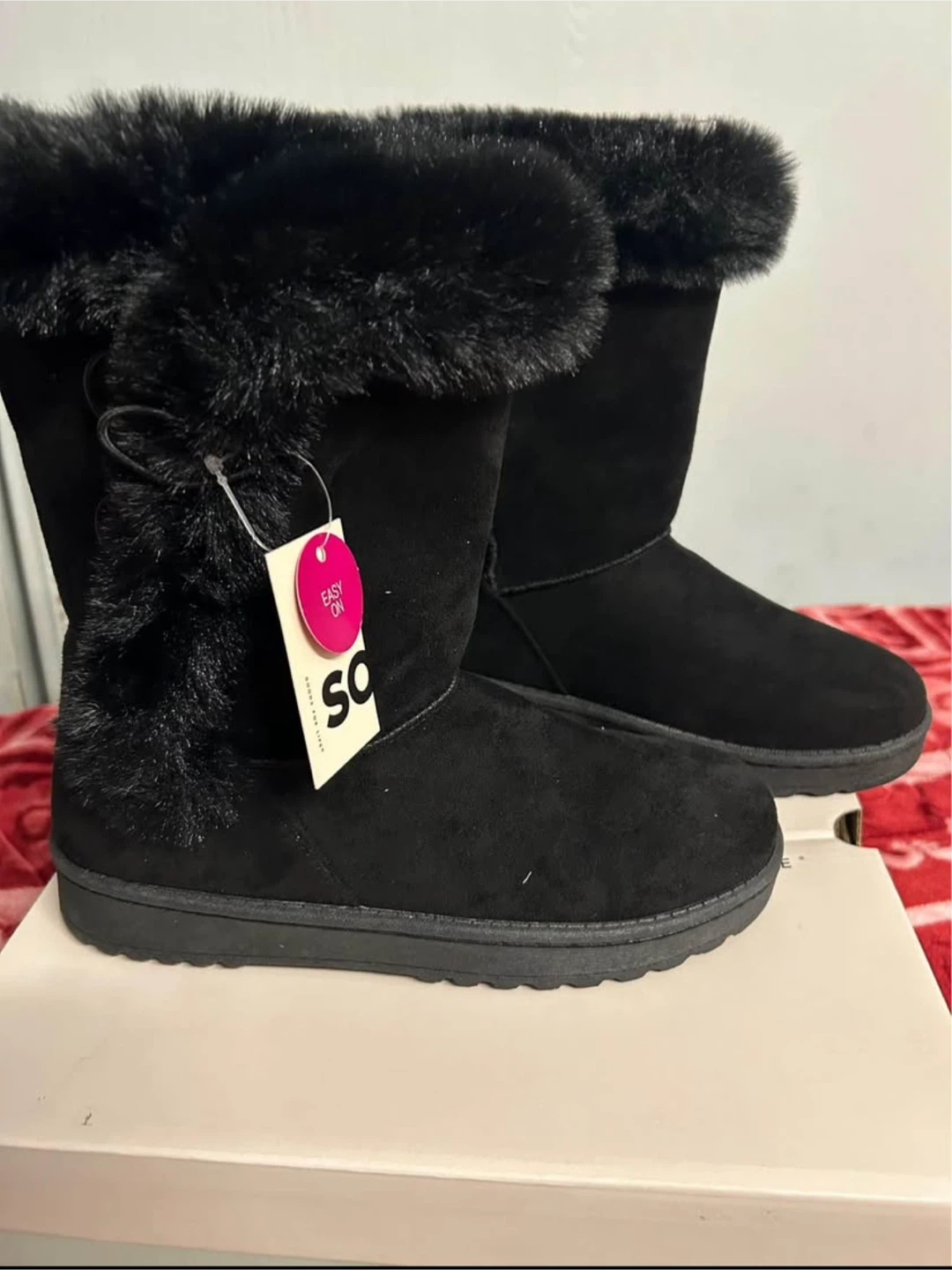 60Selling a NEW pair of SO Sophia boots in black! They're a size 4 and feature a cute faux fur trim. These boots are easy to slip on and off. The box is included!