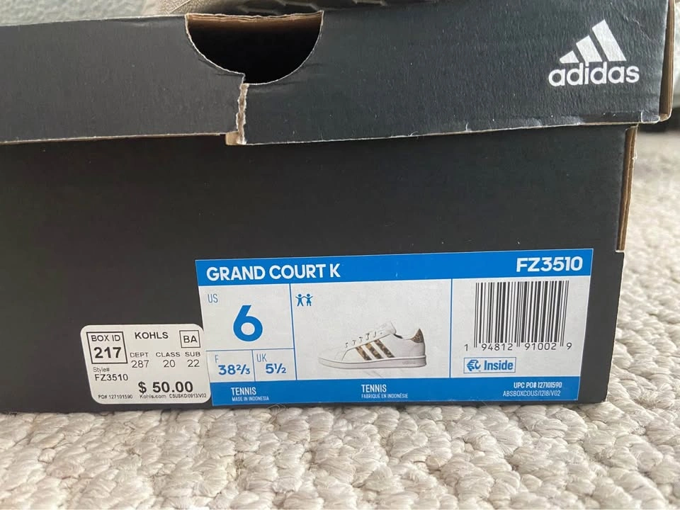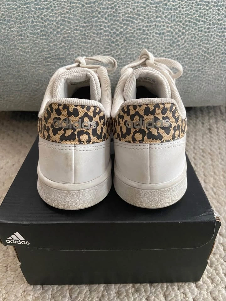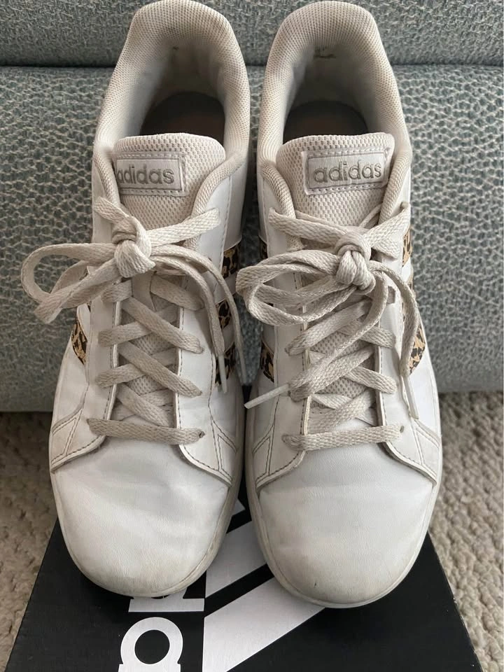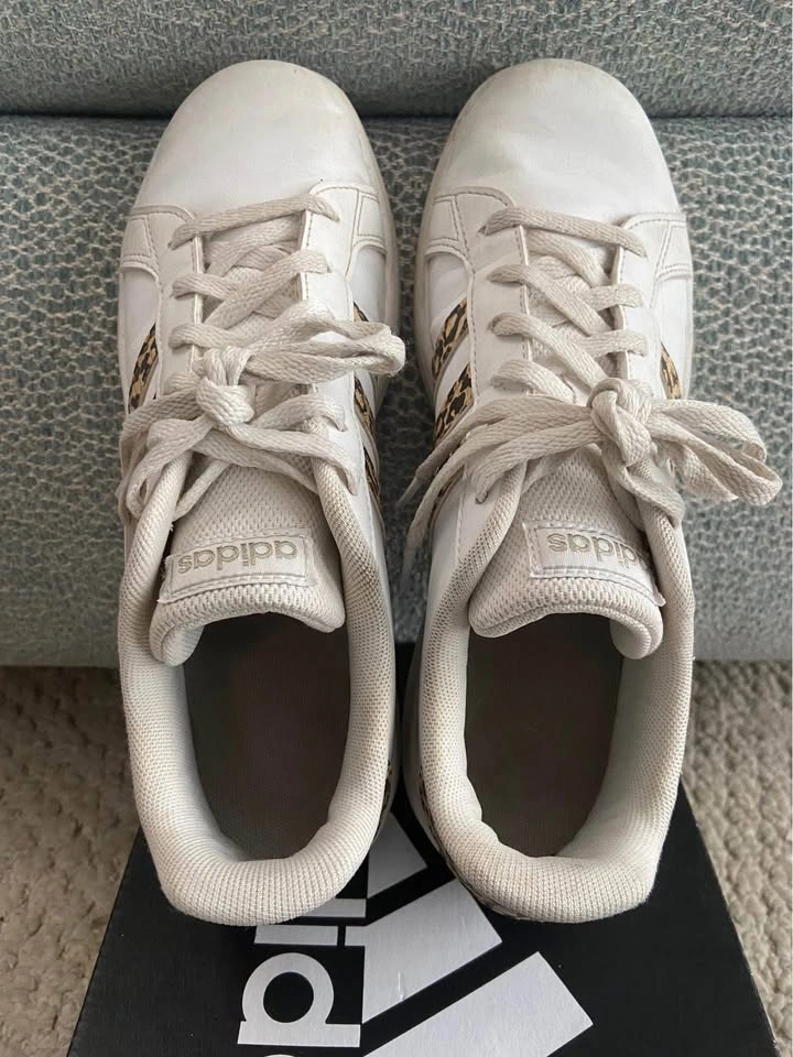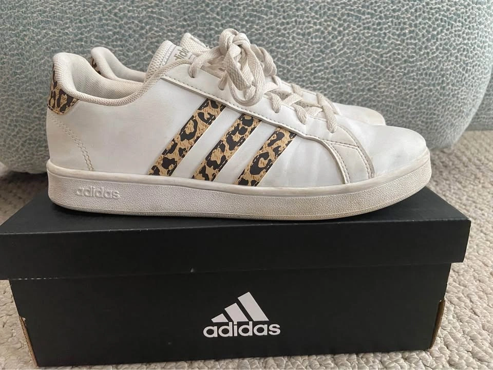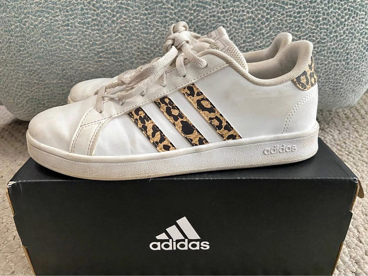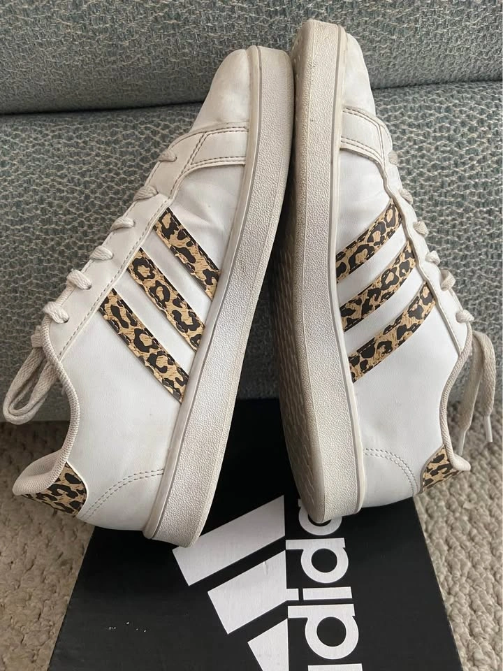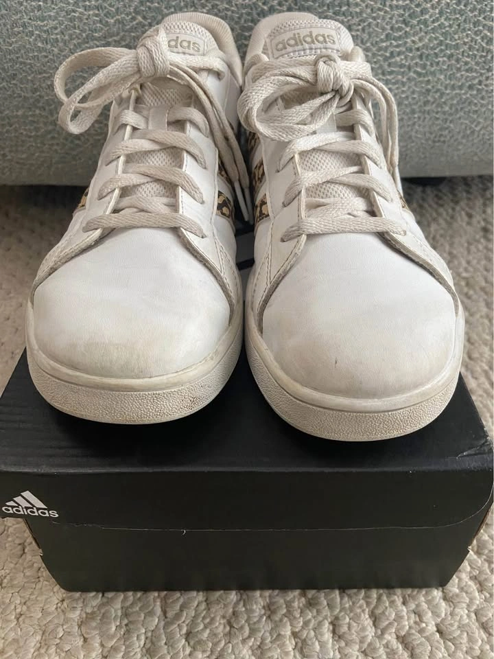 65Girl's Adidas Grand Court K Tennis Shoes, Leather, with leopard stripes, size 6. Can fit Youth Girls 6, or Women size 6. In good used condition. No rips, holes or tears inside or out. Cash only. Meet in Garfield Ridge, Chicago, near Midway. Willing to meet near Oak Lawn, EP, Alsip ☺️