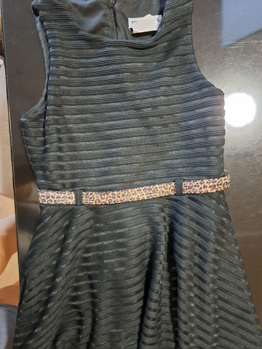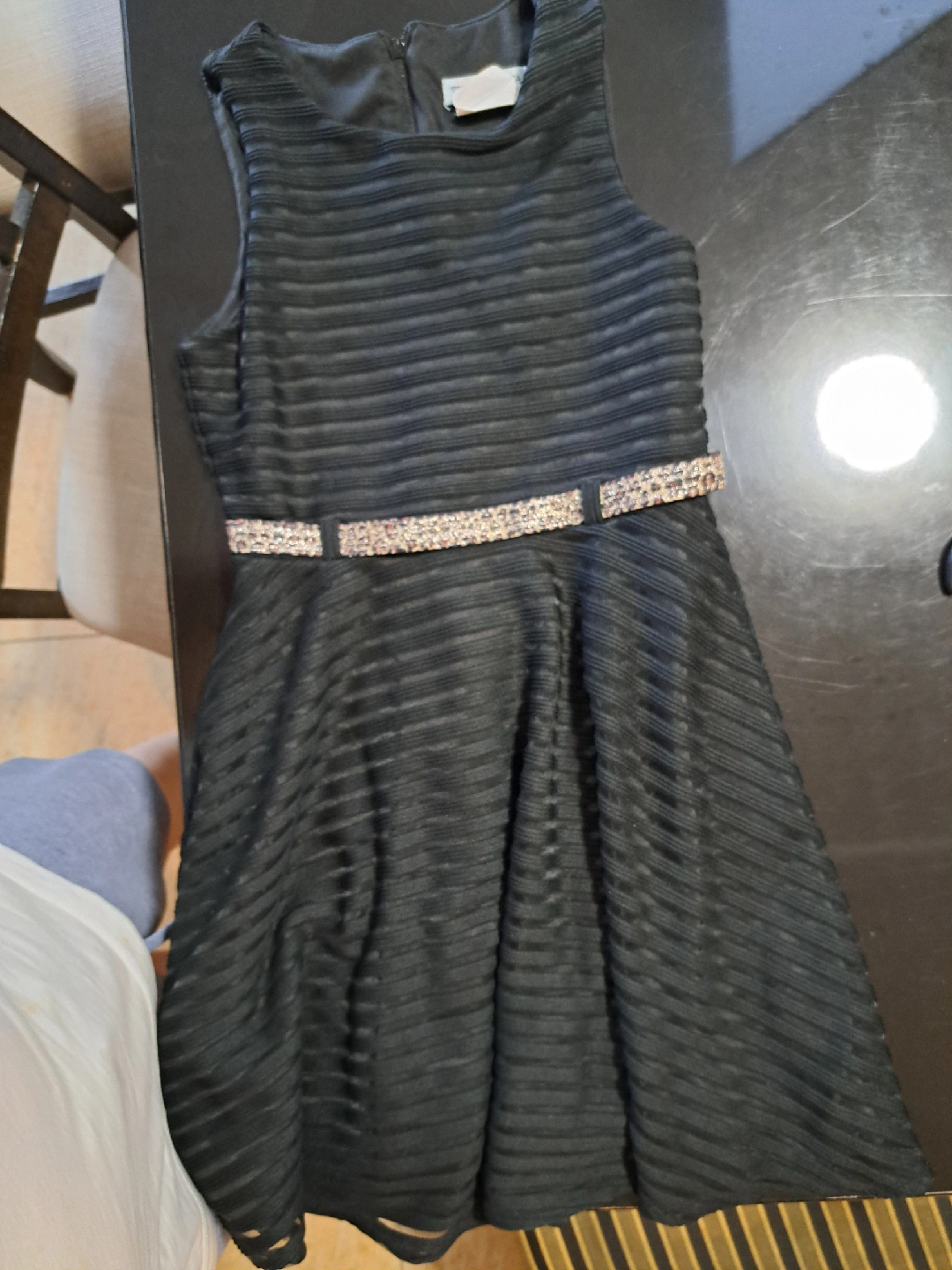 This is a cute black dress for girls! It features a sleeveless design and a stylish embellished belt around the waist. Perfect for parties or special occasions!
