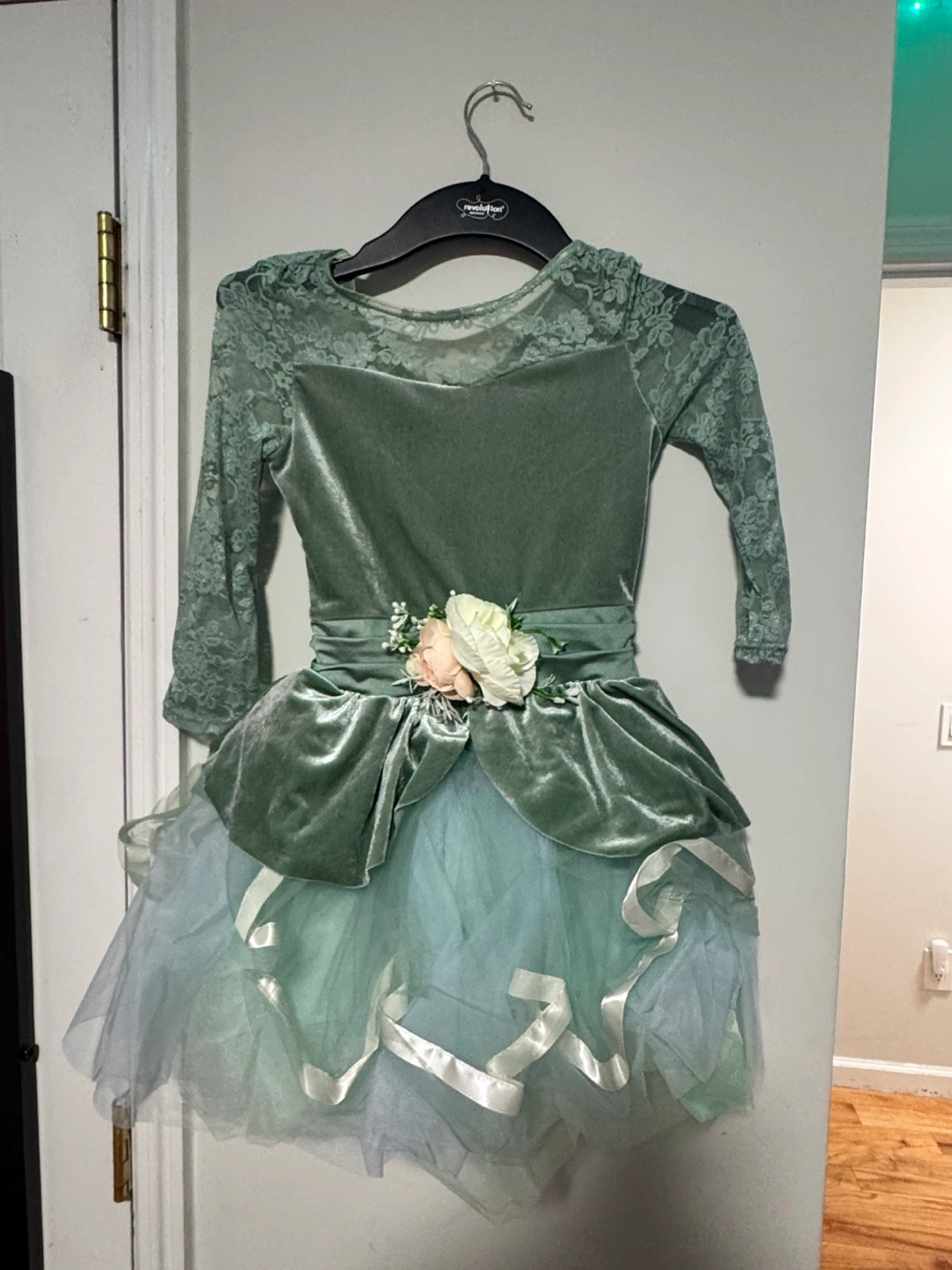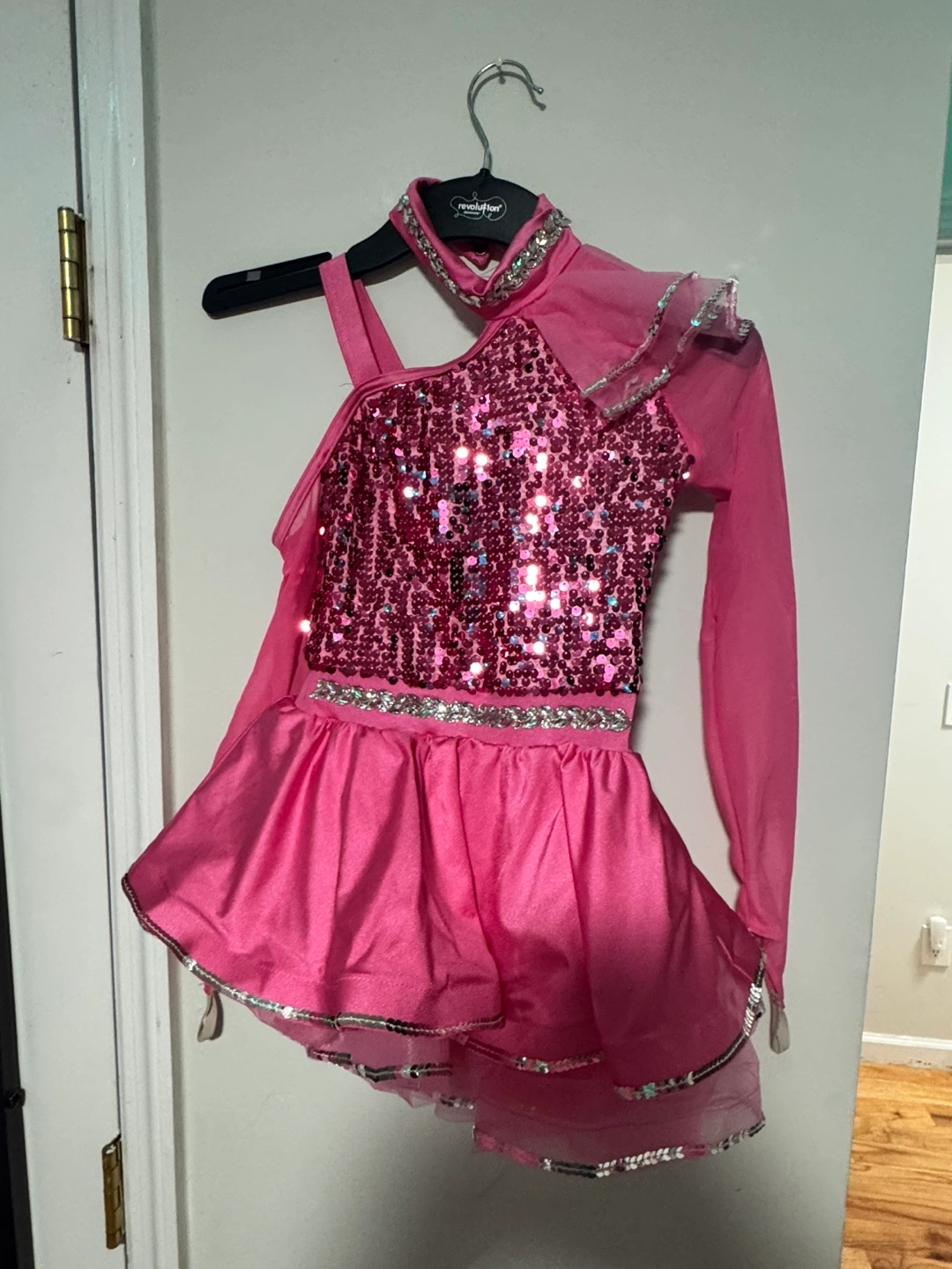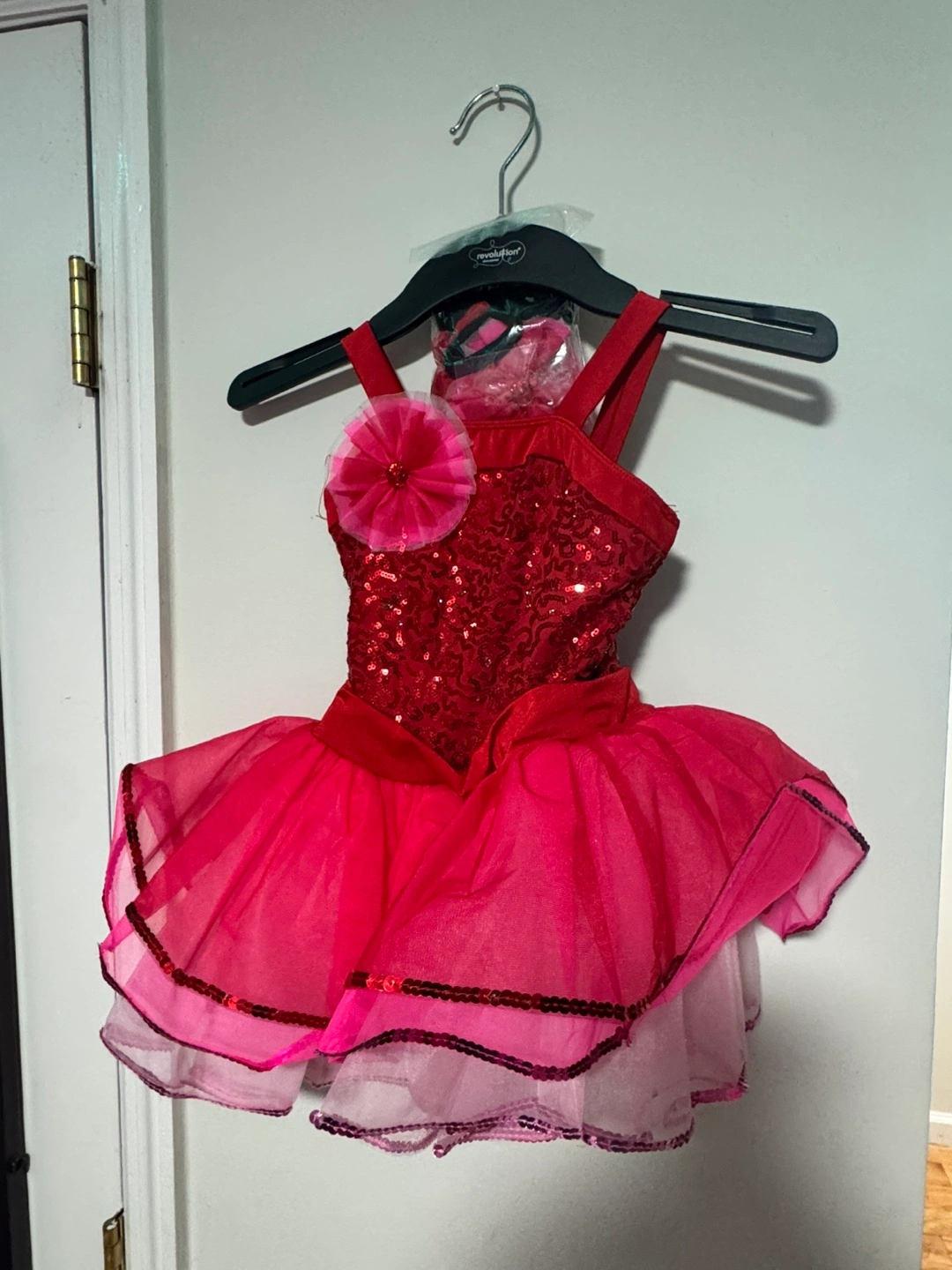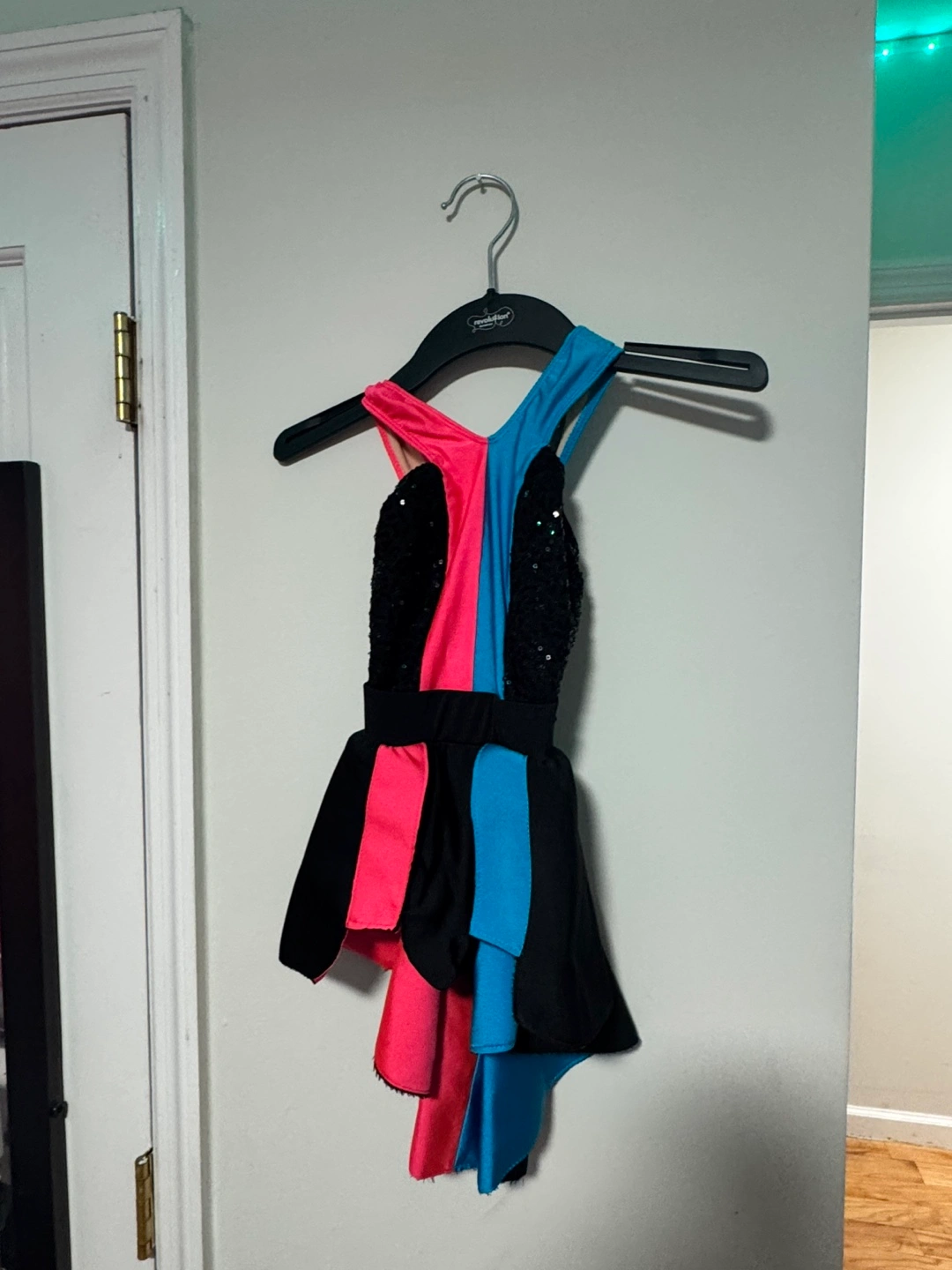 Five girls' dance costumes. Various colors and styles. Sequins, tulle, velvet. Great for recitals or performances. Sizes may vary slightly.