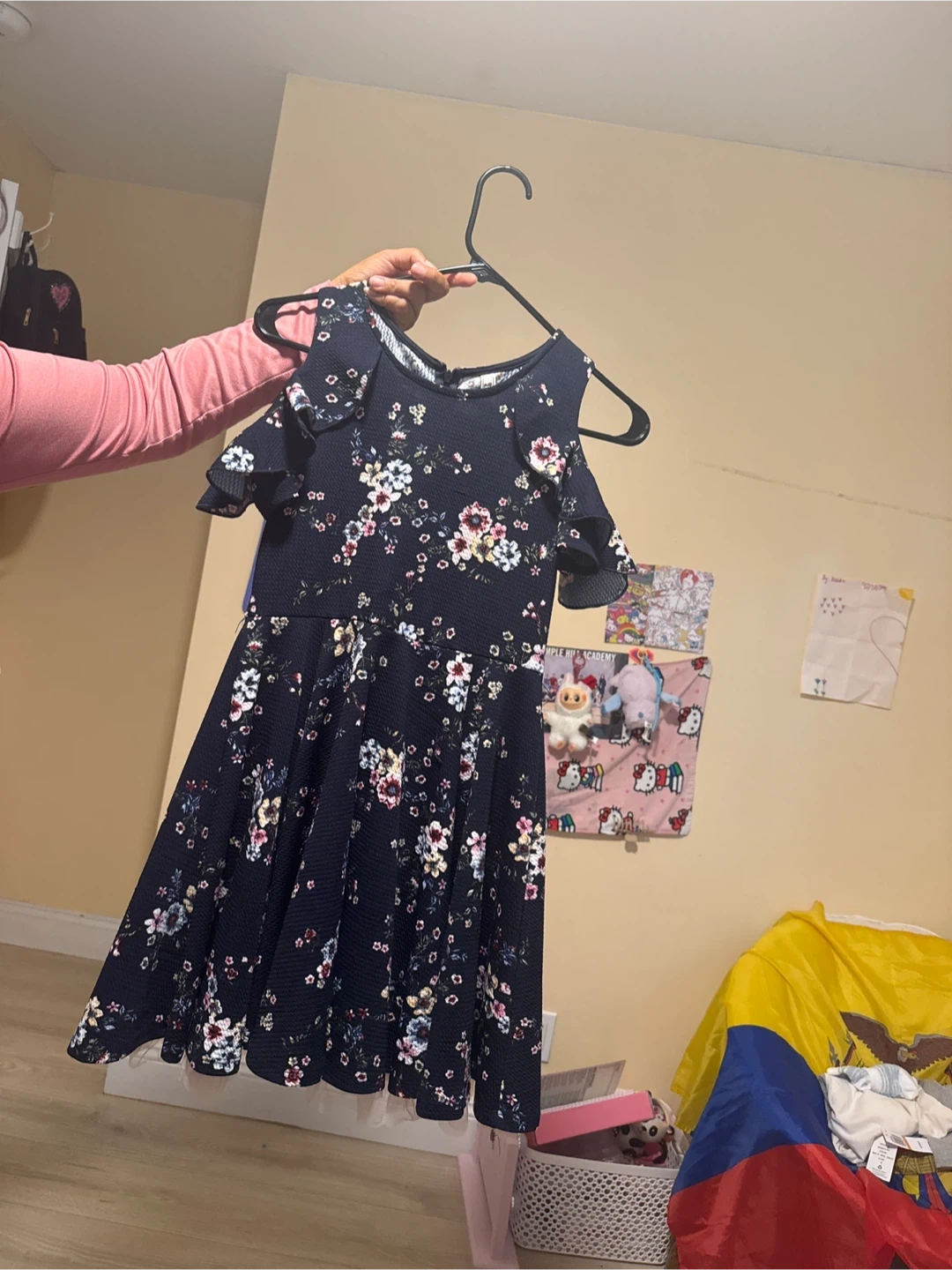 25Cute navy blue dress with a colorful floral pattern. It has a cold-shoulder design with ruffle details. Perfect for a party or special occasion!