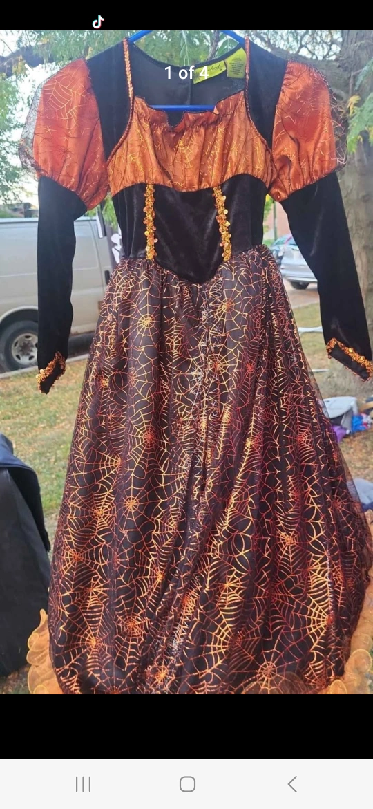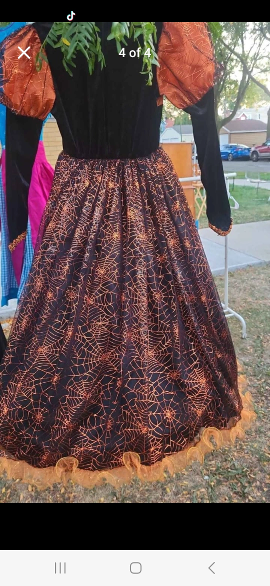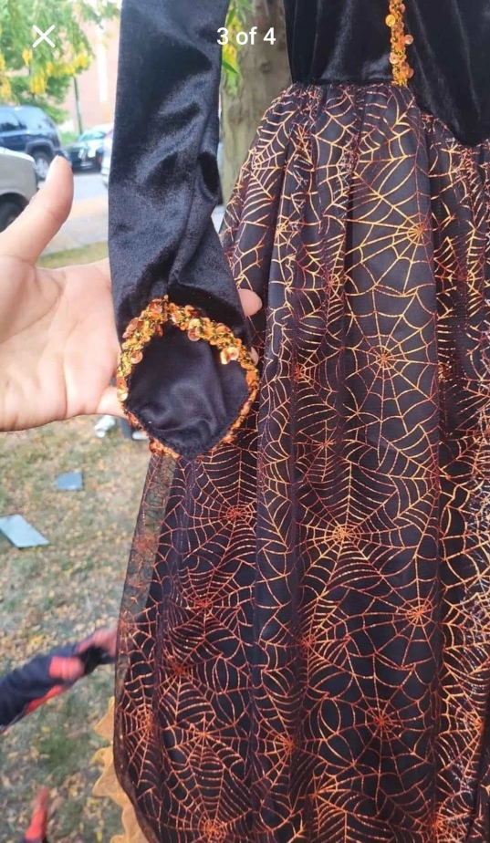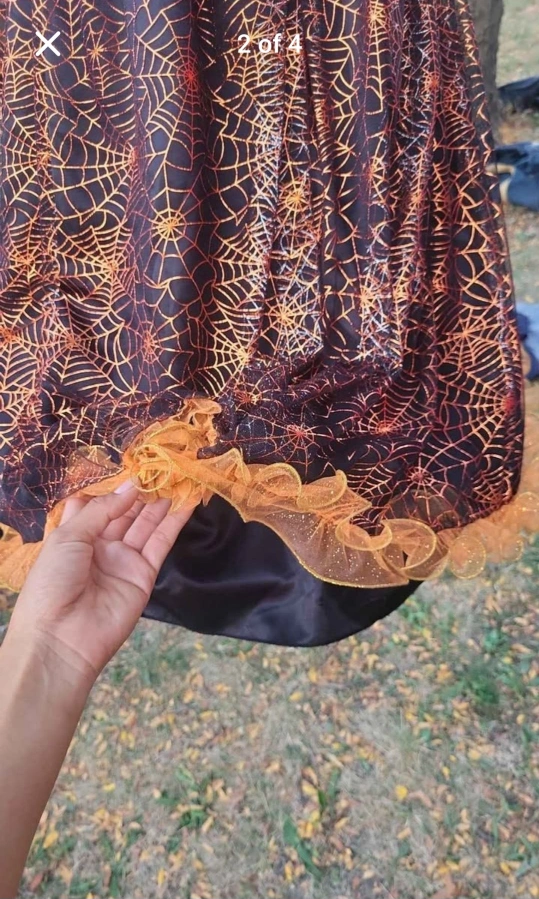 Girl's Halloween witch costume with black velvet bodice and orange and black spiderweb skirt. The sleeves are long and black with orange accents. It's in great condition and ready for Halloween!