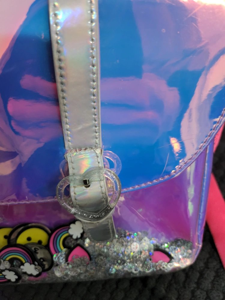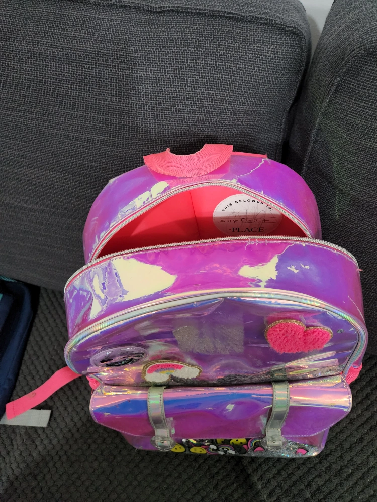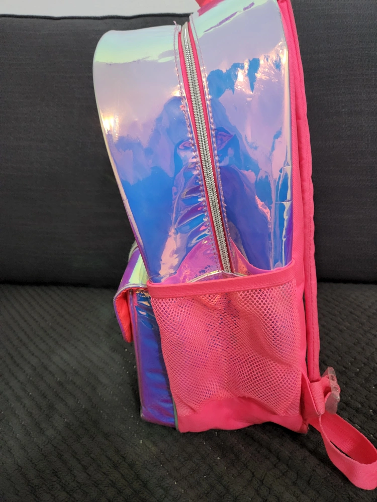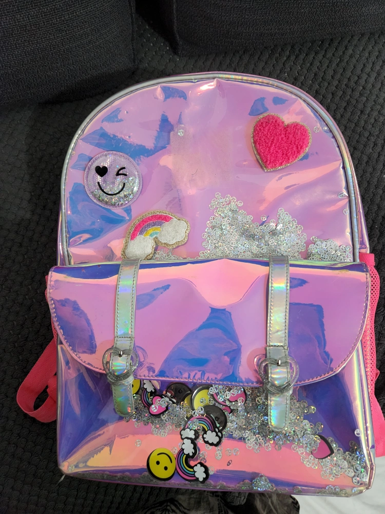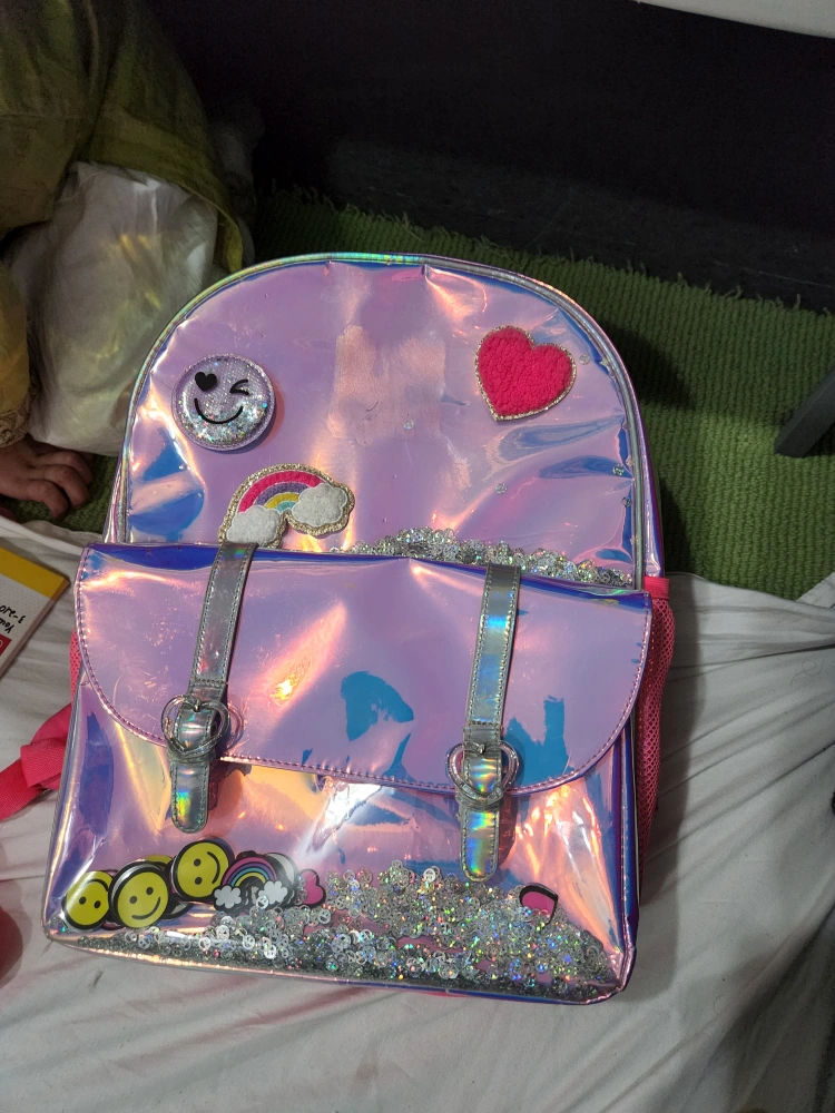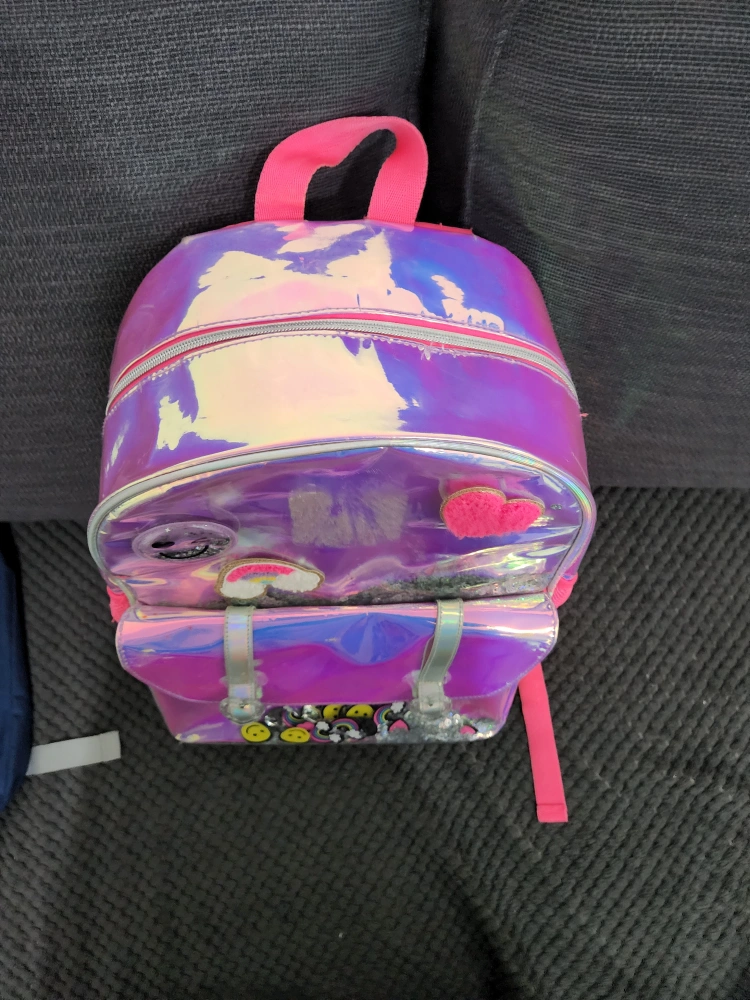 This adorable girls' backpack features a fun iridescent design with cute patches and sequin details! It's perfect for school or everyday adventures. The backpack has a spacious main compartment and a front pocket for extra storage.