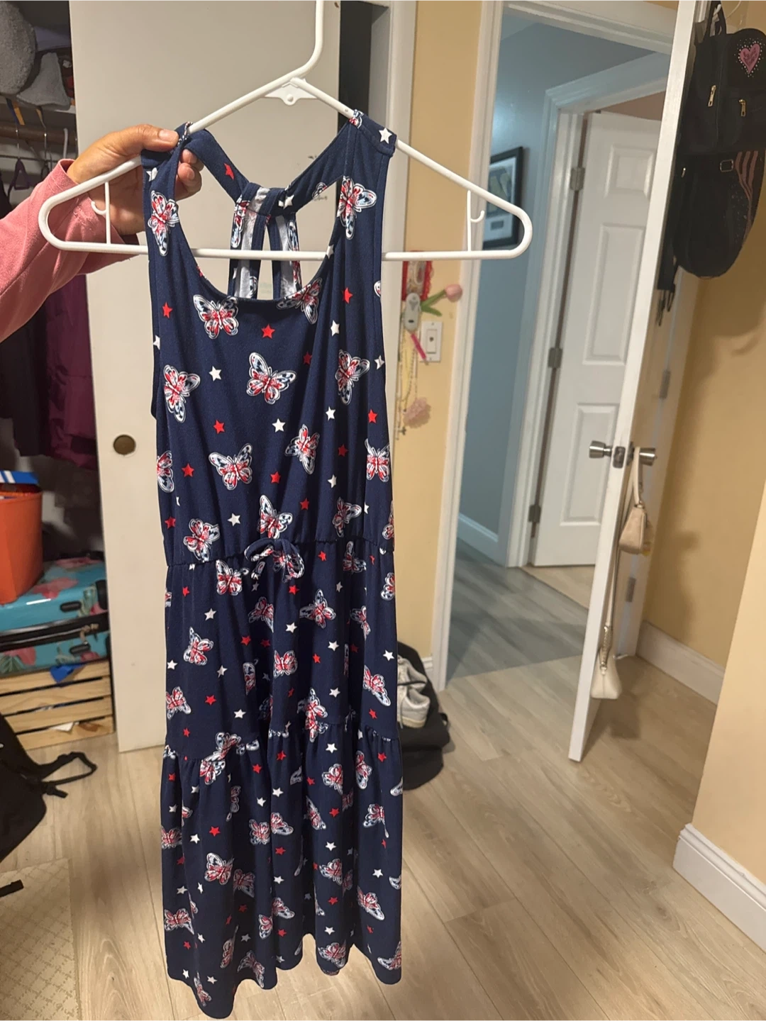 25Cute girls navy dress with a butterfly and star pattern! It has a tie at the waist and a racerback style top. Perfect for summer! It’s relatively new