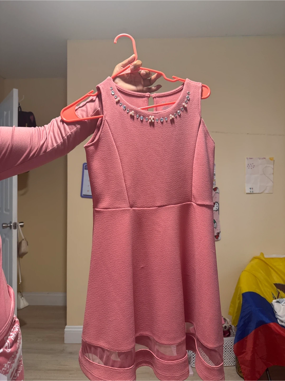 25A cute pink dress for girls! It features embellishments around the neckline and a sheer trim at the bottom. Perfect for parties or special occasions size girls 14