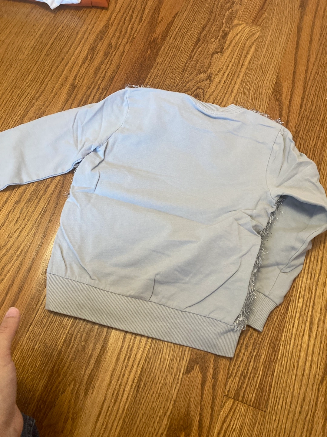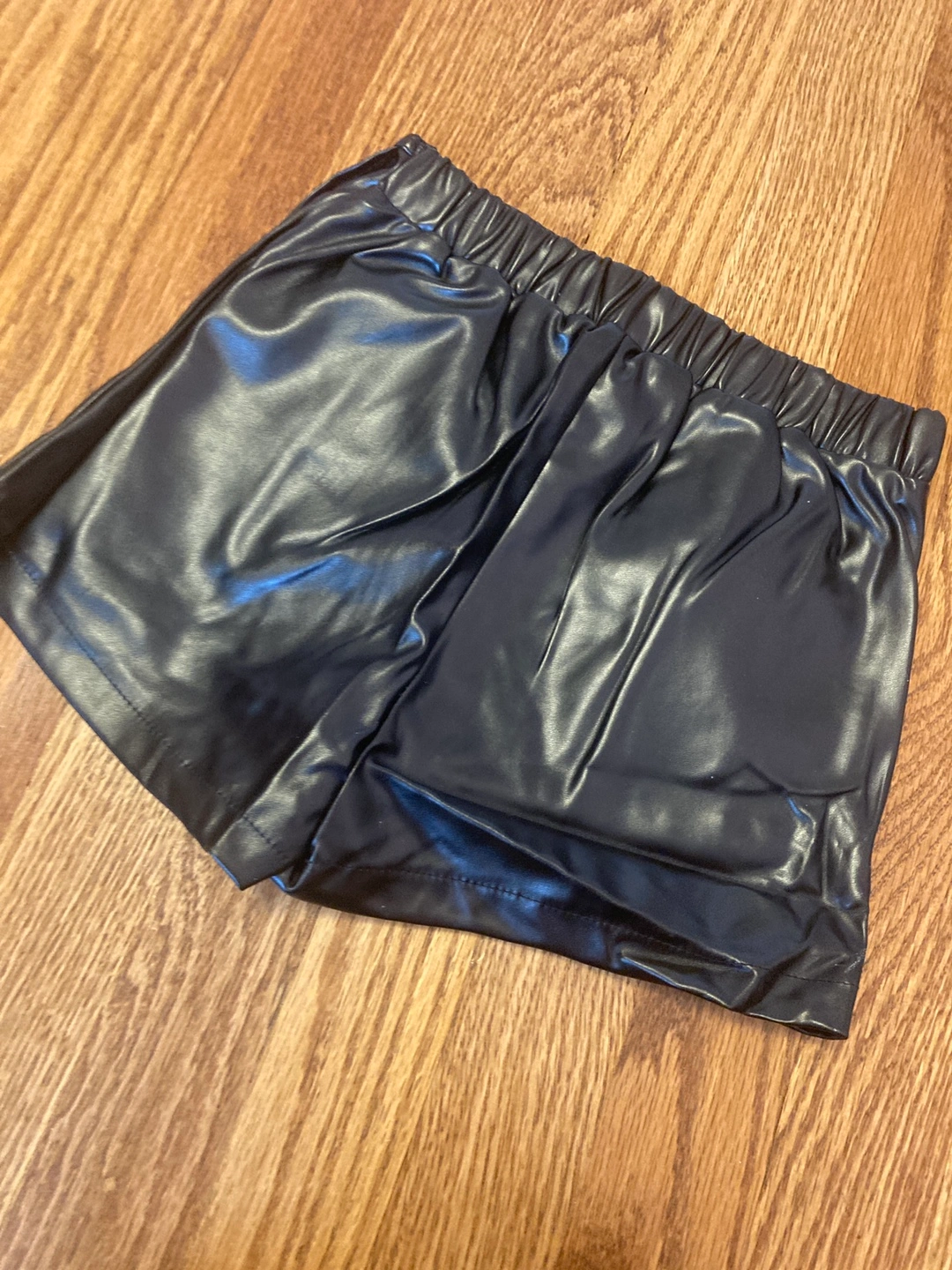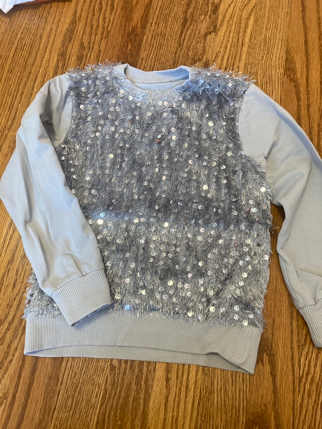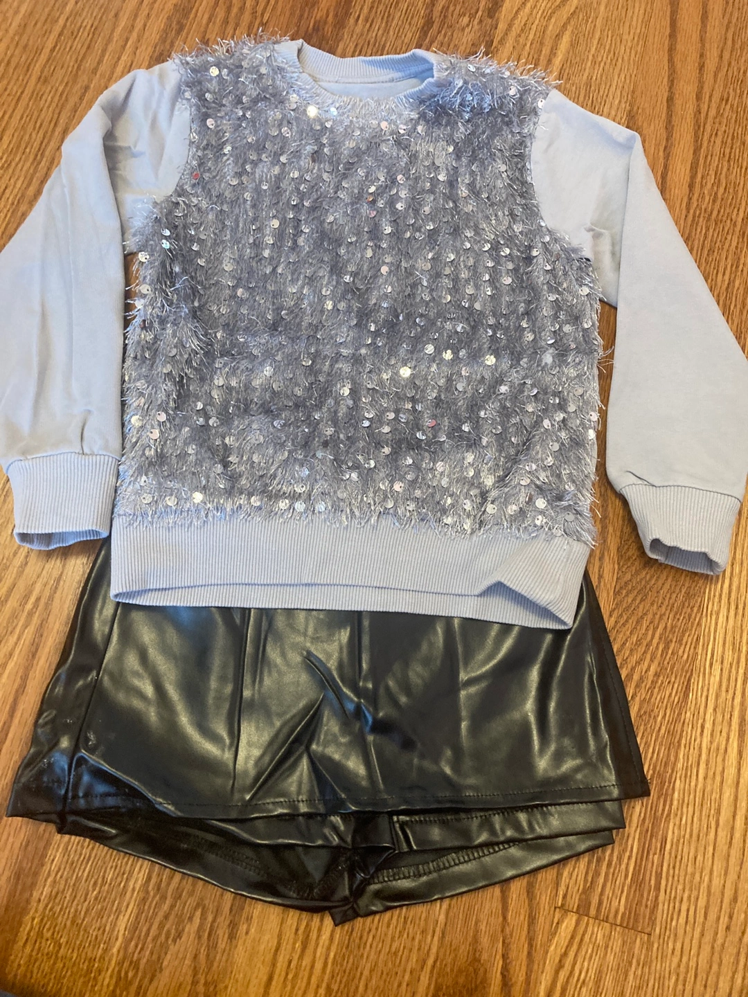 10Cute girls' set featuring a long-sleeved, light blue top with sparkly sequins and a black faux leather skort! Perfect for parties or special occasions