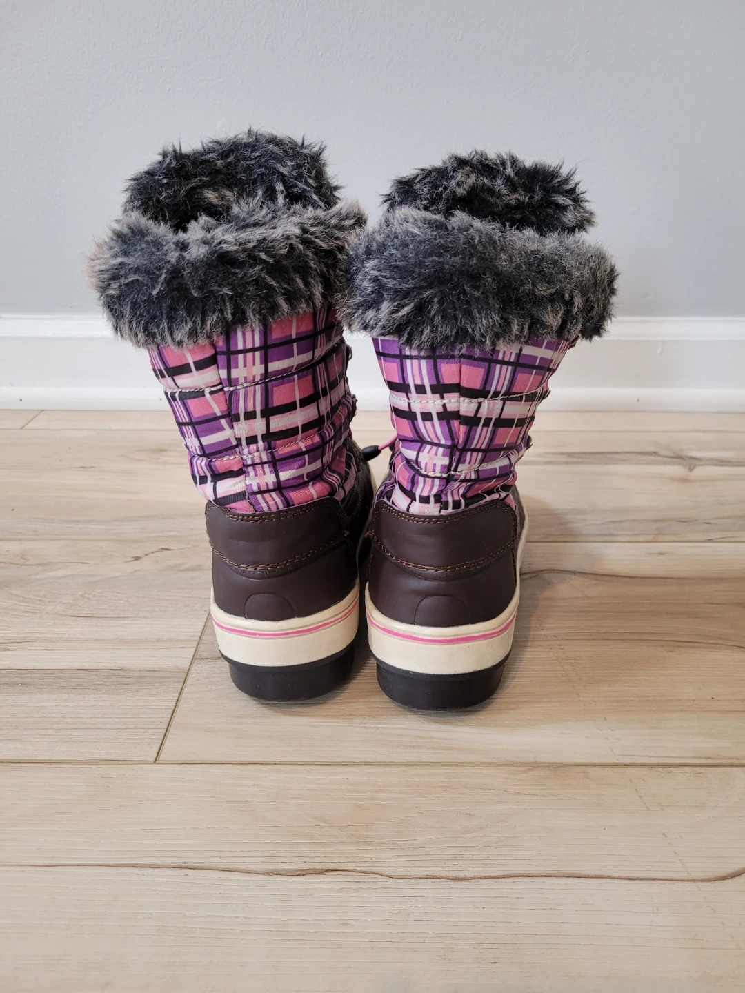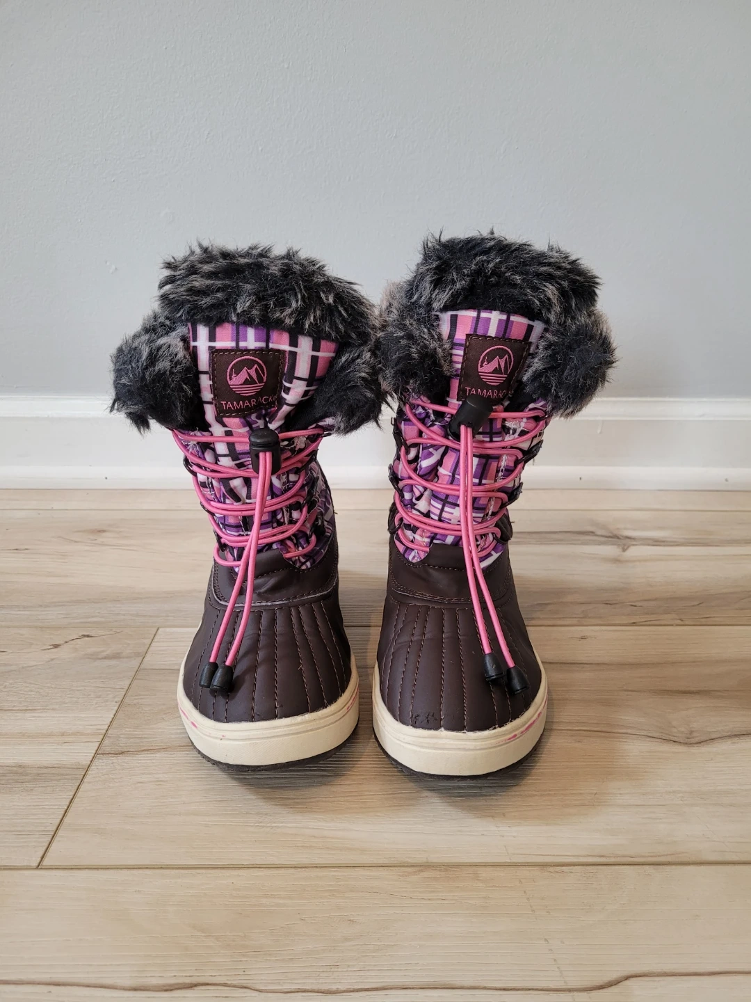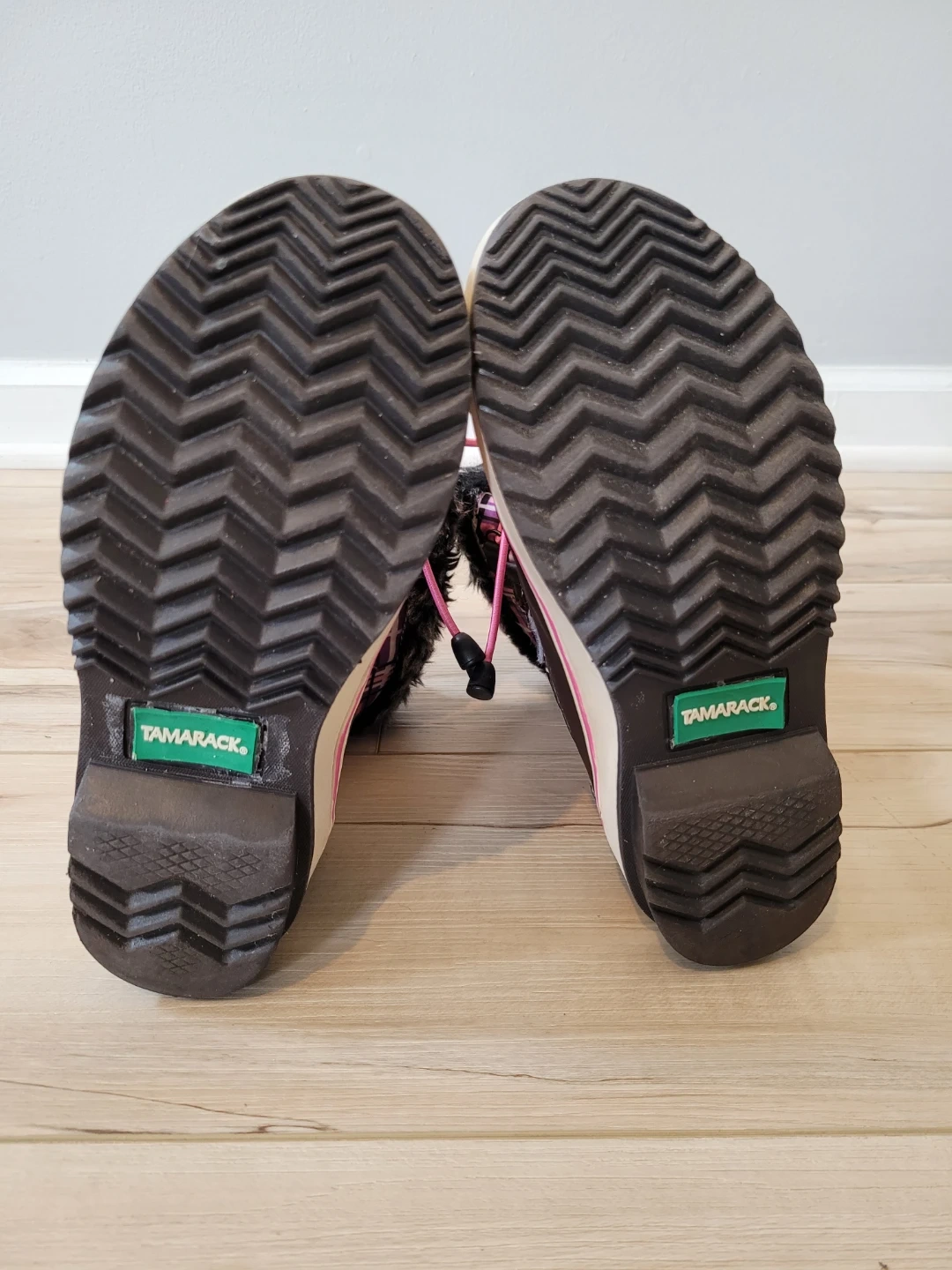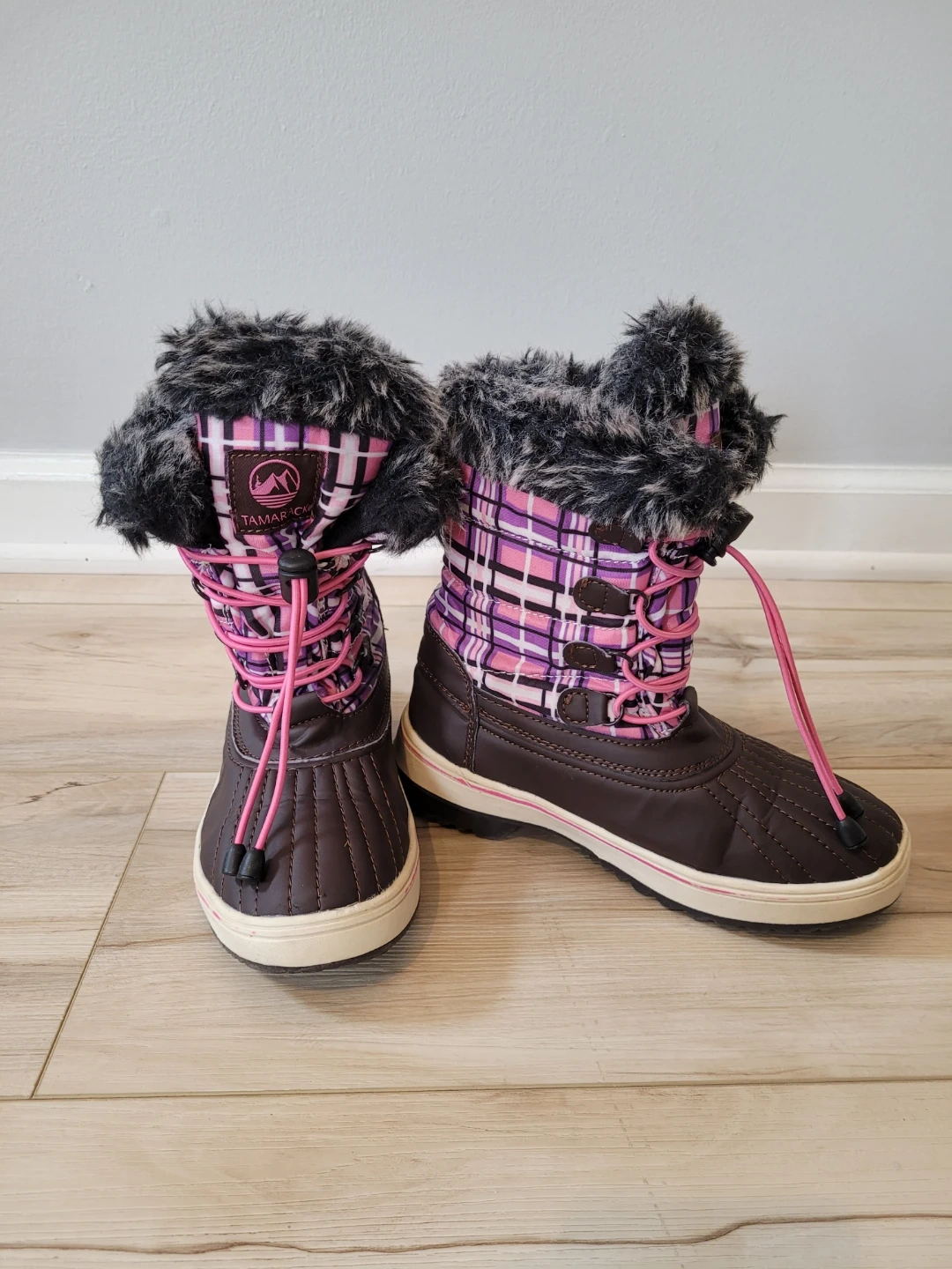 85Cute Tamarack winter boots girls youth size 2 with a plaid design and faux fur trim! They have pink bungee laces for easy on and off and are perfect for keeping your feet warm and dry during the cold weather. Good condition with some wear see photos for condition.