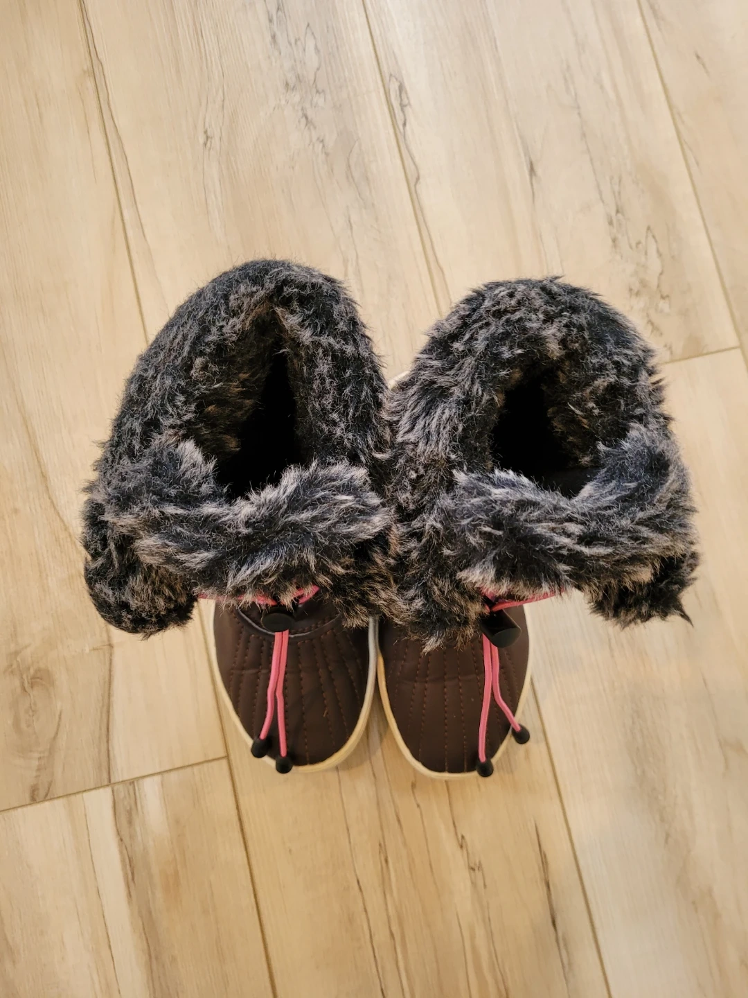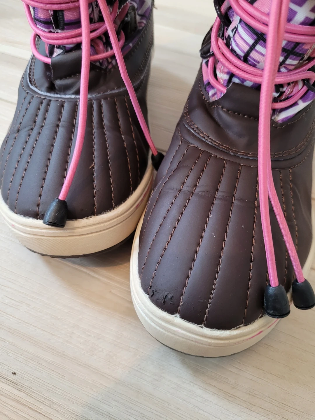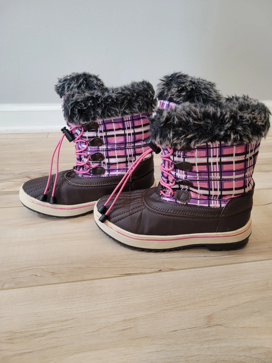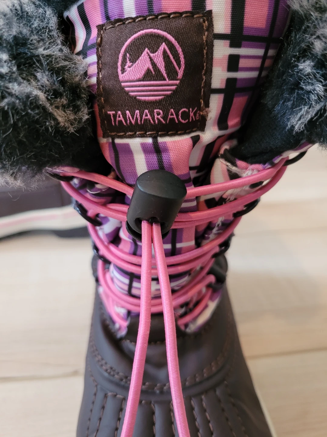 85Cute Tamarack winter boots girls youth size 2 with a plaid design and faux fur trim! They have pink bungee laces for easy on and off and are perfect for keeping your feet warm and dry during the cold weather. Good condition with some wear see photos for condition.