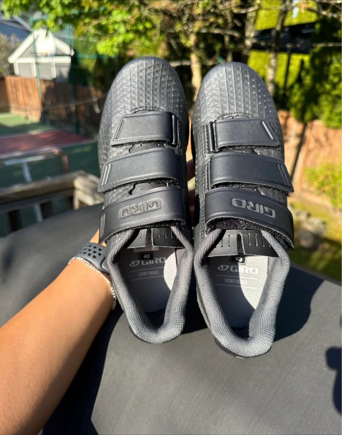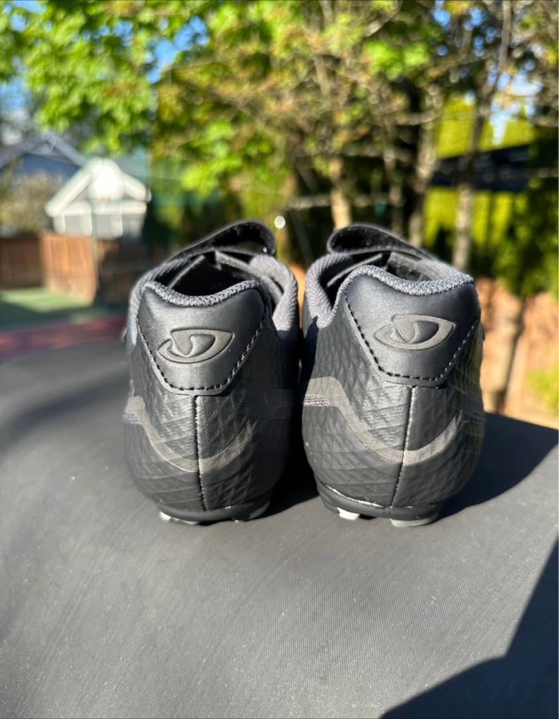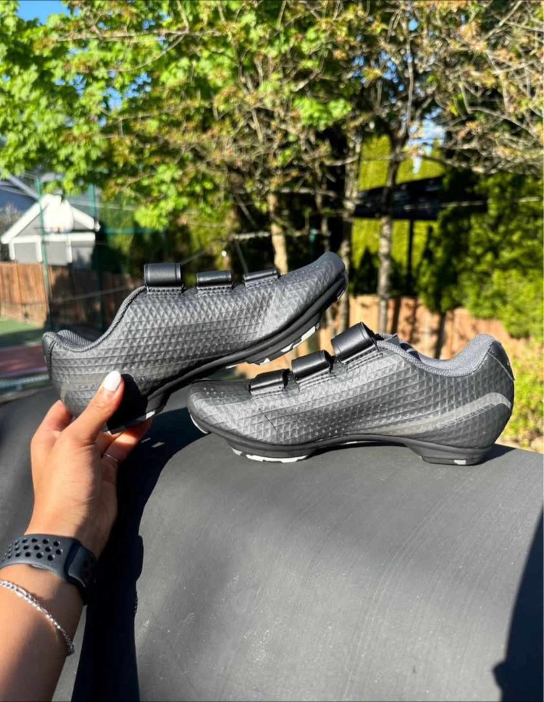 Cycling shoes in an all black colour. The upper is made of a textured material. Straps across the shoe for closure. The soles have space for clips. These are a great way to enjoy the journey.