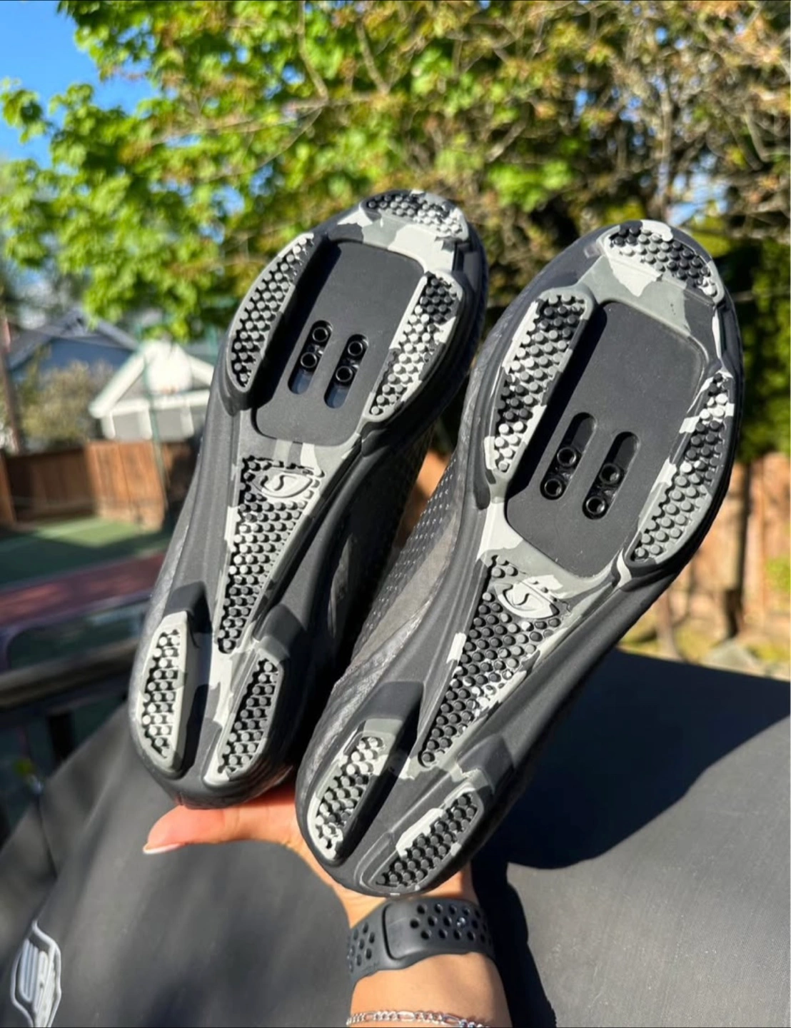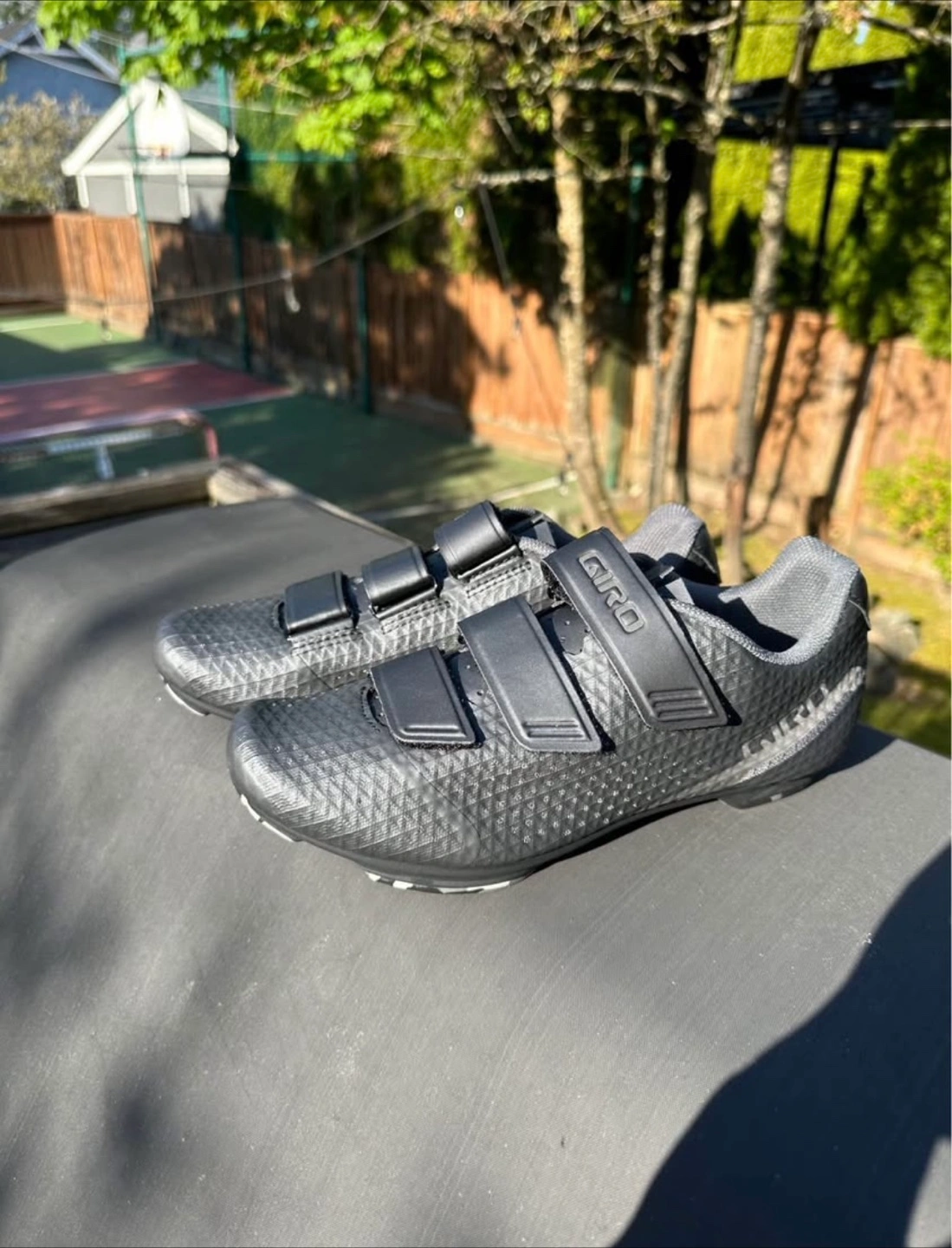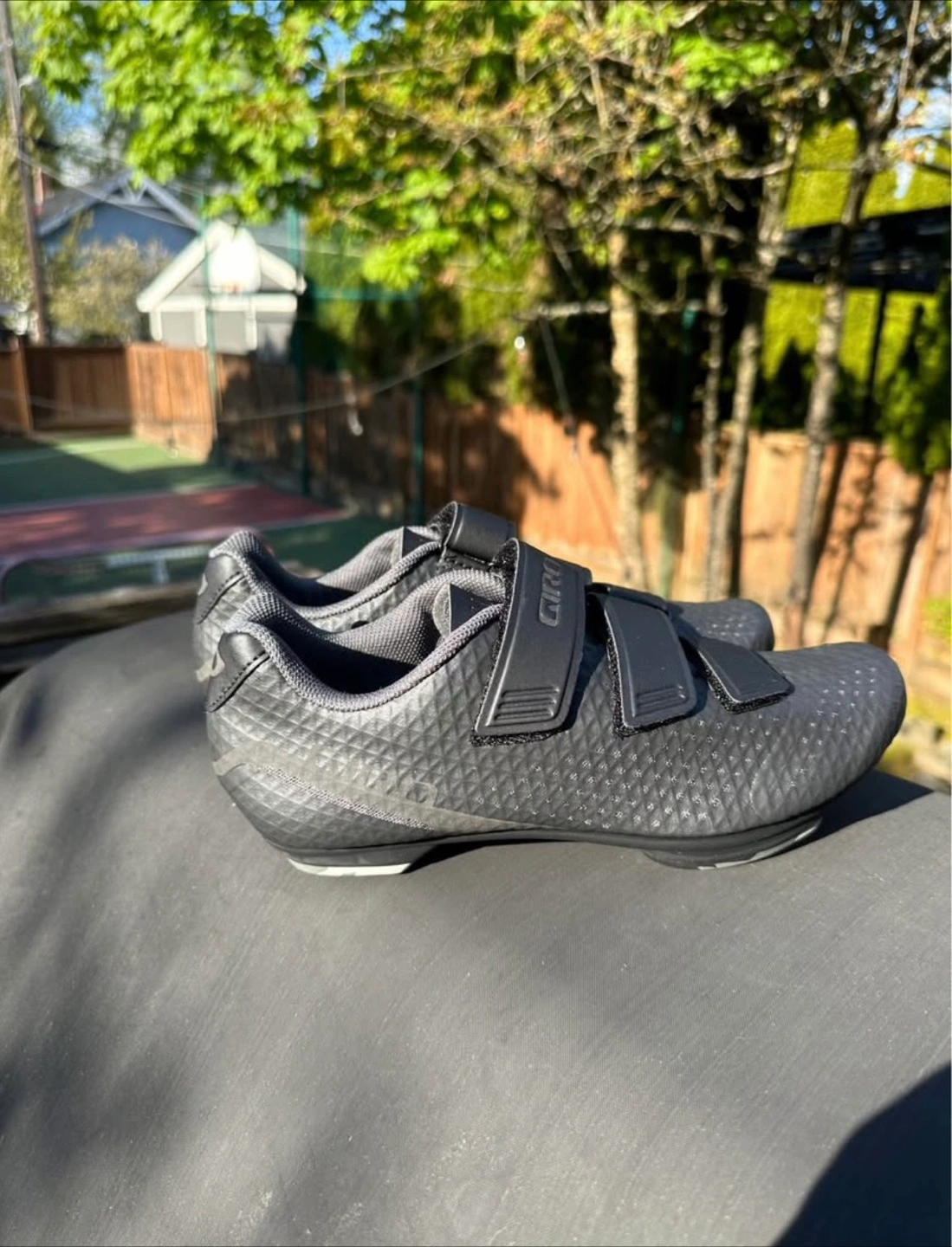 Cycling shoes in an all black colour. The upper is made of a textured material. Straps across the shoe for closure. The soles have space for clips. These are a great way to enjoy the journey.