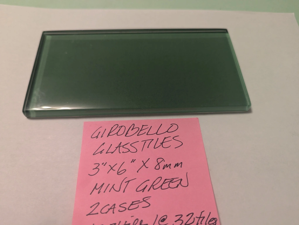 Selling Girobello glass tiles in a lovely mint green shade! These are 3" x 6" x 8mm subway tiles. I have two cases available (minus 1 tile). These originally cost $65.83 per case.
