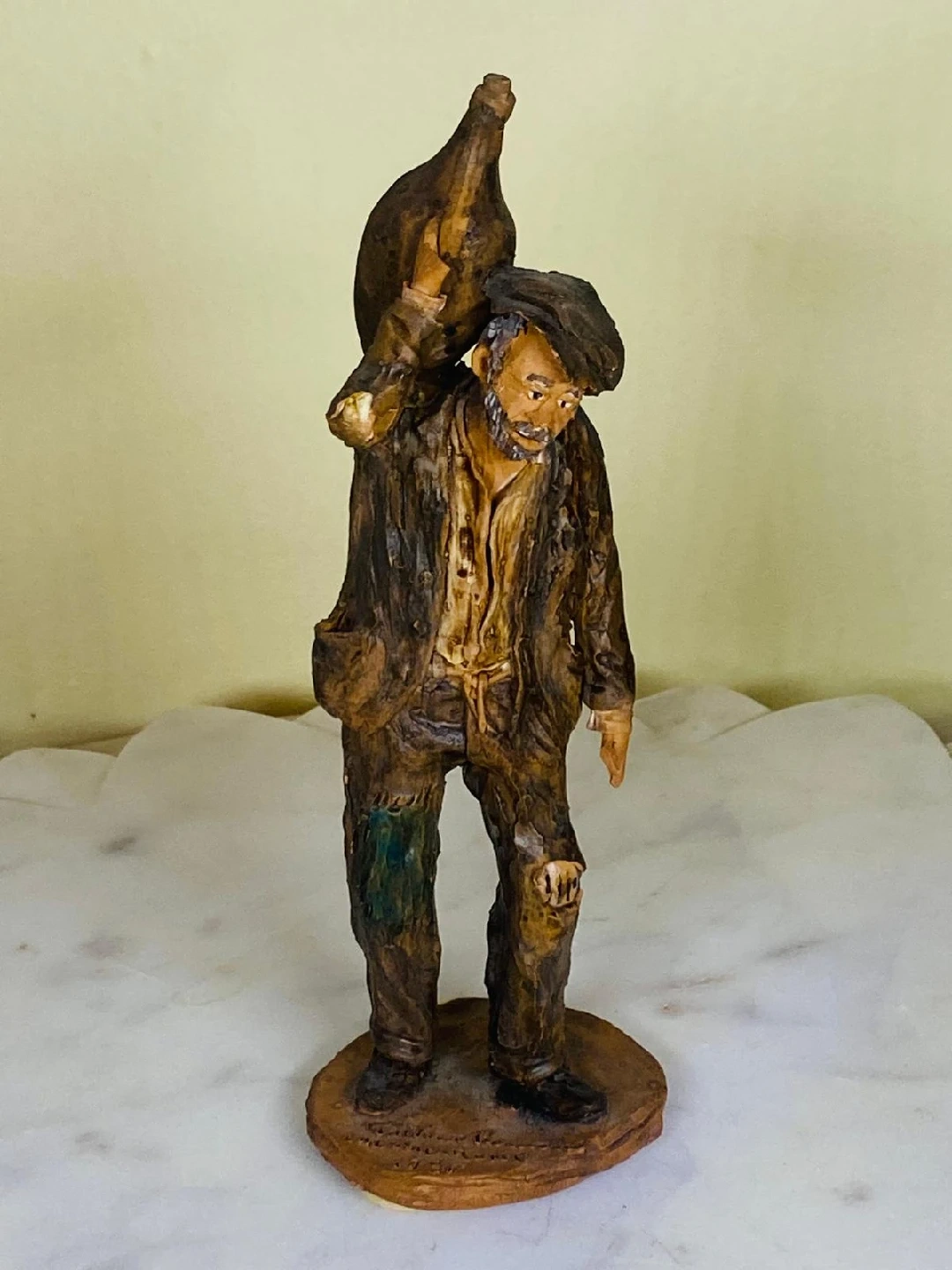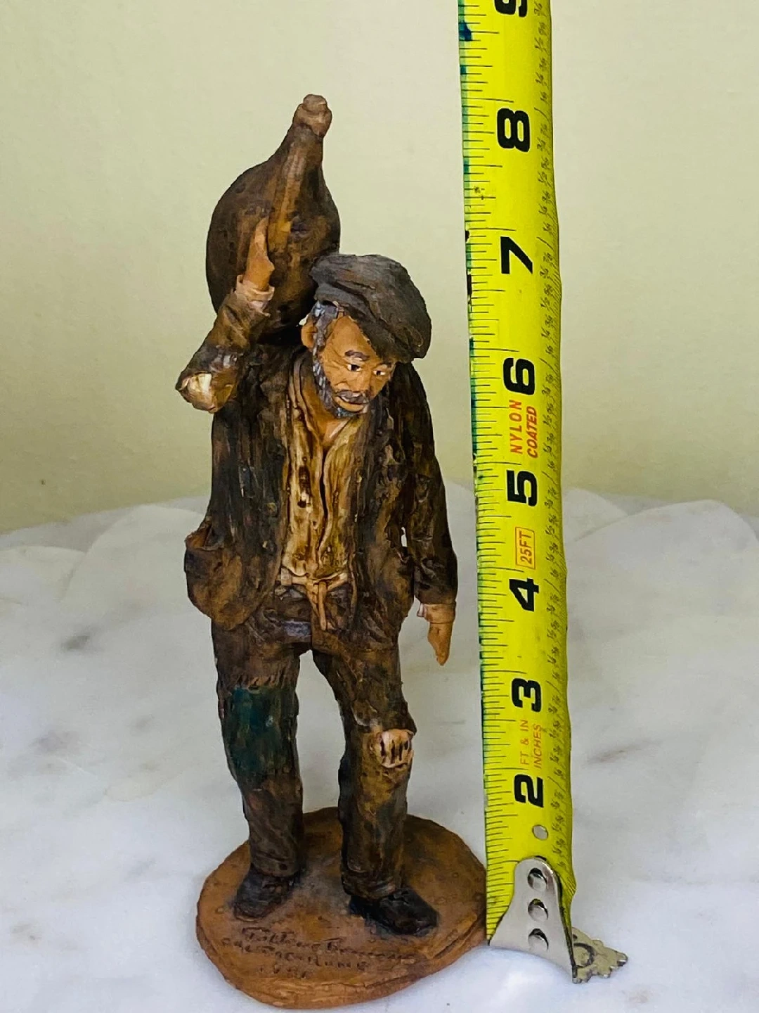 26Selling a Italian clay sculpture signed by artist. It is a detailed figurine of a man carrying a sack. A unique piece for collectors!
