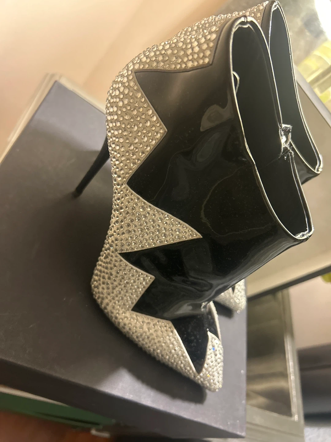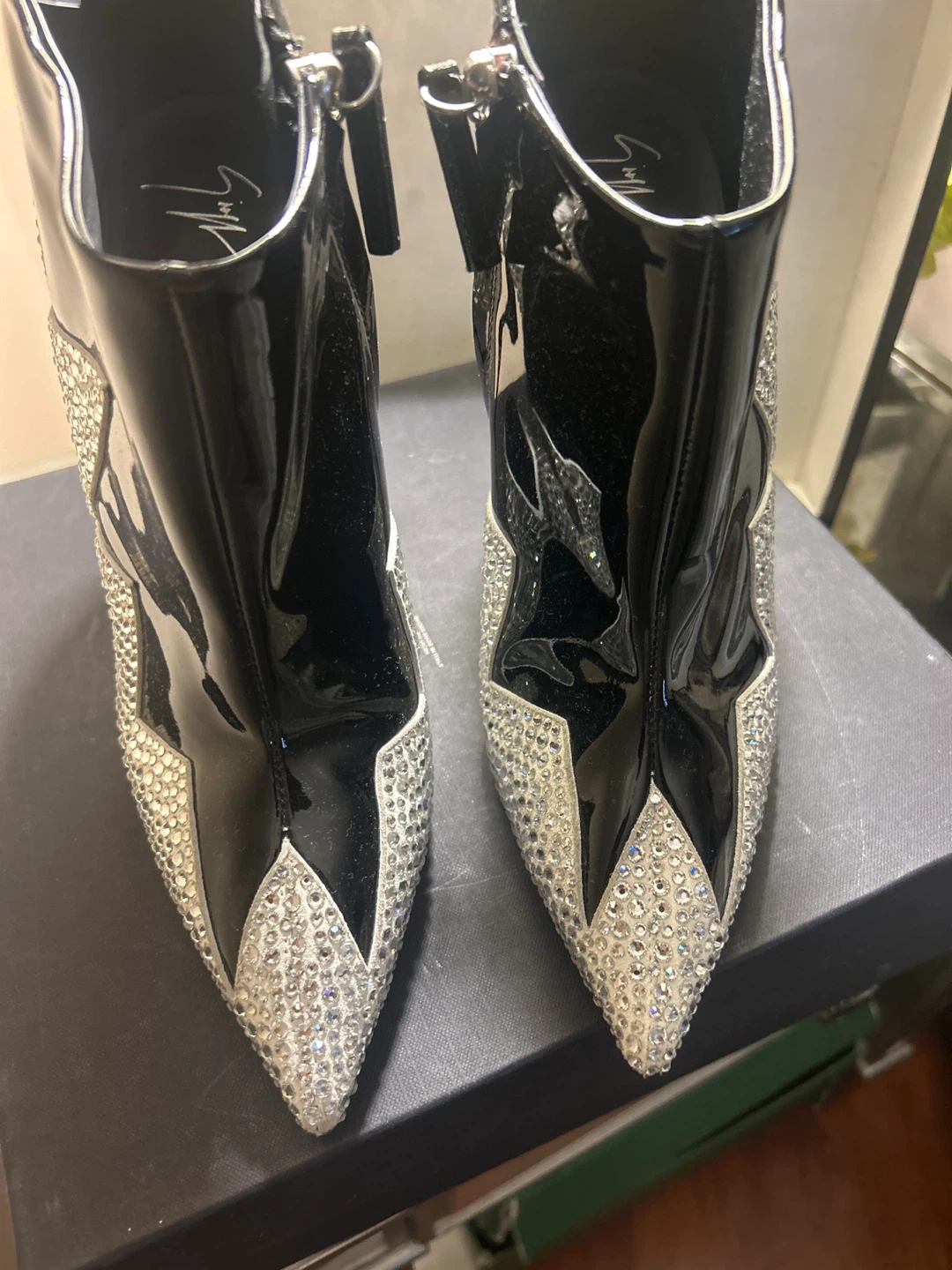 65Selling a pair of Giuseppe Zanotti ankle boots in size 39. These stylish boots feature a black patent leather finish and are adorned with rhinestones. They are in good condition and come with the original box.. authentic!
