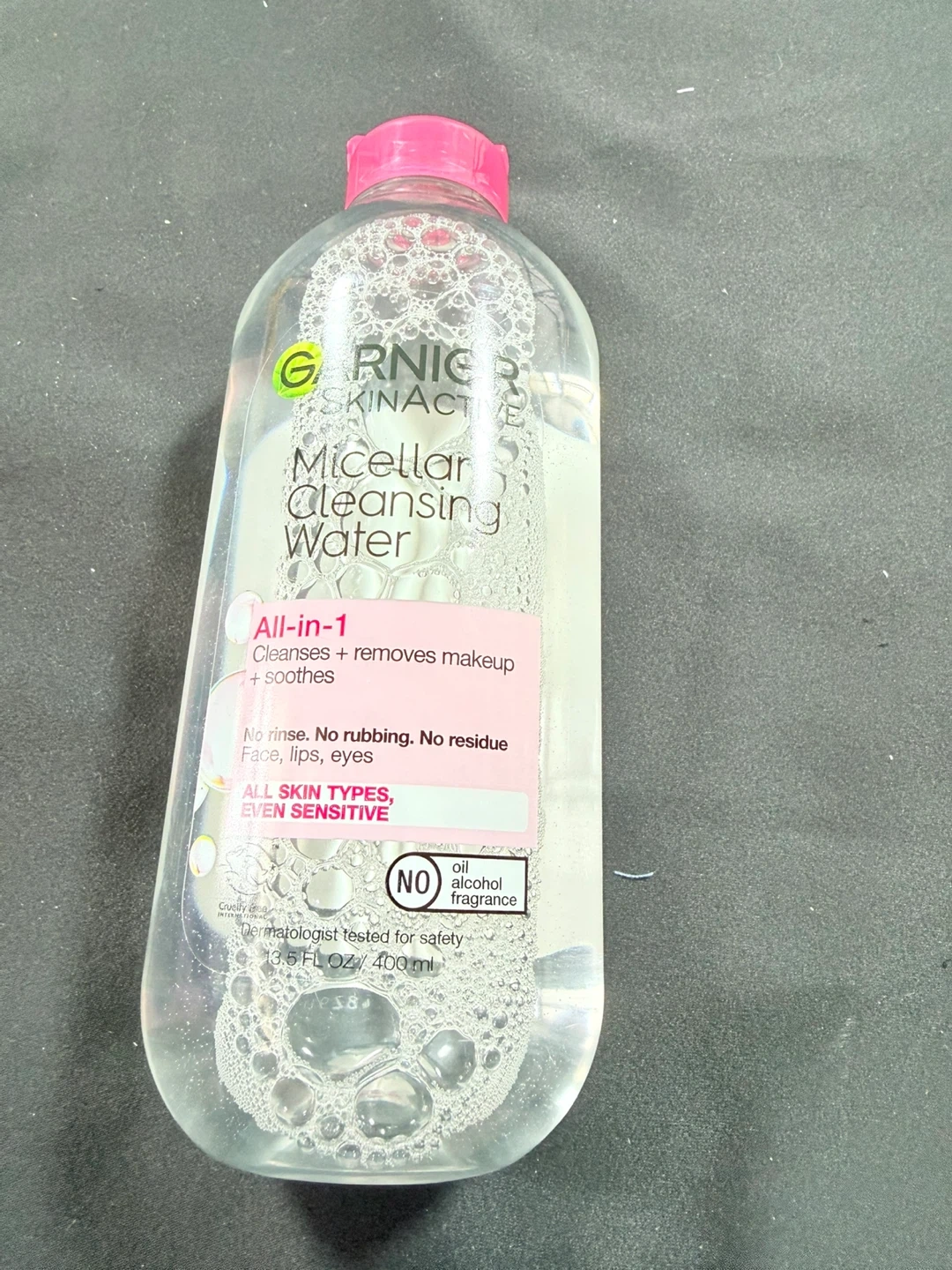 This is Garnier Micellar Cleansing Water, All-in-1 formula for cleansing and removing makeup. It's suitable for all skin types, even sensitive. Dermatologist tested for safety. 400 ml bottle.