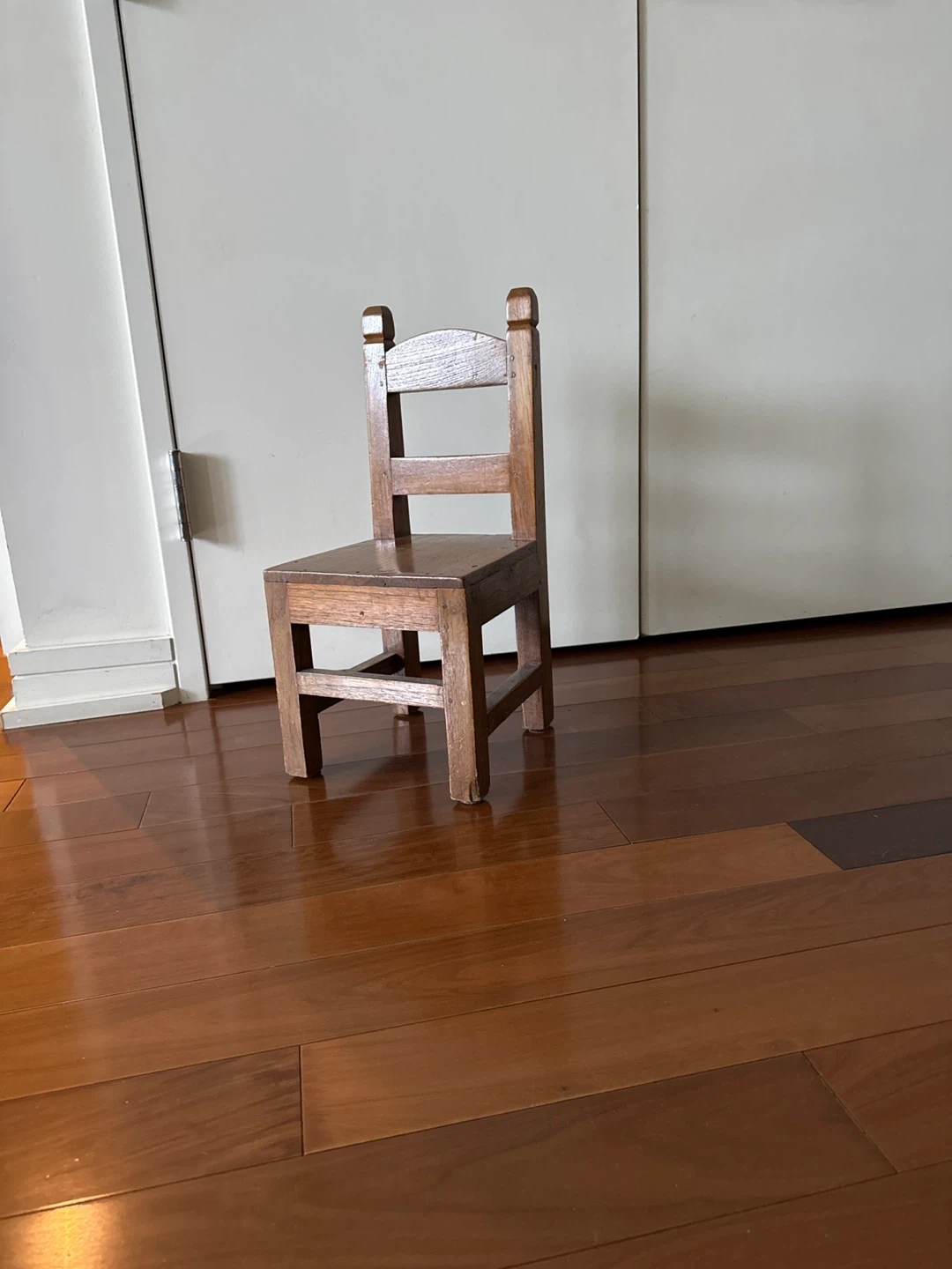 A charming little wooden chair. It's made of solid wood with a rustic finish. This chair is perfect for displaying dolls or as a decorative accent piece!