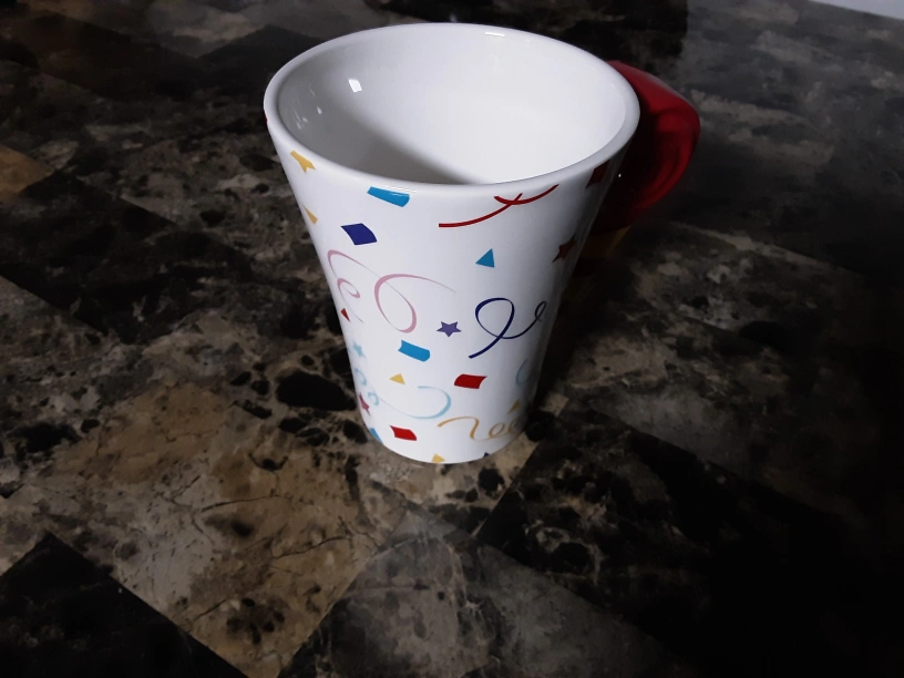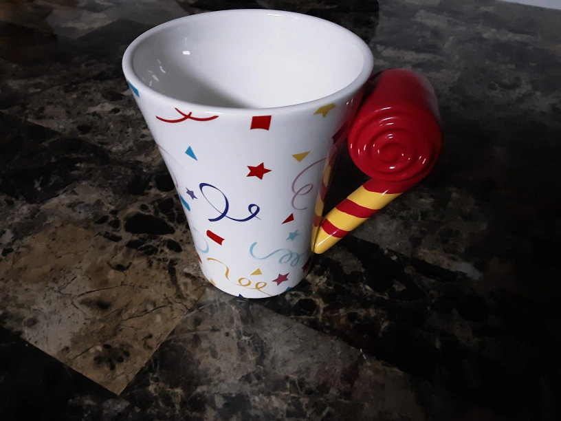 White mug with a party horn handle. Features confetti and ribbon pattern. Great for birthdays or celebrations.