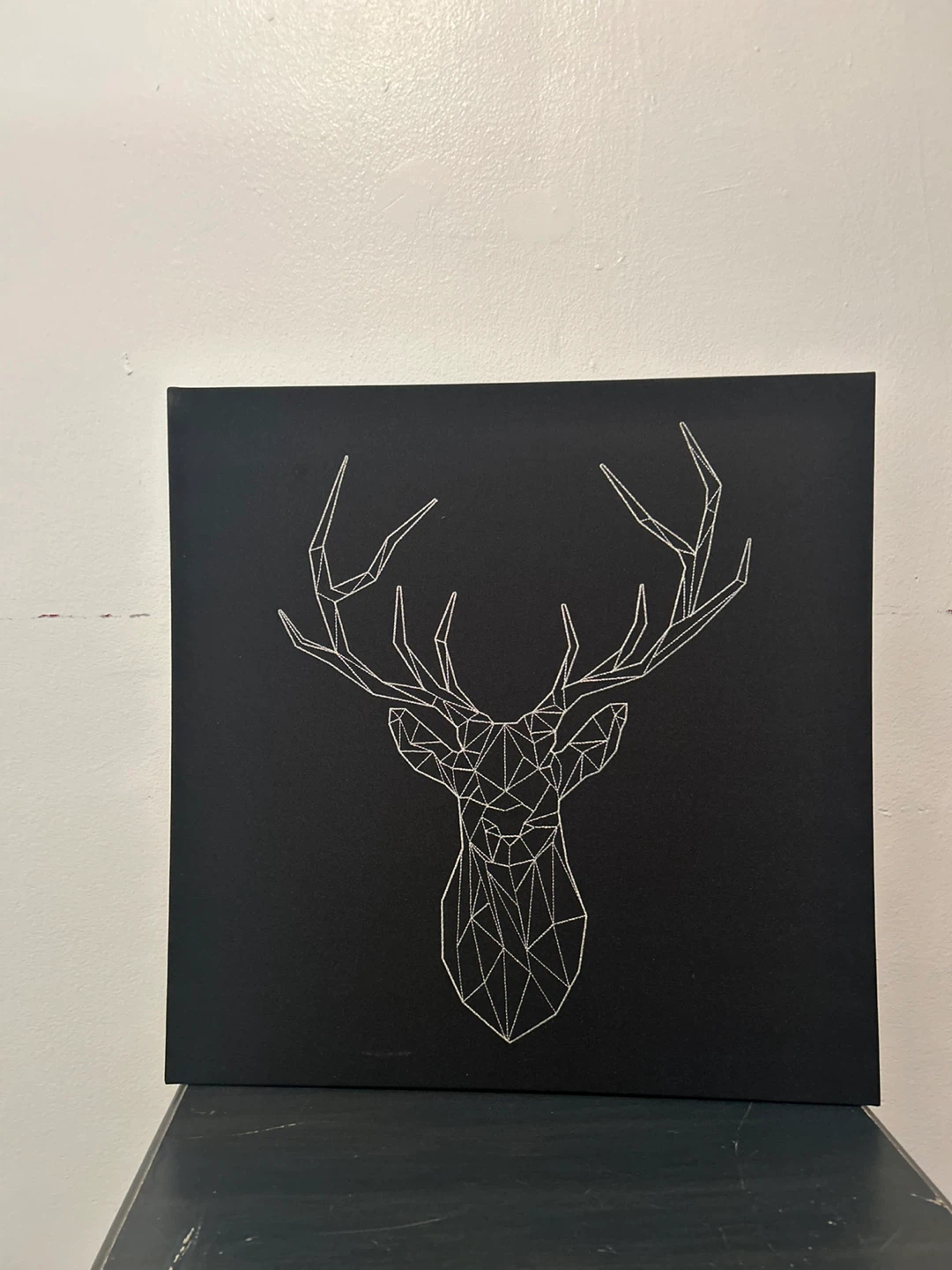 Selling a canvas wall art piece featuring a geometric deer head design. The canvas is black with a white line art design. It measures approximately 24x24 inches, making it a great statement piece for any room