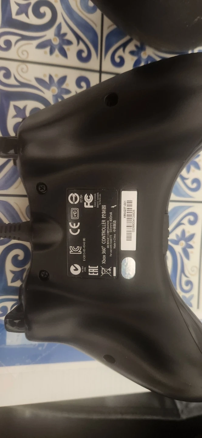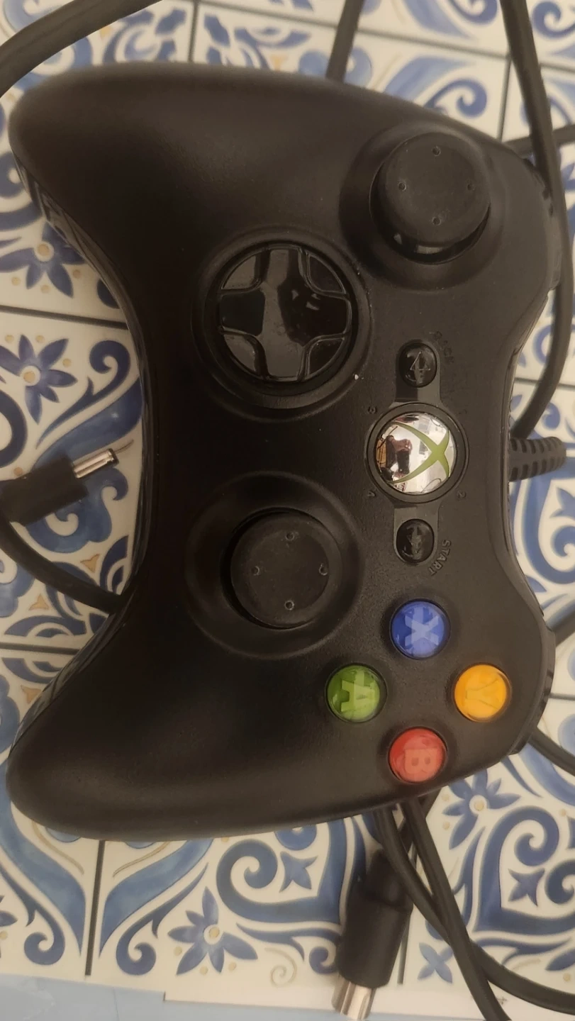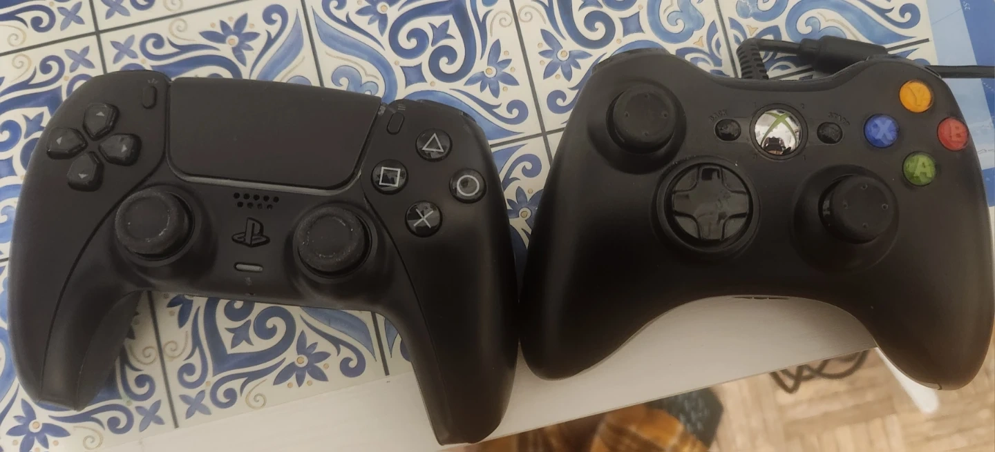 Includes a black PlayStation 5 DualSense wireless controller and a black Xbox 360 wired controller. Both controllers are in used condition.
