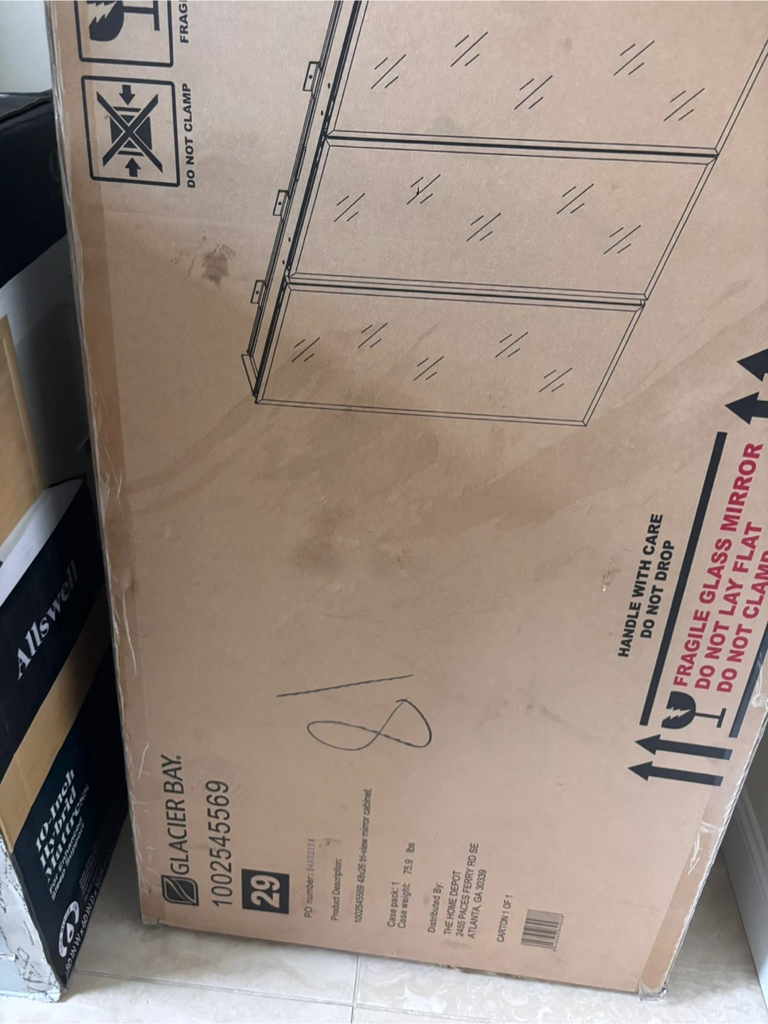 Selling a brand new Glacier Bay 48x26 tri-view mirror cabinet, still in its original packaging! The box indicates the product description is 1002545569 48x26 tri-view mirror cabinet. The case weight is 75.9 lbs