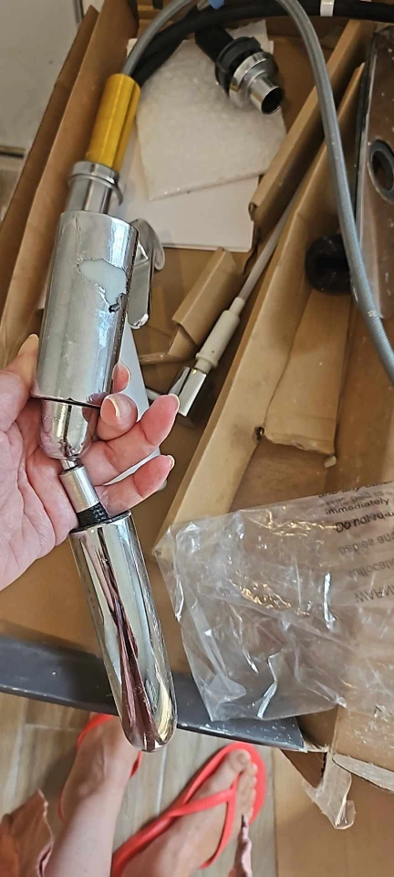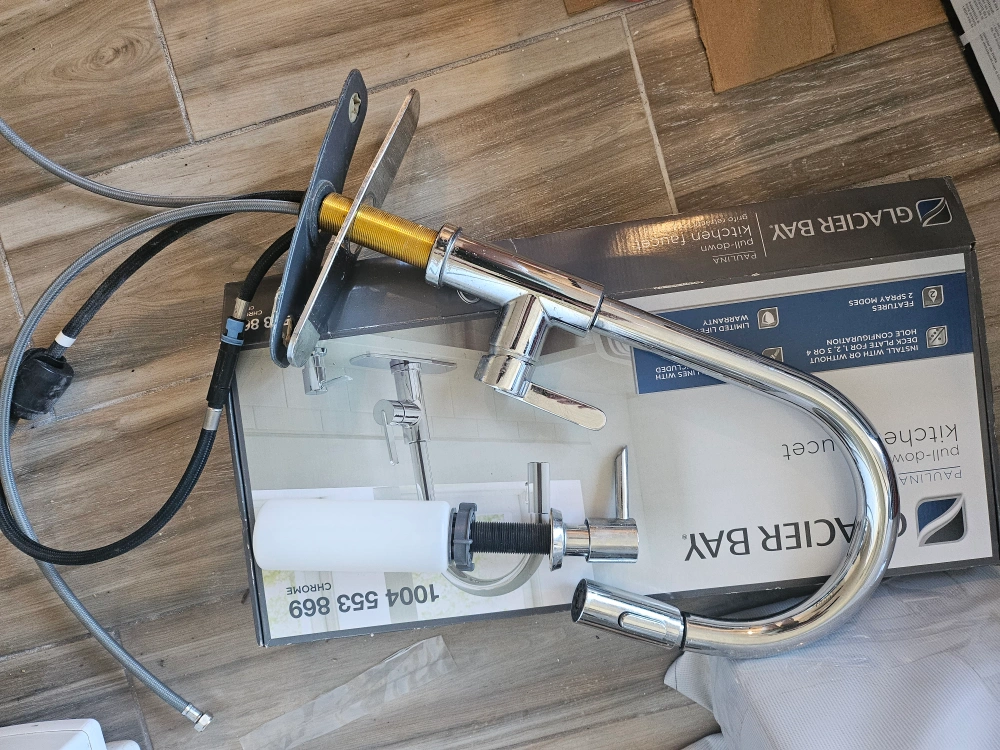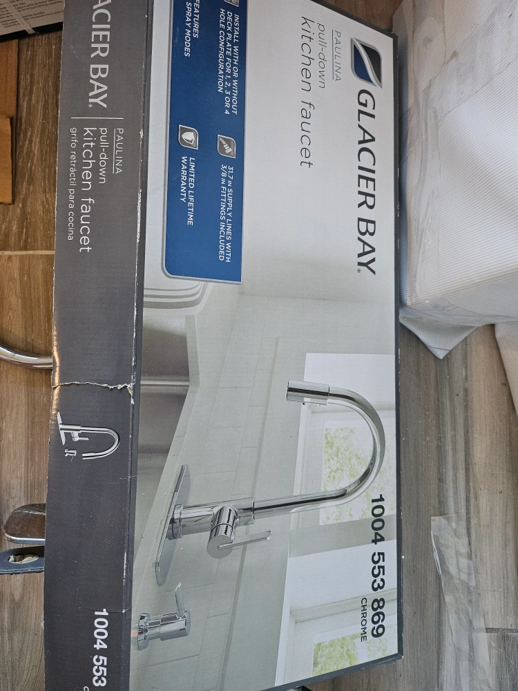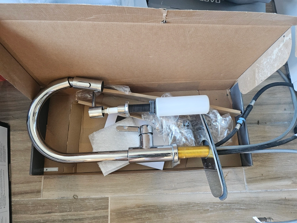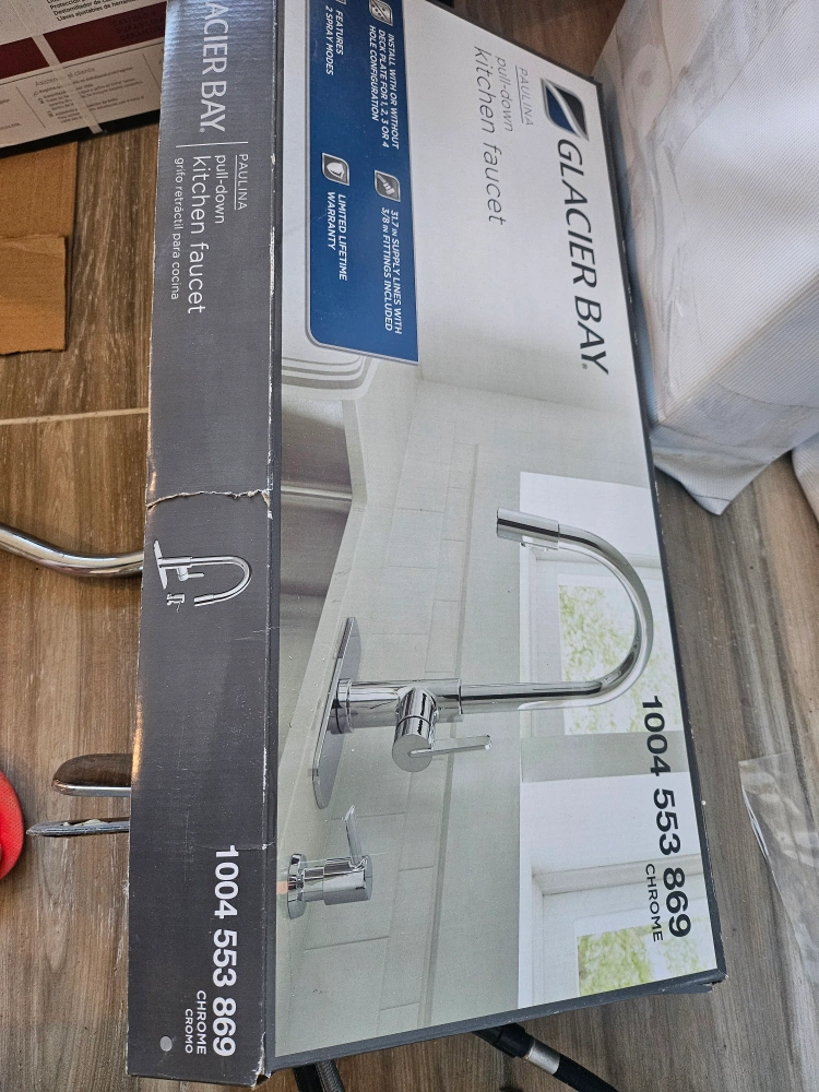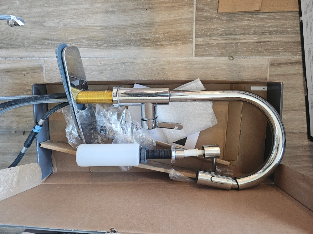 168*!* it is a scratched. Please check the last photo *!* in original box, chrome pull-down kitchen faucet. Used just a few months, never installed soap dispenser included. Model 1004 553 869.