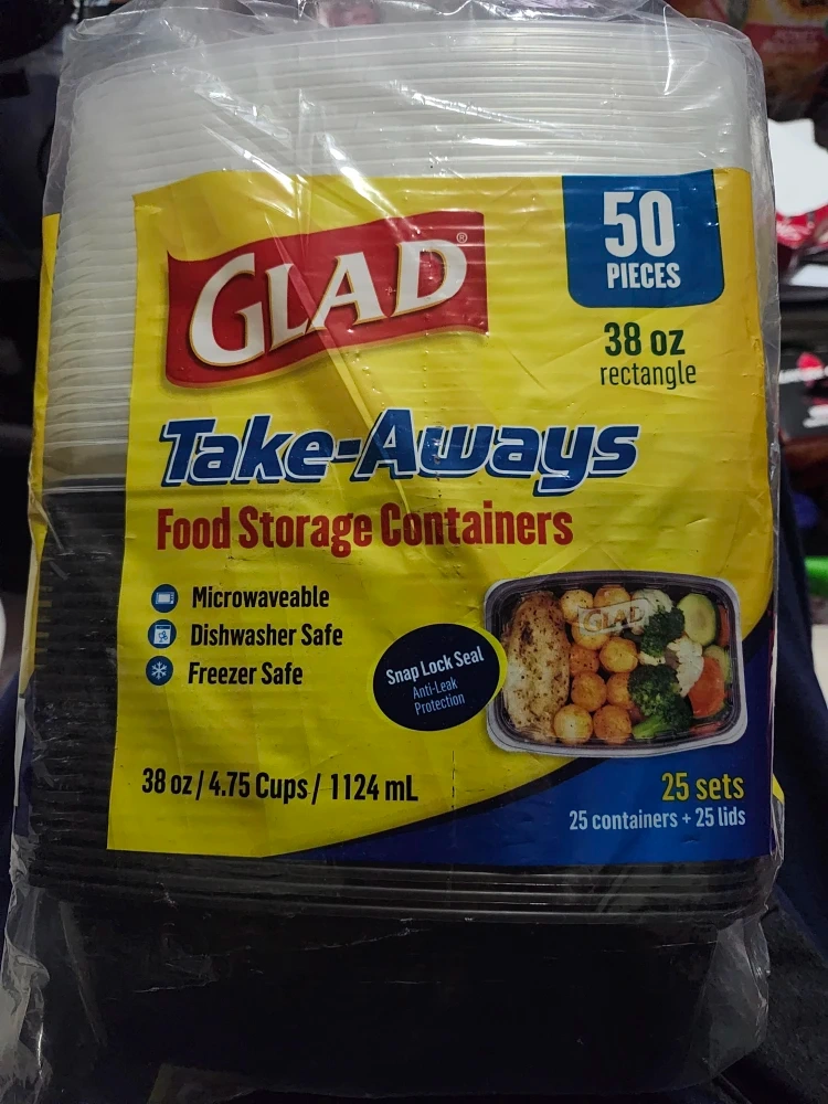 630Selling a set of GLAD Take-Aways food storage containers. This set includes 50 pieces, with 25 containers and 25 lids. Each container is 38 oz / 4.75 Cups / 1124 mL. They're microwaveable, dishwasher safe, and freezer safe. The containers also feature a snap lock seal for anti-leak protection