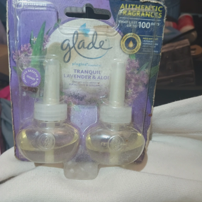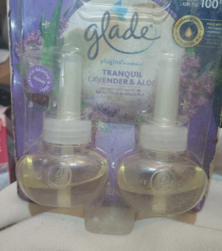 Selling a Glade Plugins Scented Oil refill in Tranquil Lavender & Aloe. It's designed to last up to 100 days. Infused with essential oils, it's made without phthalates, formaldehyde, or artificial colors. Get ready to scratch, breathe, and feel!