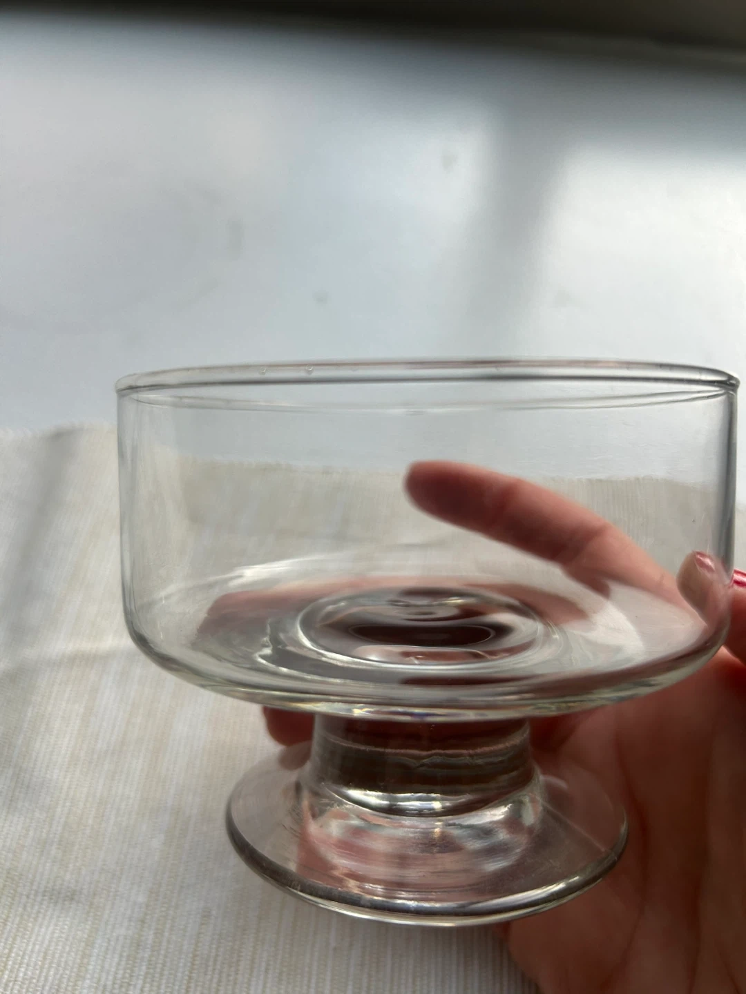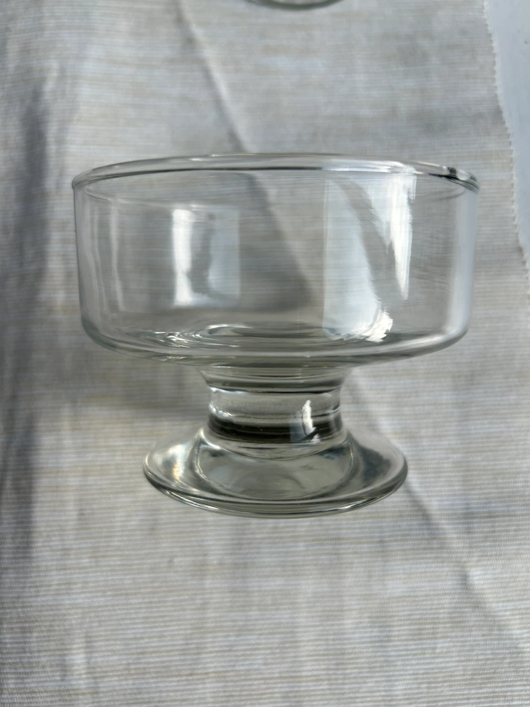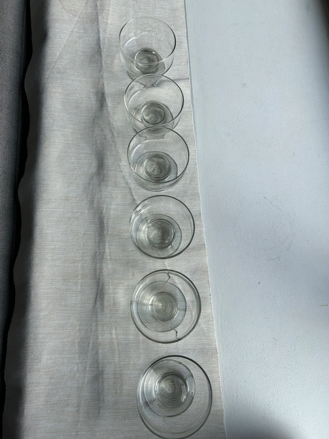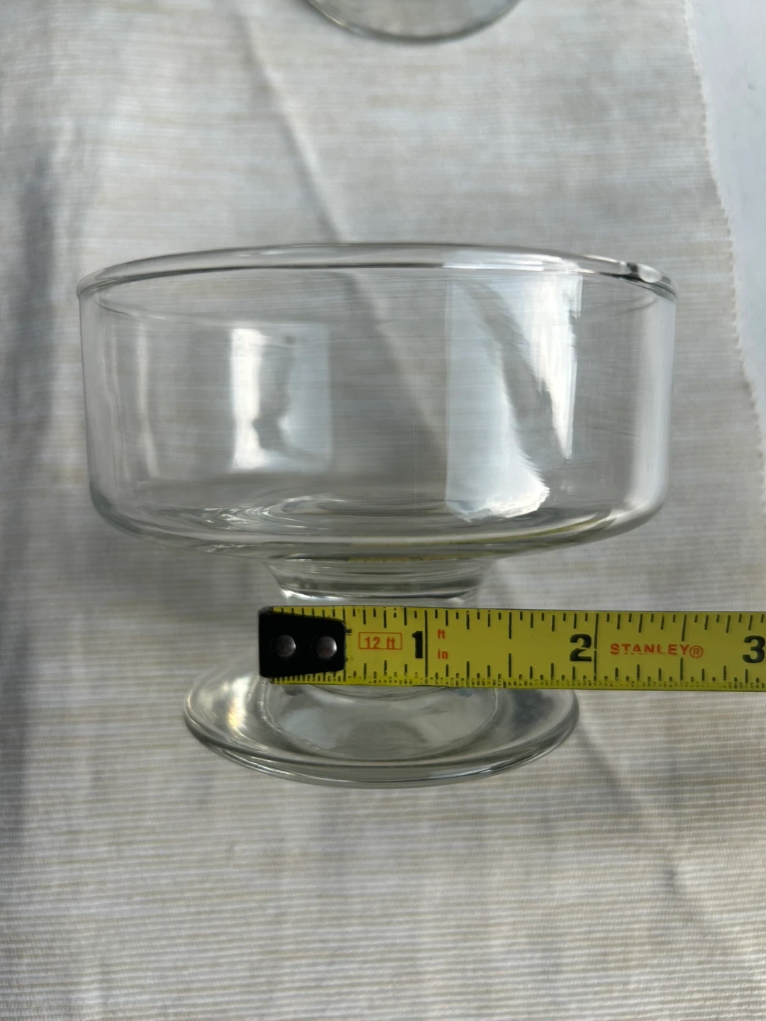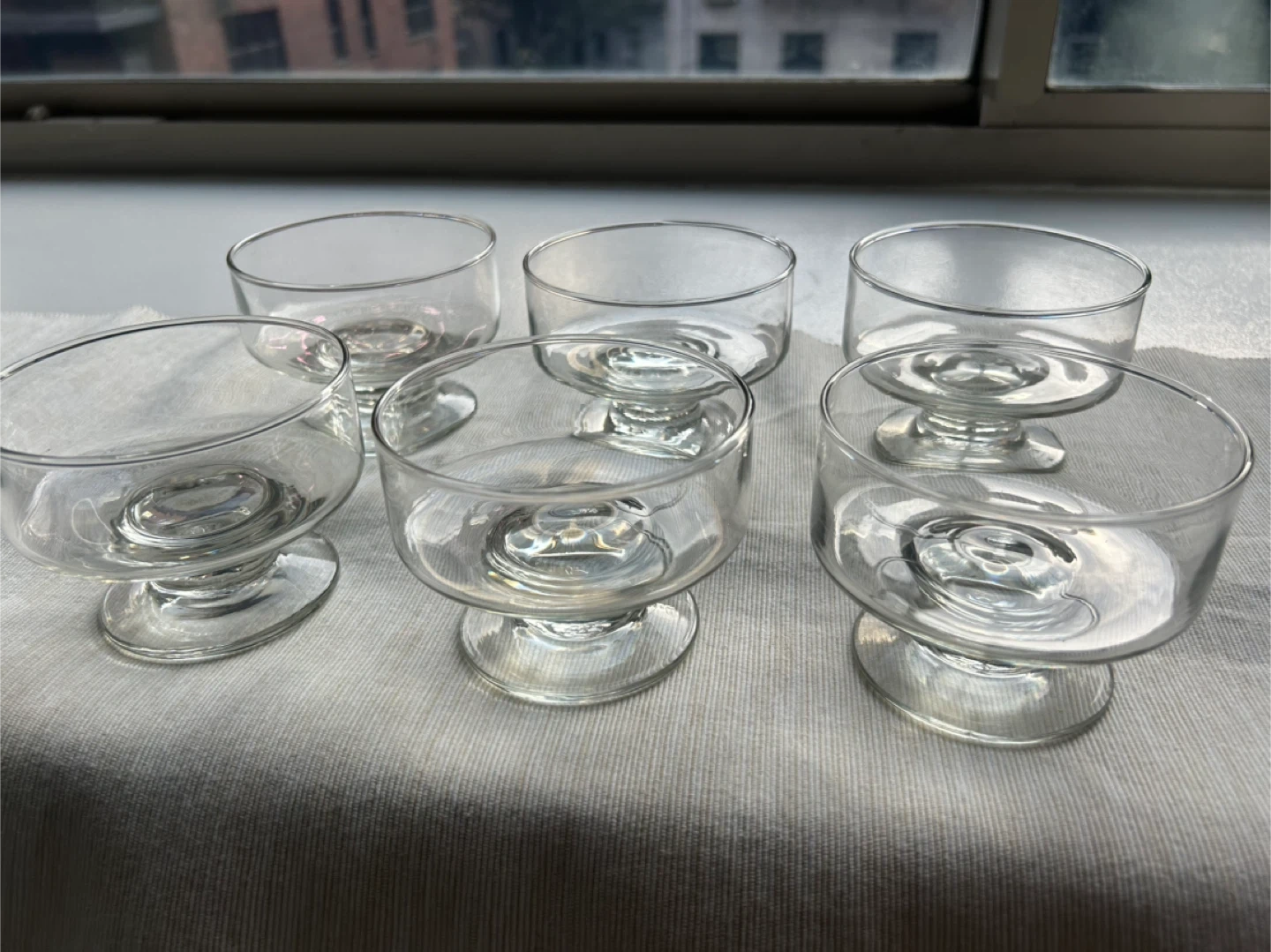 71Small, glass bowls. Set of 6, one has a small crack in it, but still functions. These are not microwave safe and can’t withstand warm items. Suggest cold items only. Only selling as a set of 6 for $25