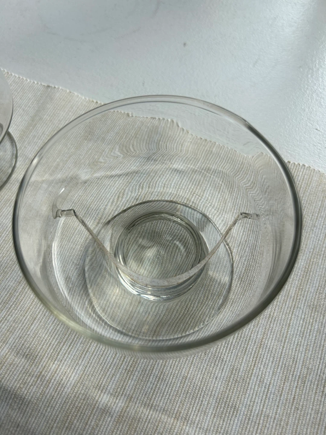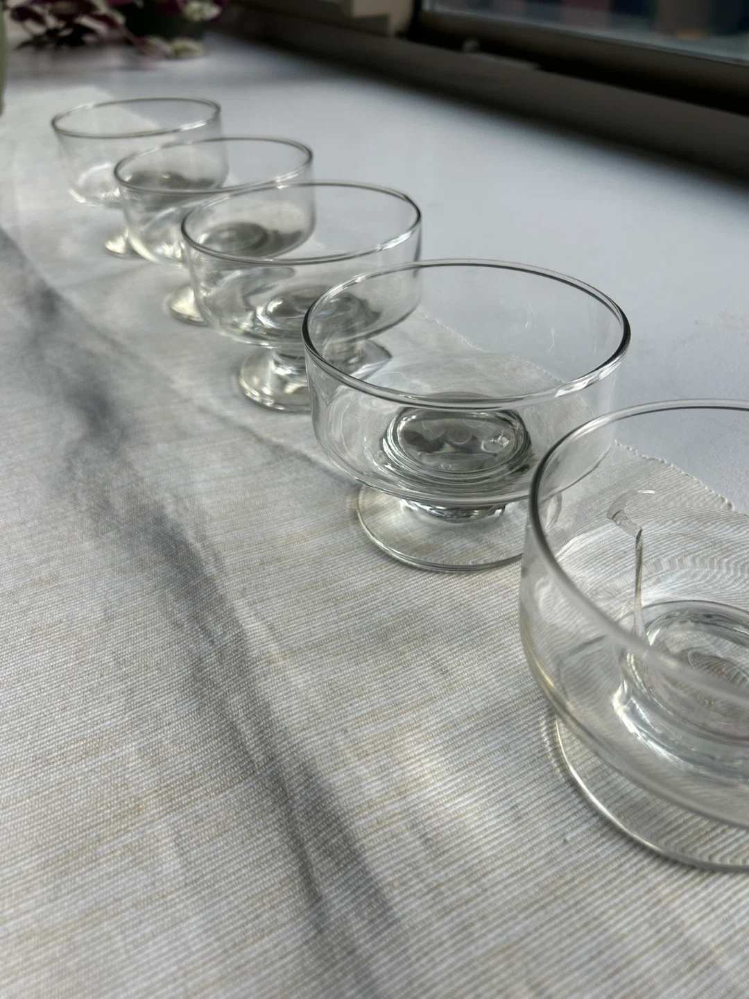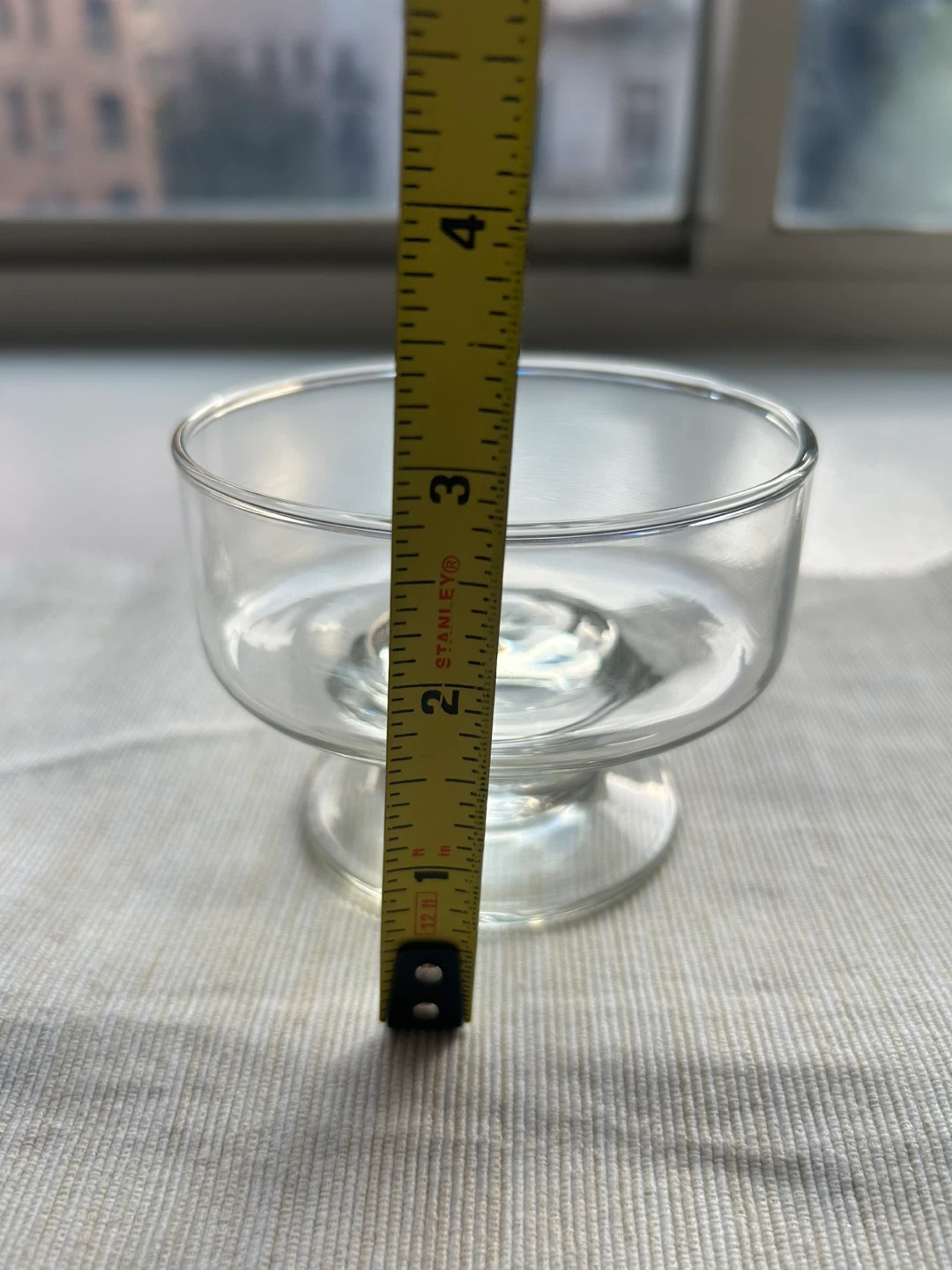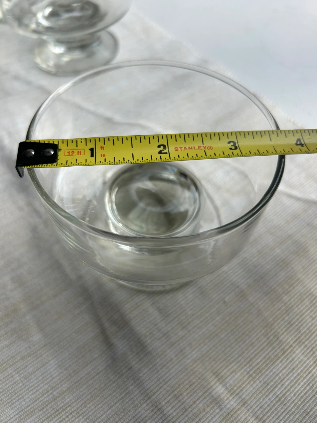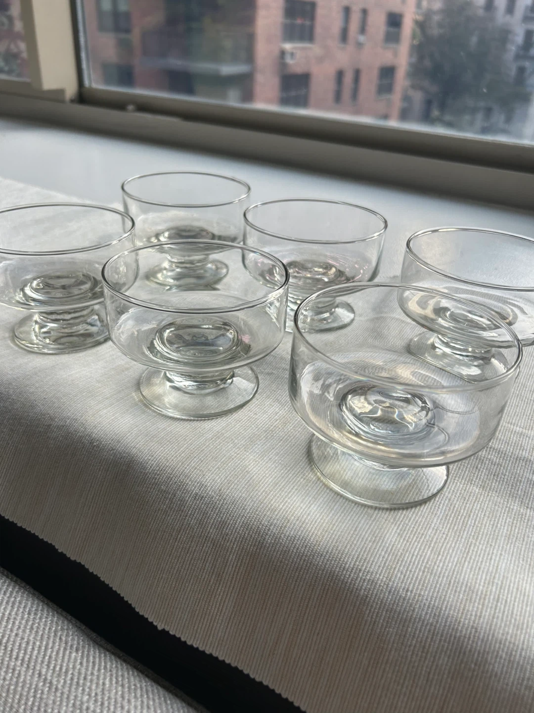 71Small, glass bowls. Set of 6, one has a small crack in it, but still functions. These are not microwave safe and can’t withstand warm items. Suggest cold items only. Only selling as a set of 6 for $25