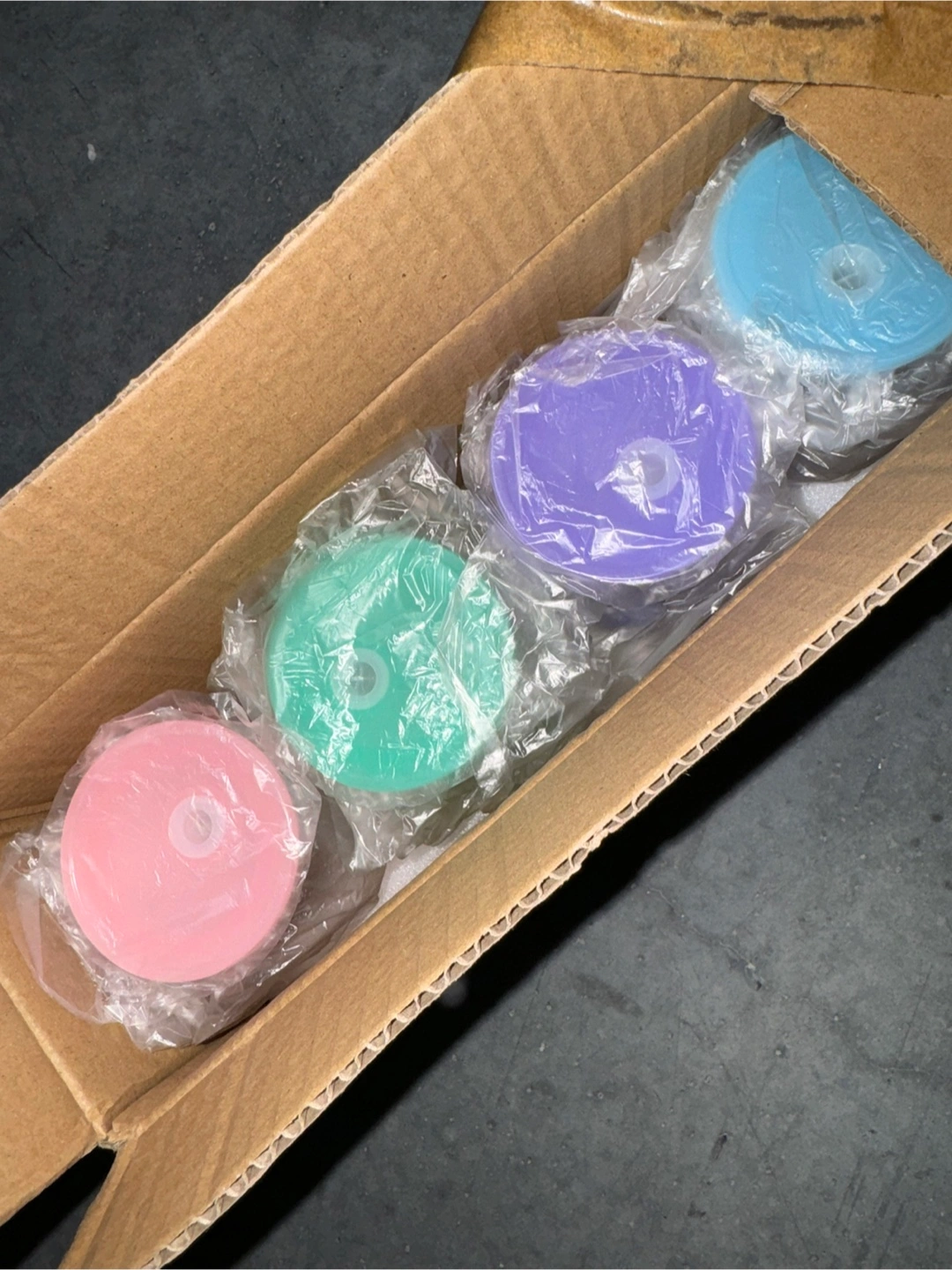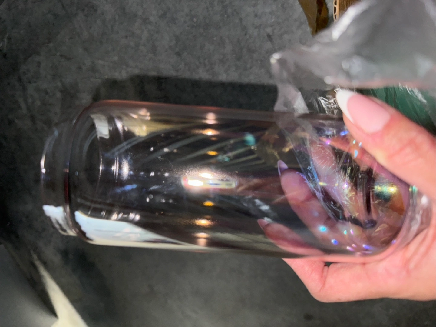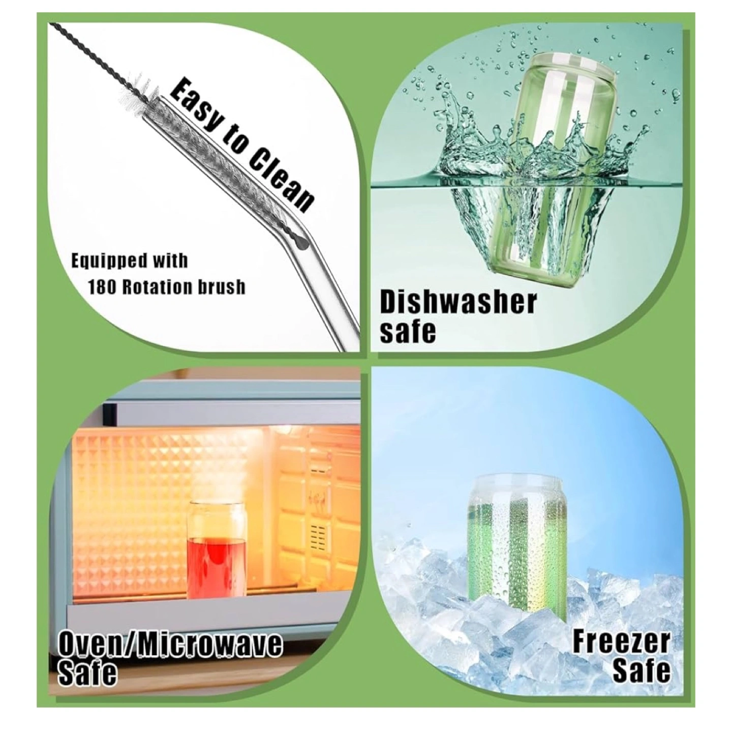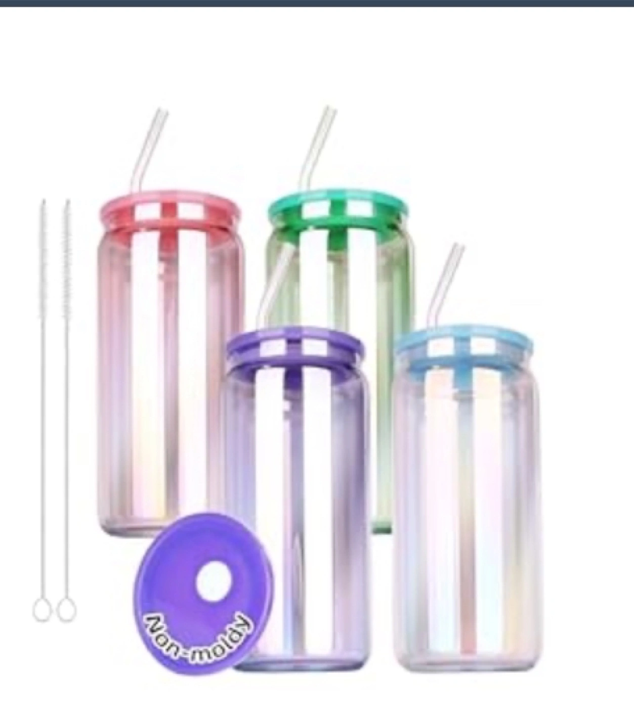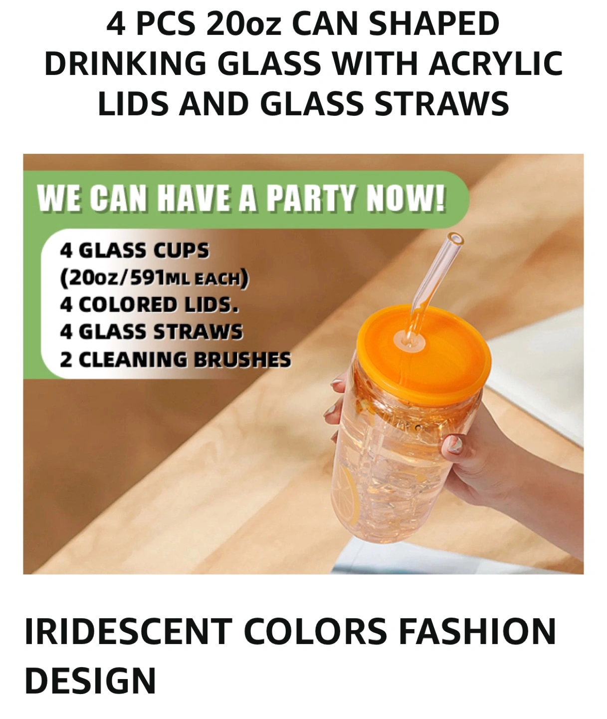 Rainbow Glass Cups Set of four 20oz iridescent can-shaped drinking glasses. Includes four colored acrylic lids and four glass straws. Two cleaning brushes also included. Dishwasher, oven, microwave, and freezer safe. Great for parties!
