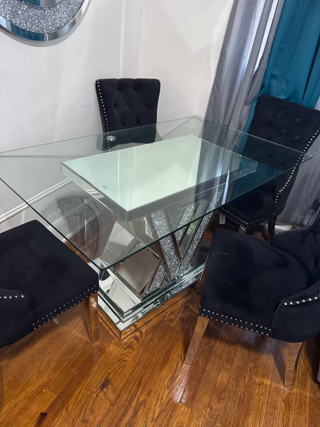 60Selling a beautiful glass dining table with four stylish black chairs! The table features a unique, mirrored V-shaped base with sparkling accents that add a touch of glamour to any dining space. The chairs are upholstered in a soft, black material and have a classic design with silver nailhead trim. They're perfect for adding a touch of elegance to your home! In great condition, was only used as decorative piece in home Owner moving, need to sell ASAP