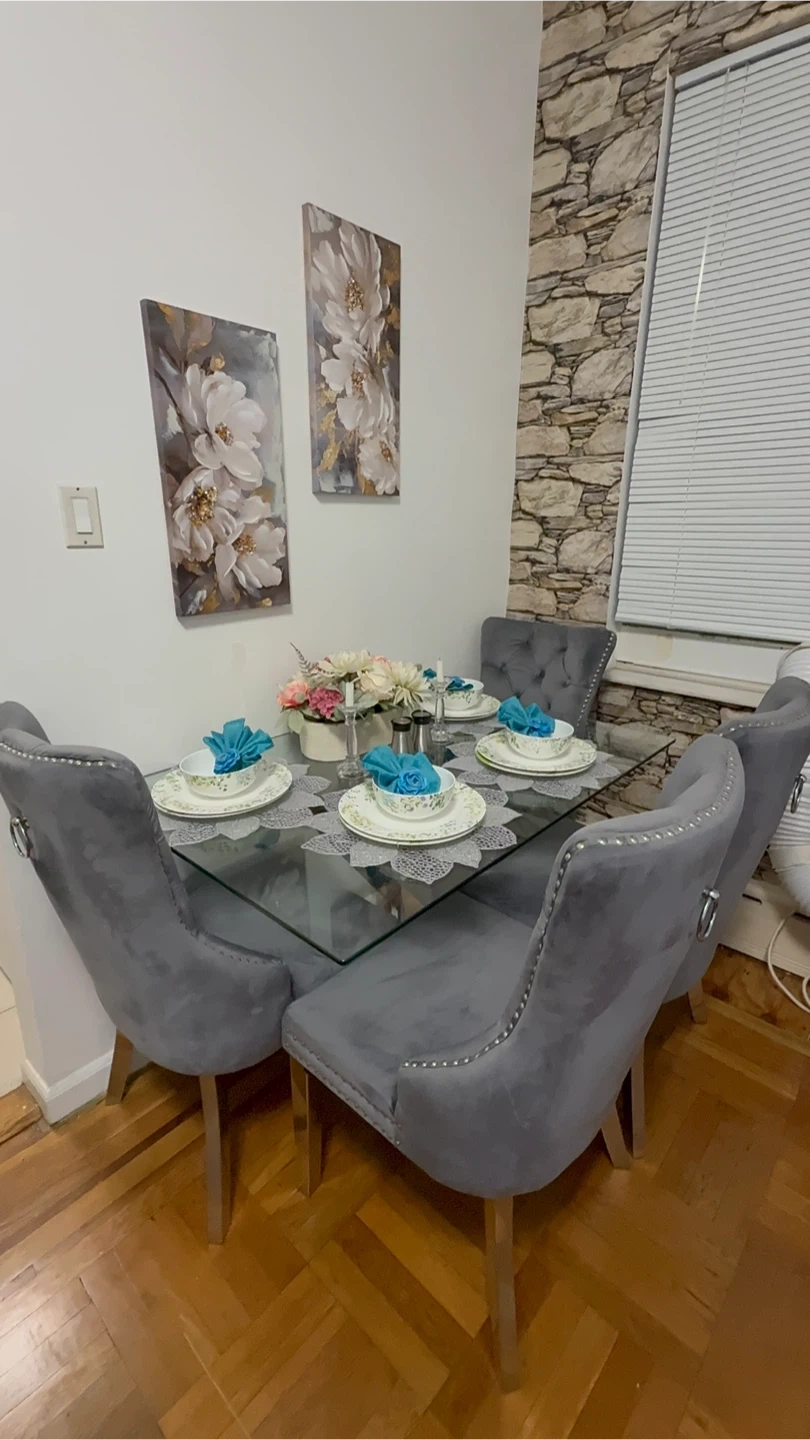 Selling a dining table with a glass top and four gray chairs. The chairs have a tufted design and silver accents. It's a stylish set that would look great in any dining room!