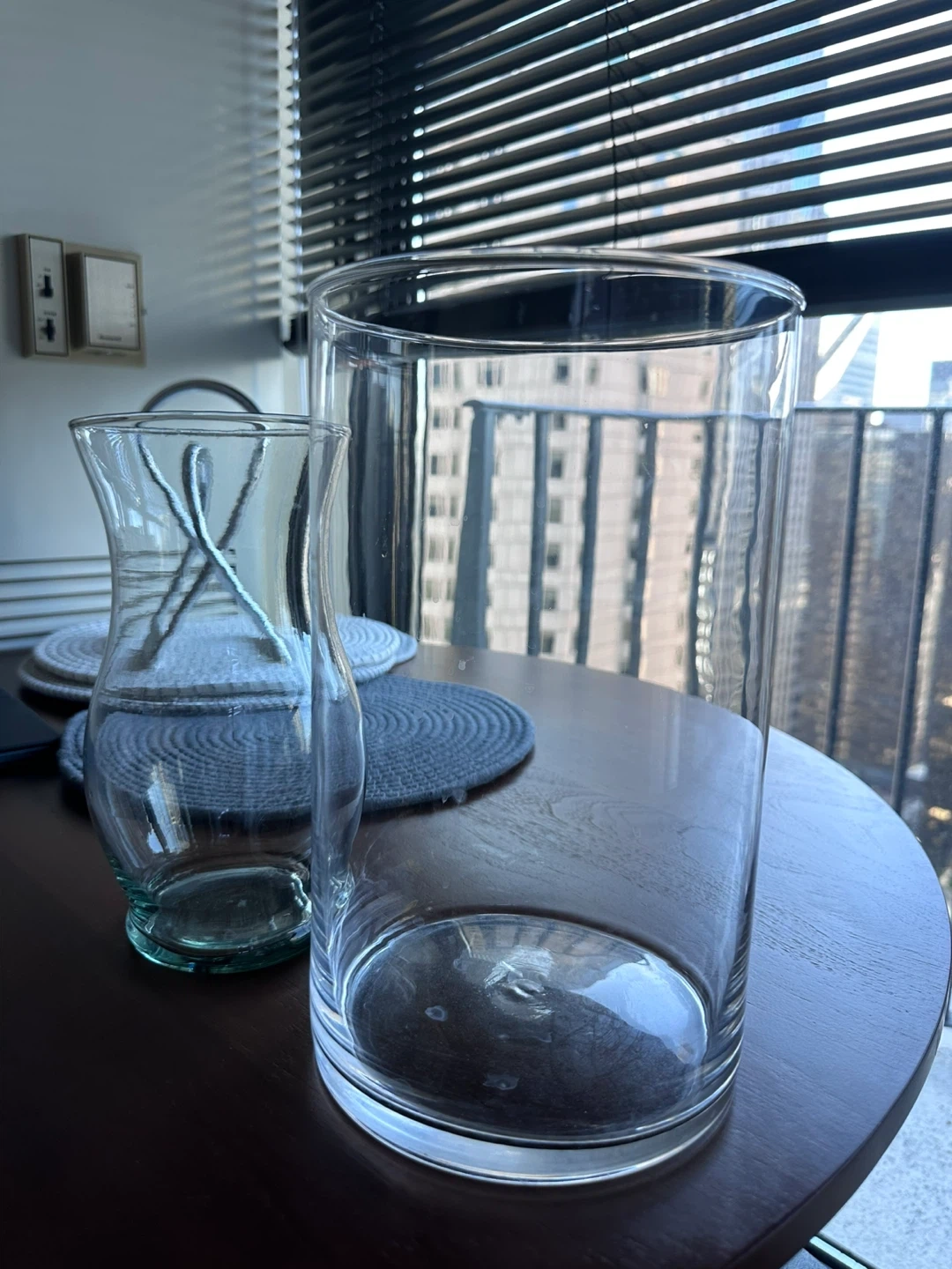 10I'm selling a set of two glass flower vases. They're perfect for adding a touch of elegance to any room. One vase is taller and cylindrical, while the other has a more curved shape. They're both in great condition and ready to display your favorite flowers