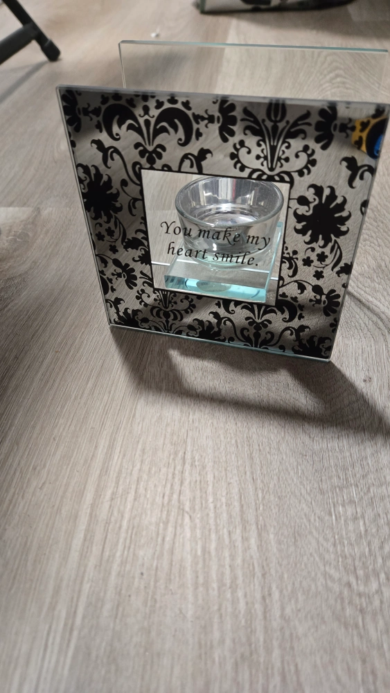 99This is a glass picture frame with a built-in candle holder. The frame has a black and white floral design around the edges, and the candle holder is a small, clear glass cup. The text on the frame says, "You make my heart smile"