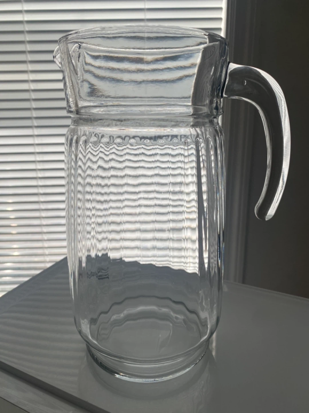 420Selling a clear glass pitcher. It measures approximately 9.5 inches tall and 4 inches in diameter.
