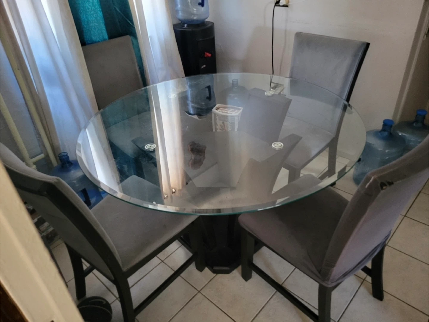 Selling a round glass dining table with four chairs. The chairs are upholstered in a gray fabric. The table has a clear glass top and a dark base. Moving and it’s in great condition and ready for a new home!