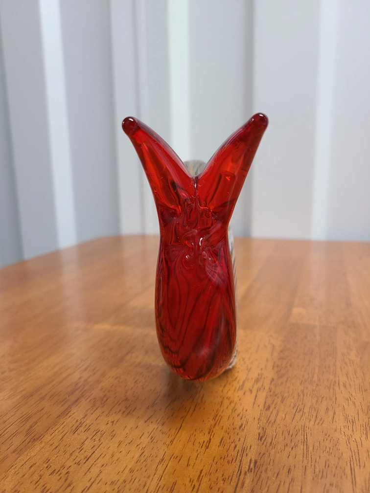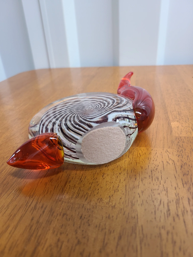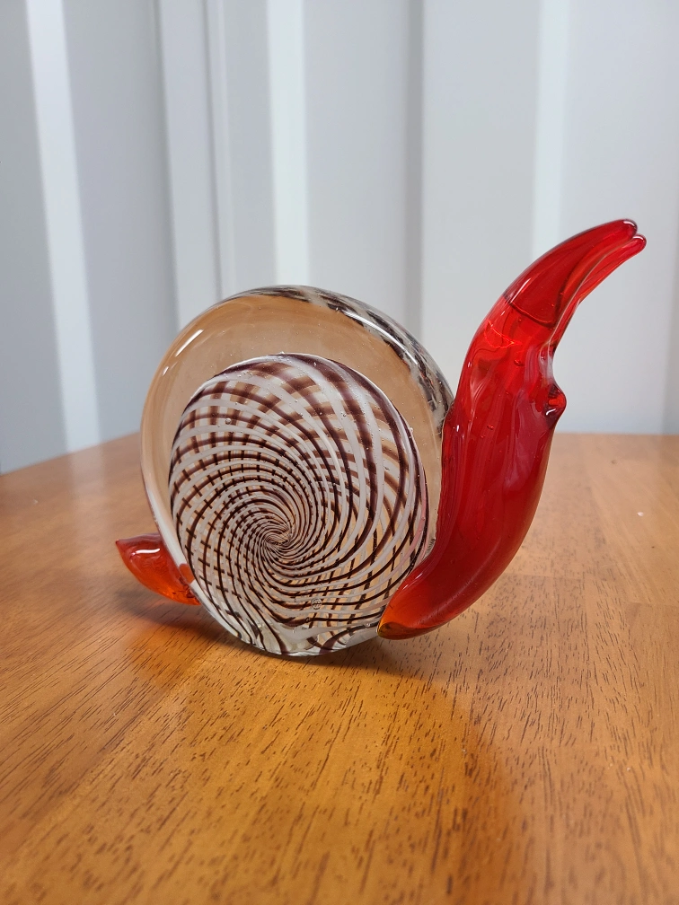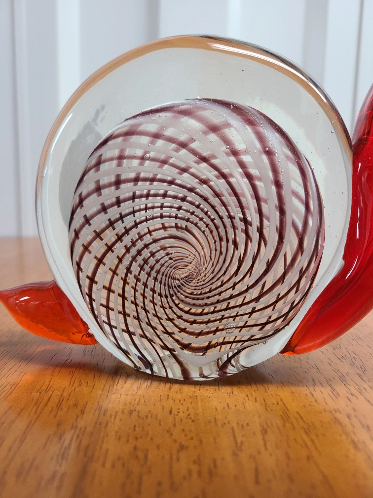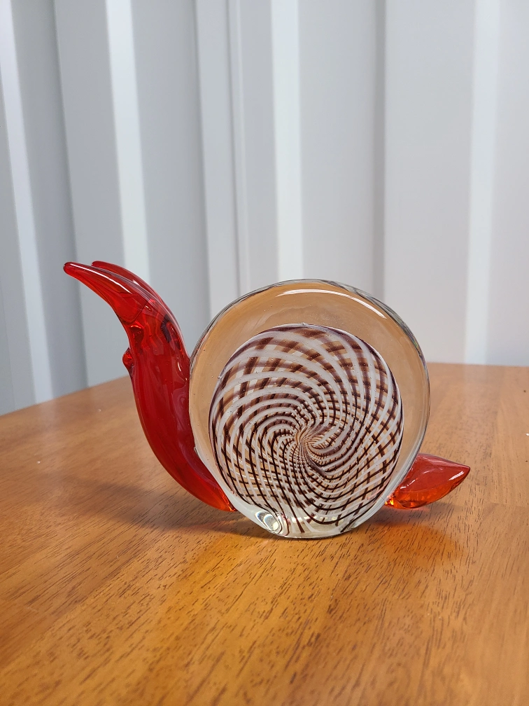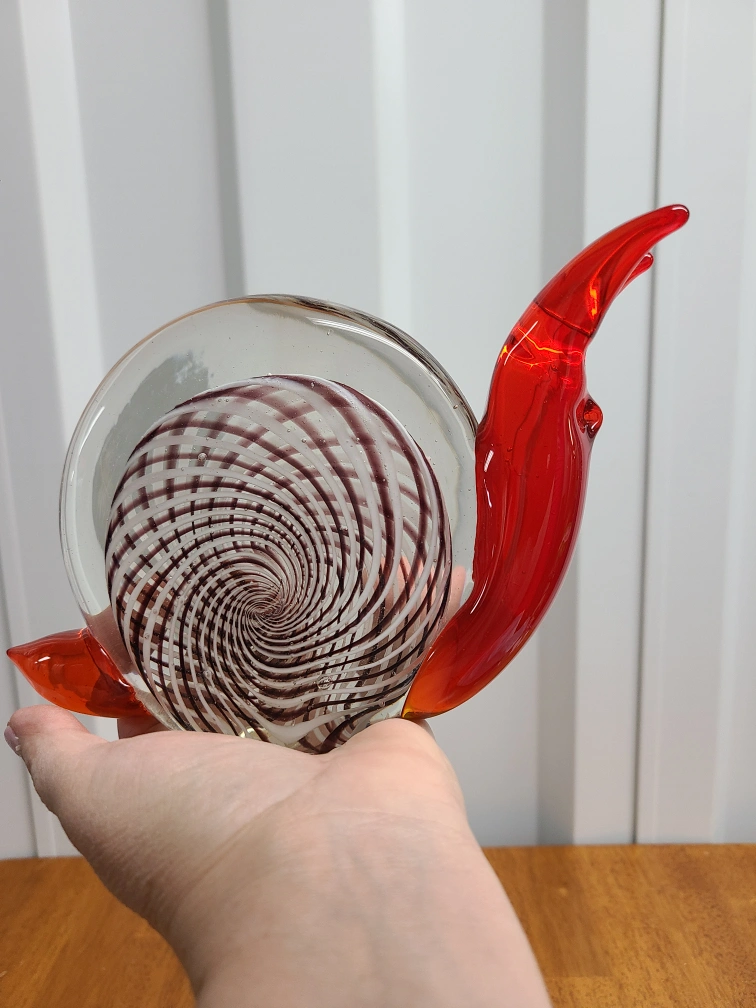 Unique glass snail figurine with a red head and clear shell with a spiral design inside Adds a touch of whimsy to any space