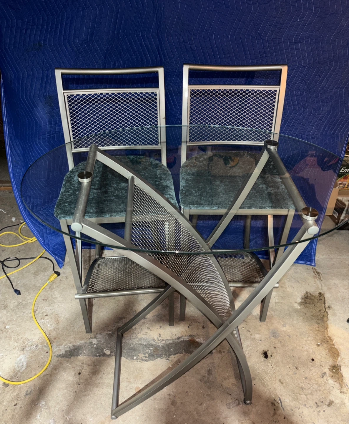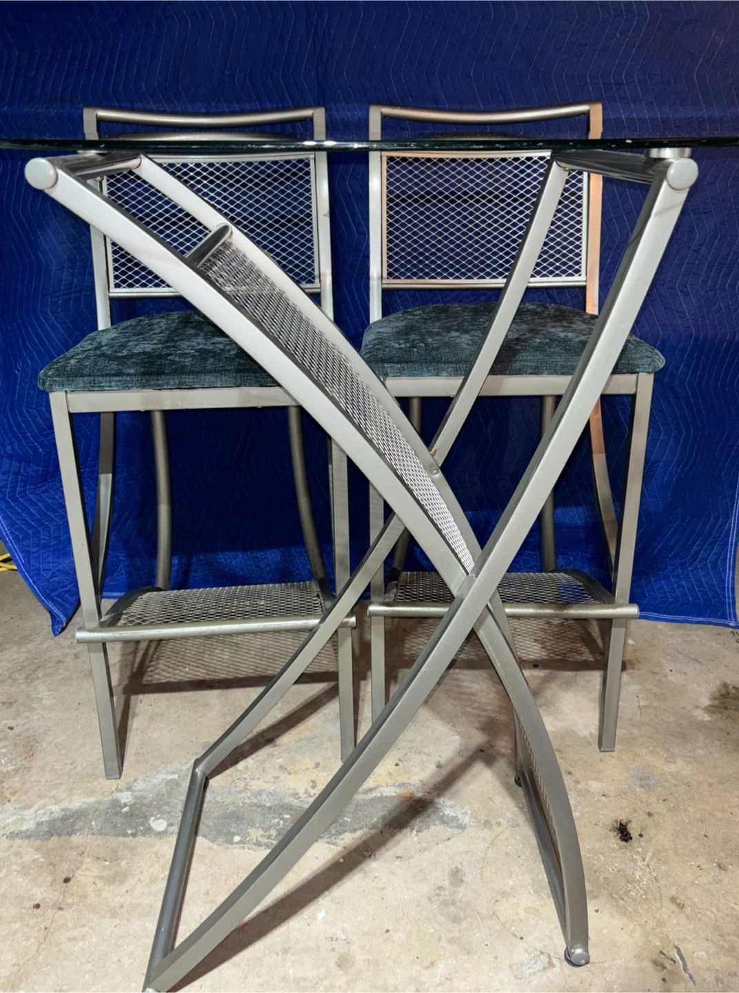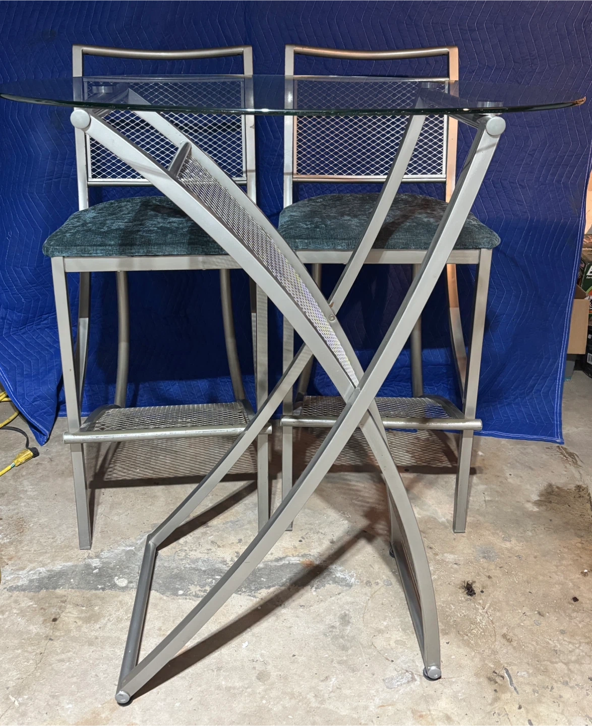 Selling a stylish glass top bar table that comes with two matching chairs! The set features a unique metal frame design and comfortable seating. Perfect for adding a modern touch to your home bar or dining area