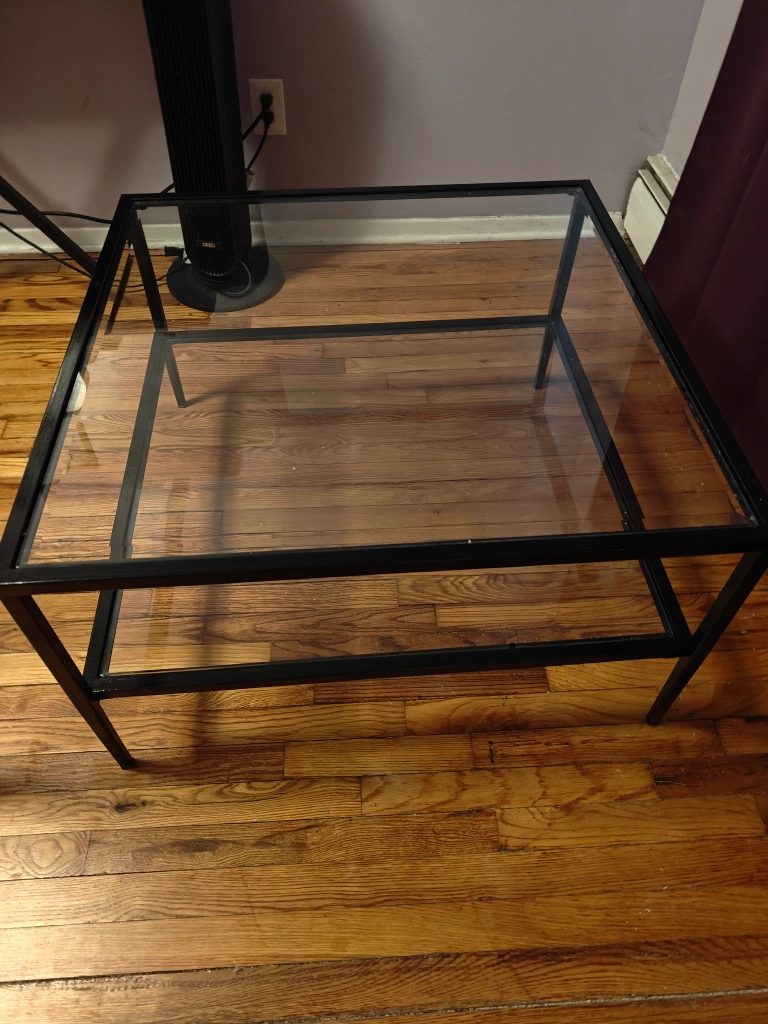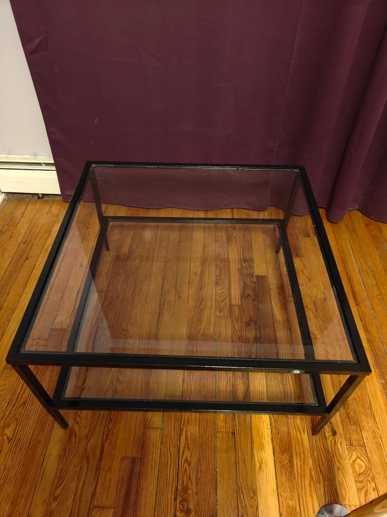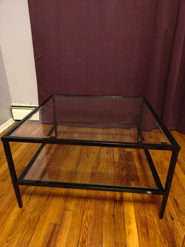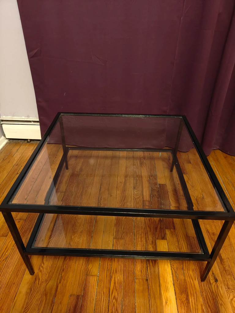 Selling a stylish glass top coffee table with a black metal frame. It's in great condition and would look great in any living room! The table features a modern, minimalist design that's both functional and aesthetically pleasing. recently repainted/refurbished