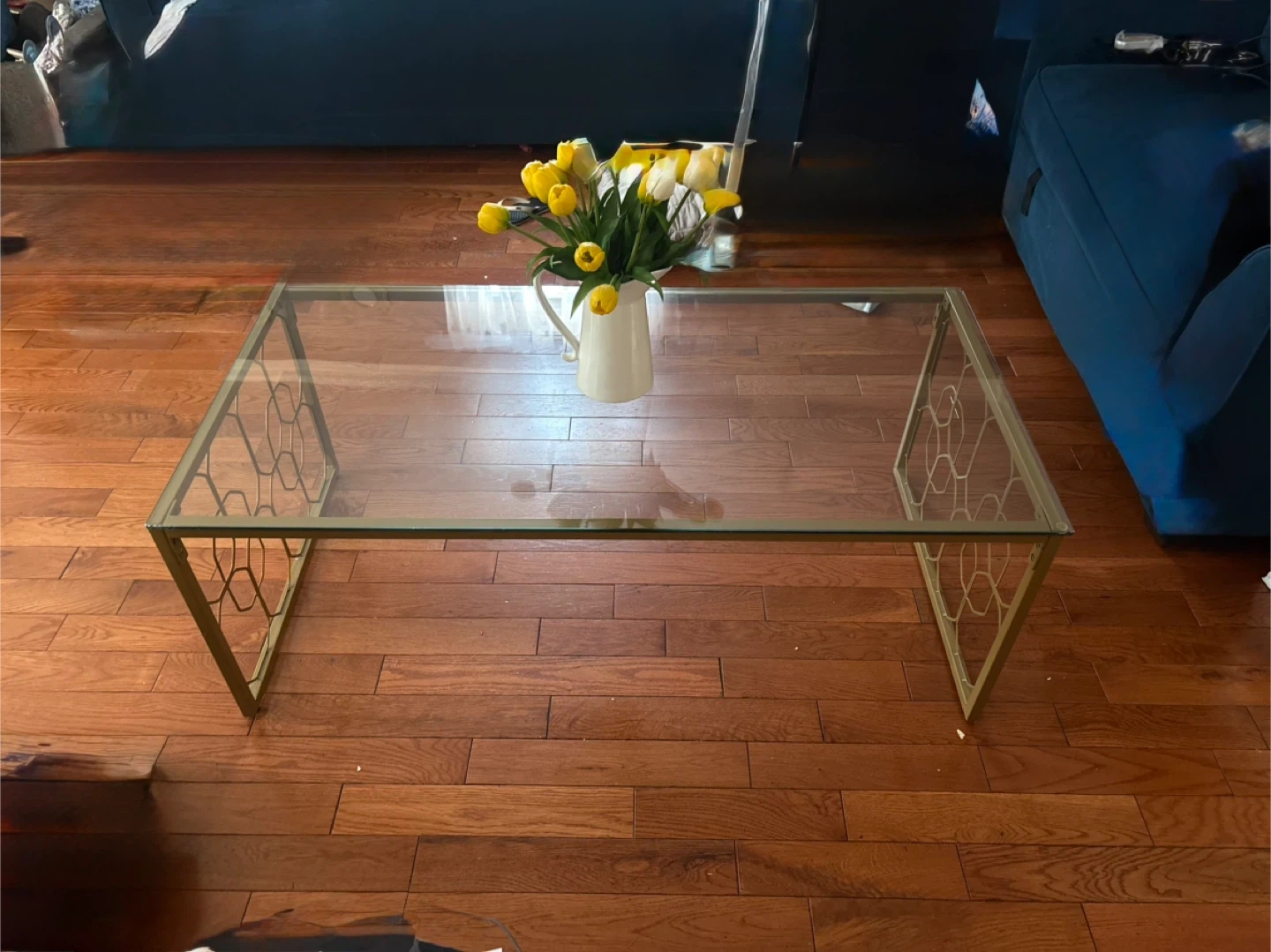 20Selling a glass top coffee table with a gold-colored frame. It has a unique geometric design on the sides. The table is in good condition and would be a stylish addition to any living room. height 45 inches ,2ft wide, 4ft long
