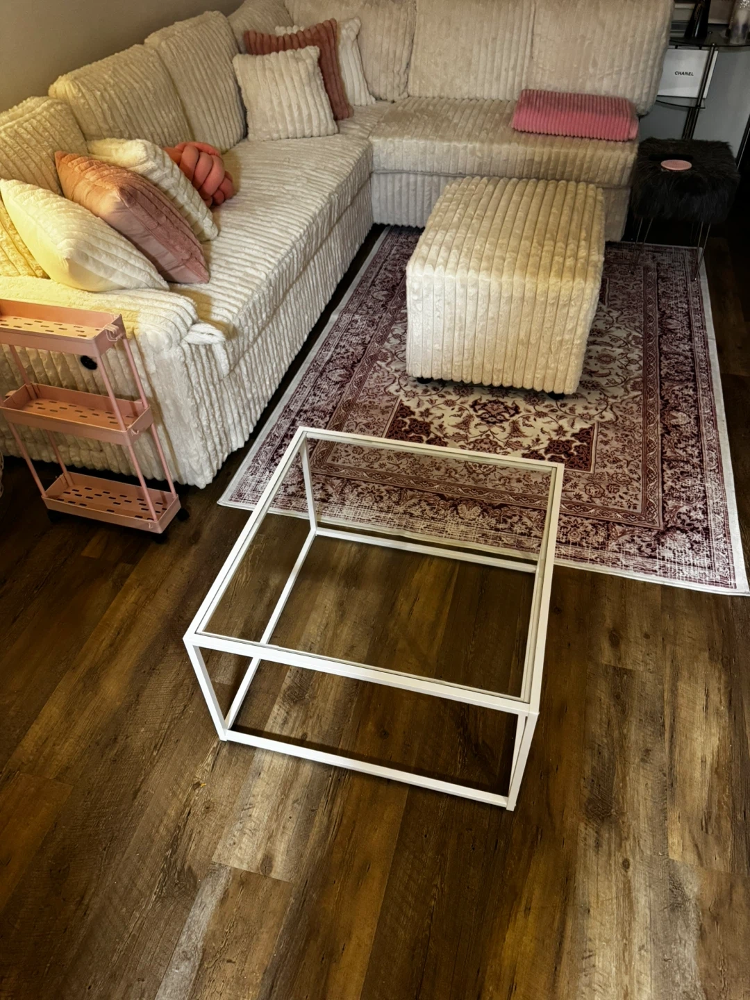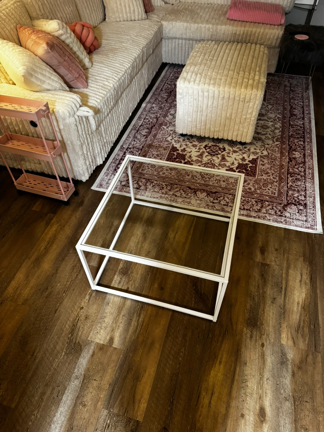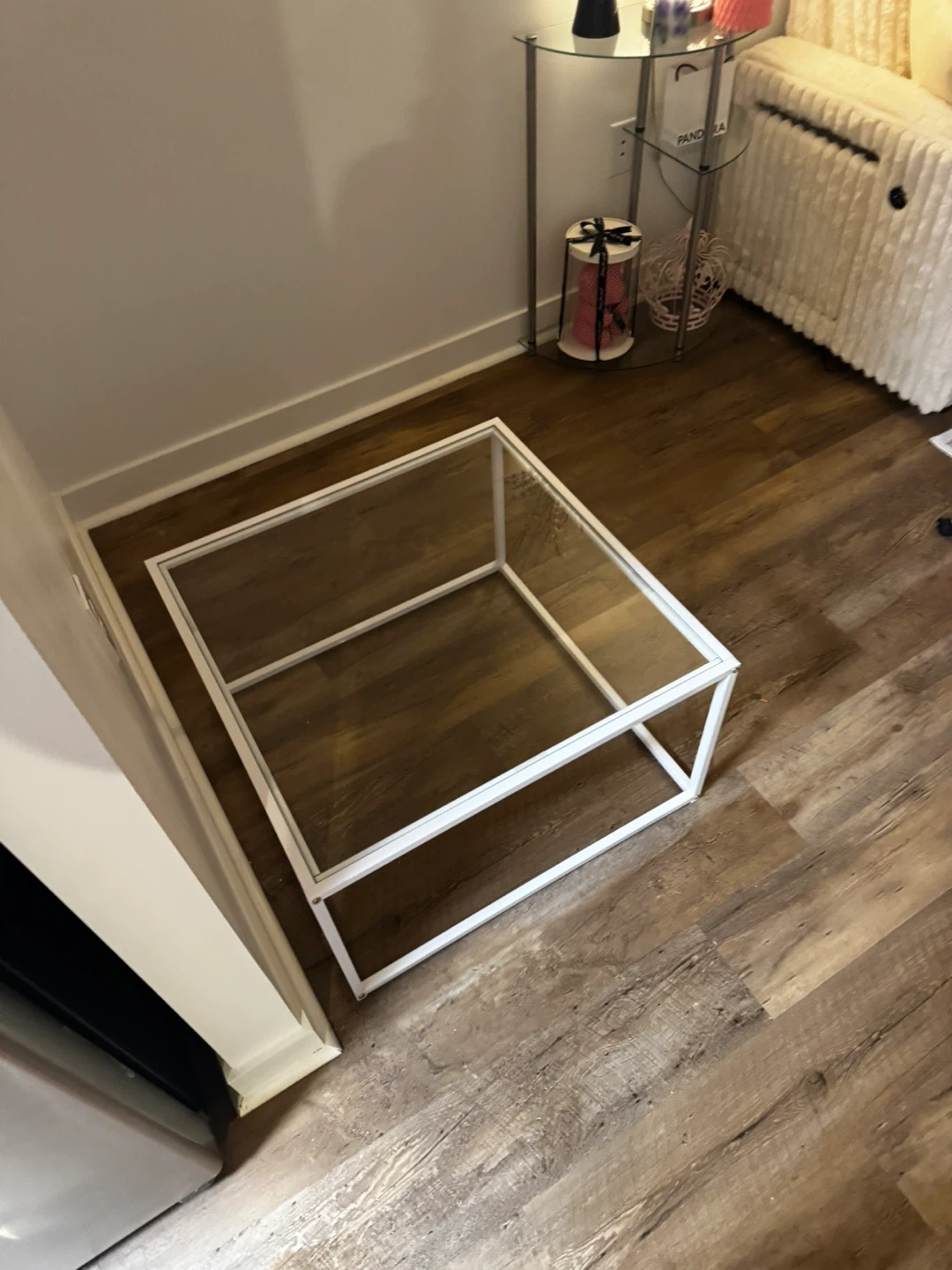Selling a modern glass top coffee table with a clean white frame! It's in great condition and ready to add a stylish touch to your living room. Perfect for displaying decor or enjoying your morning coffee