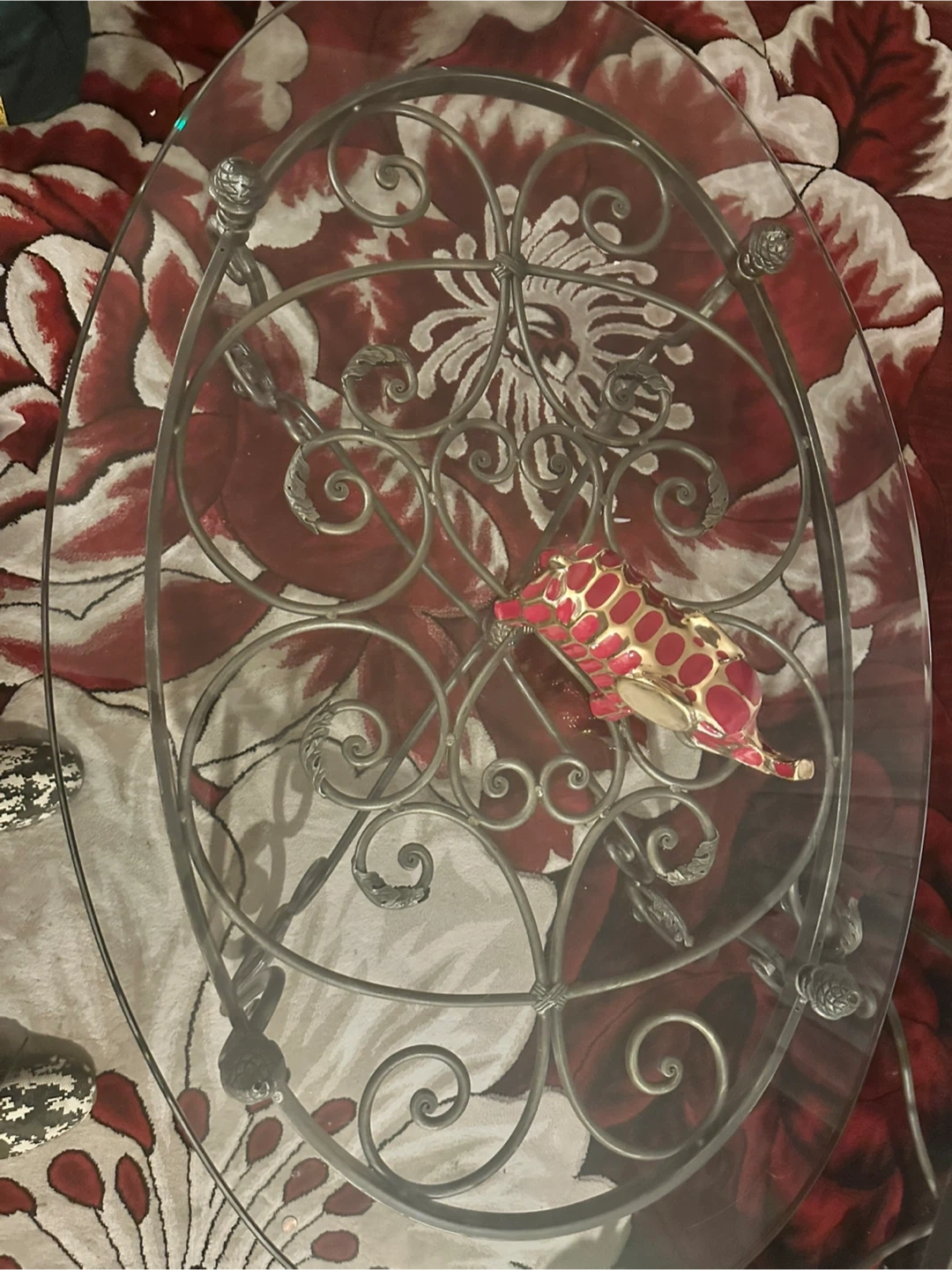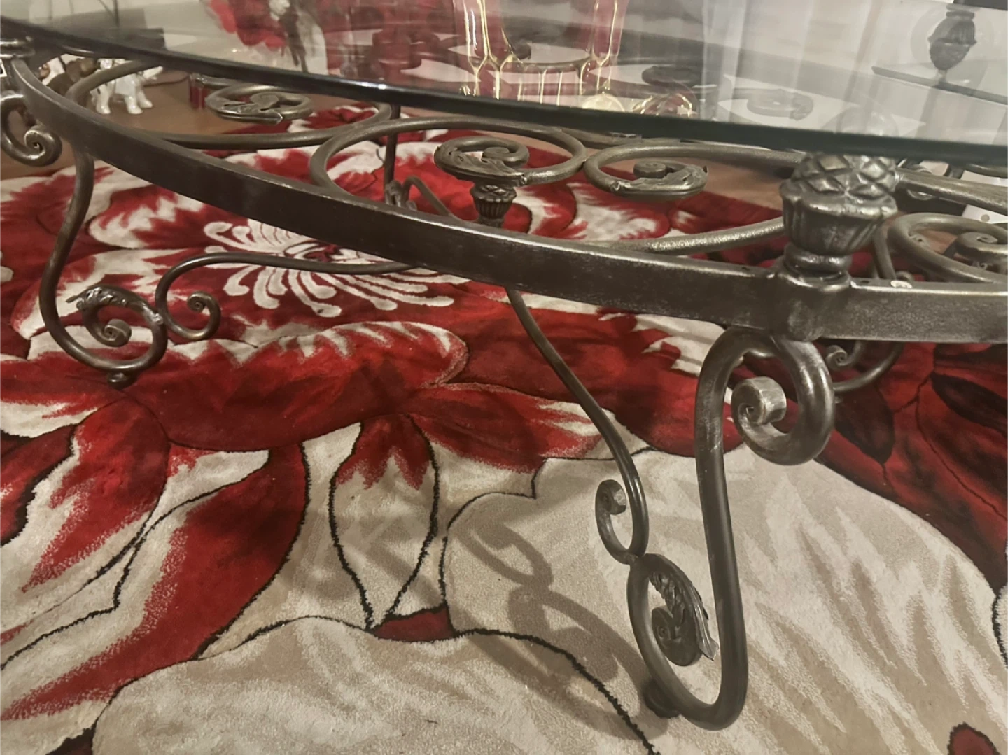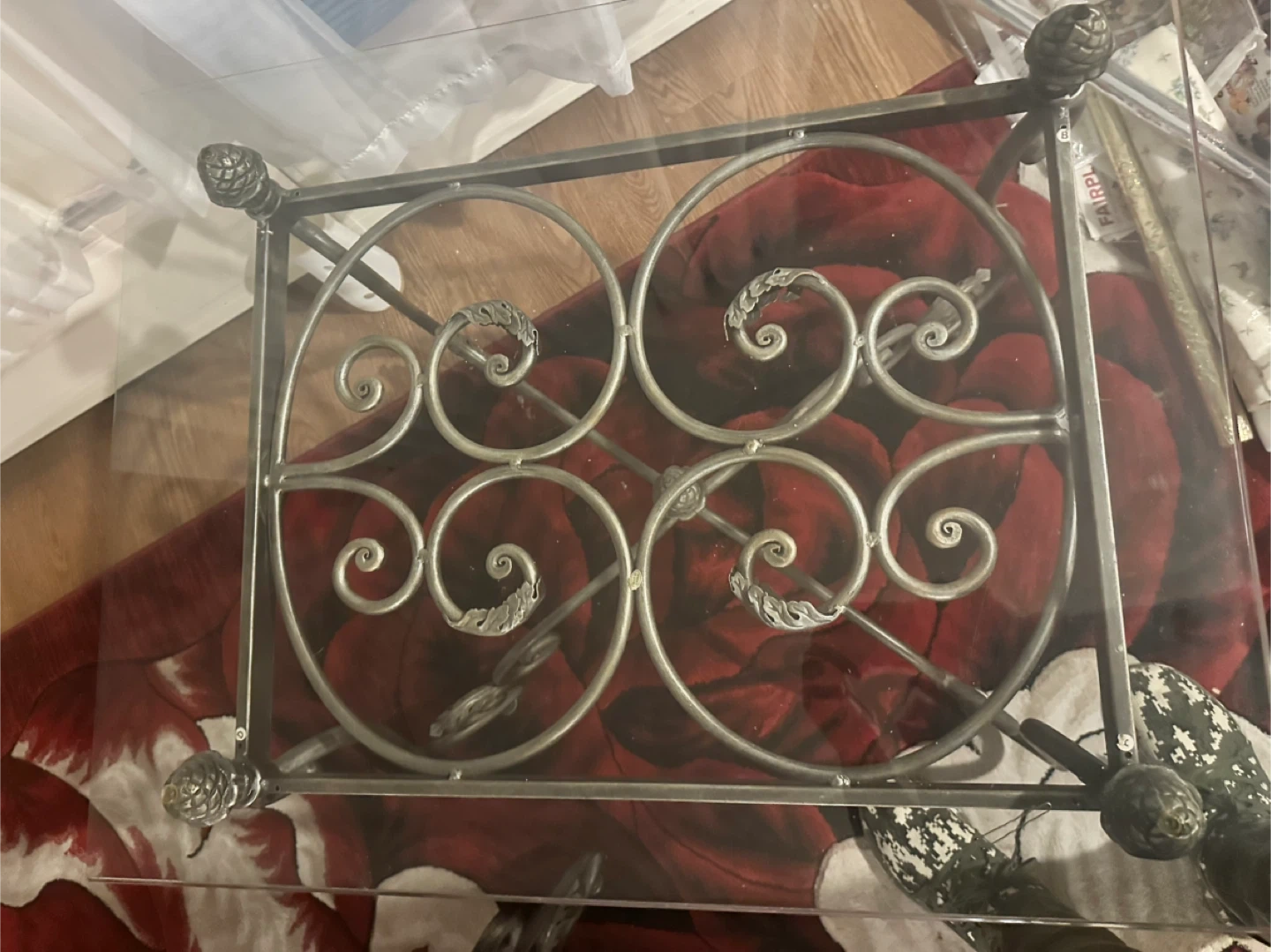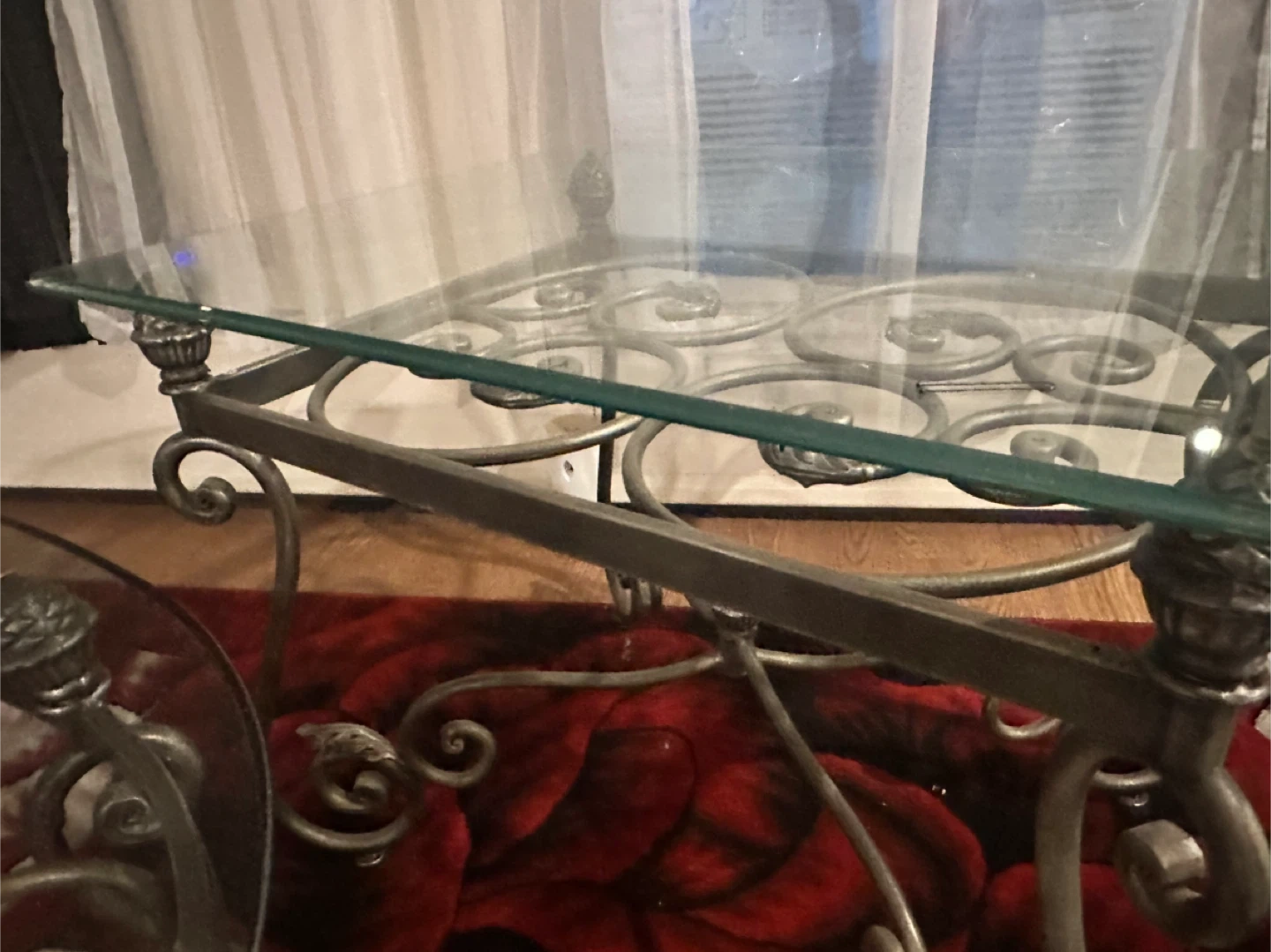 15Selling a glass top coffee table with a decorative metal frame and two side tables It has a unique design with swirling patterns and ornate details on the legs. The glass top is in good condition, and the metal frame is sturdy and stylish. It would be a great addition to any living room!